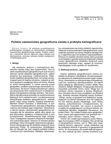 Polski Przegląd Kartograficzny Tom 33, 2001, nr 1, s. 10–23 MACIEJ ZYCH Warszawa Polskie nazewnictwo geograficzne świata a praktyka kartograficzna Z a r y s t r e ś c i. W artykule przedstawiono problematykę związaną ze stosowaniem polskiego nazewnictwa geograficznego świata. Podano definicje i znaczenie terminu egzonim, jego rodzaje oraz zastosowanie, kończąc zarysem kwestii związanych z transkrypcją nazw. 1. Wstęp Jak wiadomo, jednym z ważniejszych elementów każdej mapy jest nazewnictwo. Ono to obok współrzędnych geograficznych (lub innych) stanowi cechę obiektów geograficznych, zatem powinno być poprawne i jednoznaczne. Większość obiektów geograficznych ma swoje nazwy, czasami jest ich więcej niż jedna, czasami w różnych językach występują różne ich formy. Stawia to przed kartografem, a nawet szerzej przed geografem, problem poprawnego stosowania nazewnictwa. Na forum międzynarodowym zaleca się stosowanie form nazewniczych w oficjalnym języku (lub językach) danego obszaru. Tak pomyślana standaryzacja pozwala na wyeliminowanie błędnych form nazewniczych i na jednoznaczną identyfikację obiektów geograficznych. Jednak języki mają swoją historię, będącą odzwierciedleniem historii narodów, a słownictwo, w tym i nazewnictwo geograficzne, jest jego integralną częścią stanowiącą jego bogactwo. Stosowane w danym języku nazewnictwo geograficzne odnoszące się do obszarów, gdzie dany język nie jest stosowany, świadczy o historycznych z nimi powiązaniach. Wyeliminowanie tego rodzaju nazw i zastąpienie nazwami oficjalnymi niewątpliwie zubożyłoby język. Dotyczy to również języka polskiego, który ma bogate nazewnictwo geograficzne odnoszące się do obiektów leżących poza granicami Polski. To nazewnictwo, kształtujące się od kilkuset lat, jest częścią polskiej kultury i powinno być zachowane. Niestety, obserwuje- my zmniejszanie się liczby polskich egzonimów. Obecnie w opracowaniach kartograficznych coraz częściej używane są nazwy oficjalne danego kraju, a zapomina się o ich polskich odpowiednikach. Dotyczy to niestety również szkoły, która przecież w szczególny sposób powinna traktować polskie nazwy geograficzne obiektów leżących poza granicami naszego kraju, wpajać je uczniom, zapobiegając w ten sposób ich wymieraniu. 2. Definicja terminu „egzonim” Nazwy obiektów geograficznych można podzielić na oficjalne i nieoficjalne. Do pierwszej grupy zaliczamy te zatwierdzone przez organ nazewniczy i stosowane na obszarze jego kompetencji, czyli tzw. endonimy standaryzowane. Do takich nazw należą np. Warszawa, London, Malta, New Zealand, België i Belgique. Drugą grupę stanowią wszystkie pozostałe formy nazw. Mogą być to zarówno nazwy używane w języku oficjalnym, lecz różniące się od nazw przyjętych za oficjalne (np. Kudowa zamiast oficjalnej nazwy Kudowa-Zdrój), nazwy w językach lub dialektach występujących na danym obszarze, lecz nie mających na nim statusu języka oficjalnego, czyli nazwy lokalne, autochtoniczne i mniejszościowe, np. kaszubskie Kaszëbë, lub nazwy w językach w ogóle nie występujących na danym terenie, np. niemieckie Moskau, angielskie Damascus, czy polski Pekin. Ten ostatni rodzaj nazw geograficznych zwany jest egzonimami (od greckich éx‘ = zewnątrz, poza i ónyma = nazwa, imię). Termin ten został wprowadzony przez Marcelego Aurousseau (1957) w książce The rendering of geographical names. Już w 1962 roku wyjaśnienie terminu „egzonim” cytuje dokładnie wg tej publikacji słownik A glossary of geographical terms. M. Aurousseau nie podał definicji egzonimu, lecz opisuje go jako „nazwę używaną w ję- Polskie nazewnictwo geograficzne świata a praktyka kartograficzna zyku angielskim dla pozostałych części świata i obiektów geograficznych znajdujących się poza Wielką Brytanią” (A glossary..., 1962, s. 185). Jednak zarówno w książce M. Aurousseau, jak i w A glossary of geographical terms pojawia się również termin „nazwa konwencjonalna”, który można tłumaczyć również jako nazwę zwyczajową, objaśniony w następujący sposób: „Wiele miejsc w różnych częściach świata, gdzie nie używa się języka angielskiego, jest znanych nam pod nazwami nie używanymi przez ludzi zamieszkujących te miejsca. Krzyżowcy sprowadzili nam nazwę Cairo wziętą od Wenecjan. Stolicę Danii nazywamy Copenhagen, gdyż duńska jej nazwa København jest dla nas zbyt trudna do wymówienia, a z jej niemiecką formą Kopenhagen możemy poradzić sobie z łatwością, choć wymawiamy ją niezbyt precyzyjnie. Podobne nazwy, zapożyczone przez język angielski ze źródeł zagranicznych, które są ponadto źródłami zagranicznymi również w stosunku do miejsca, którego dotyczą, lub zapożyczone od nazw w języku niegdyś w tych miejscach używanym, zwane są nazwami konwencjonalnymi” (A glossary..., 1962, s. 128). Egzonimem jest więc według M. Aurousseau każda nazwa obiektu geograficznego leżącego poza obszarem danego kraju, a nazwy w językach nie występujących na danym obszarze są nazwami konwencjonalnymi. Według piętnastotomowego Meyers Grossers Universallexikon (1981) „egzonim jest to nazwa różniąca się od nazwy urzędowej, w różnych krajach przyjmująca różną formę, jak np. dla nazw miejscowości: niemieckie Mailand dla Milano, angielskie Munich dla München” (t. 4, s. 562). Warto nadmienić, że jest to jedyna spośród wielkich encyklopedii wyjaśniająca to pojęcie. Termin „egzonim” pojawia się również w Słowniku geograficznym angielsko-polskim (Z. Ciętak, S. Pietkiewicz 1974). W publikacji tej angielski „exonym” jest przetłumaczony jako „nazwa (geogr.) obcego obiektu.” Dodatkowo w słowniku tym błędnie objaśniono termin „conventional name” jako „nazwa urzędowa, nazwa książkowa”, gdy tymczasem w języku angielskim uważany był on wtedy za synonim egzonimu. Spr