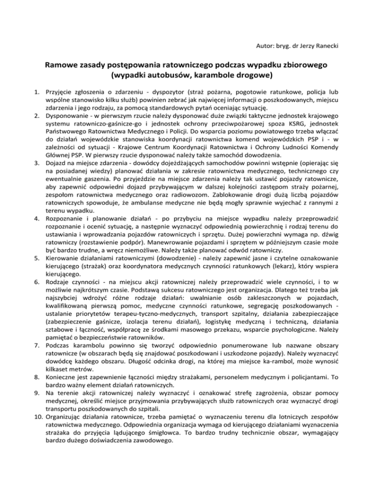 Autor: bryg. dr Jerzy Ranecki Ramowe zasady postępowania ratowniczego podczas wypadku zbiorowego (wypadki autobusów, karambole drogowe) 1. Przyjęcie zgłoszenia o zdarzeniu - dyspozytor (straż pożarna, pogotowie ratunkowe, policja lub wspólne stanowisko kilku służb) powinien zebrać jak najwięcej informacji o poszkodowanych, miejscu zdarzenia i jego rodzaju, za pomocą standardowych pytań oceniając sytuację. 2. Dysponowanie - w pierwszym rzucie należy dysponować duże związki taktyczne jednostek krajowego systemu ratowniczo-gaśnicze-go i jednostek ochrony przeciwpożarowej spoza KSRG, jednostek Państwowego Ratownictwa Medycznego i Policji. Do wsparcia poziomu powiatowego trzeba włączać do działań wojewódzkie stanowiska koordynacji ratownictwa komend wojewódzkich PSP i - w zależności od sytuacji - Krajowe Centrum Koordynacji Ratownictwa i Ochrony Ludności Komendy Głównej PSP. W pierwszy rzucie dysponować należy także samochód dowodzenia. 3. Dojazd na miejsce zdarzenia - dowódcy dojeżdżających samochodów powinni wstępnie (opierając się na posiadanej wiedzy) planować działania w zakresie ratownictwa medycznego, technicznego czy ewentualnie gaszenia. Po przyjeździe na miejsce zdarzenia należy tak ustawić pojazdy ratownicze, aby zapewnić odpowiedni dojazd przybywającym w dalszej kolejności zastępom straży pożarnej, zespołom ratownictwa medycznego oraz radiowozom. Zablokowanie drogi dużą liczbą pojazdów ratowniczych spowoduje, że ambulanse medyczne nie będą mogły sprawnie wyjechać z rannymi z terenu wypadku. 4. Rozpoznanie i planowanie działań - po przybyciu na miejsce wypadku należy przeprowadzić rozpoznanie i ocenić sytuację, a następnie wyznaczyć odpowiednią powierzchnię i rodzaj terenu do ustawiania i wprowadzania pojazdów ratowniczych i sprzętu. Dużej powierzchni wymaga np. dźwig ratowniczy (rozstawienie podpór). Manewrowanie pojazdami i sprzętem w późniejszym czasie może być bardzo trudne, a wręcz niemożliwe. Należy także planować odwód ratowniczy. 5. Kierowanie działaniami ratowniczymi (dowodzenie) - należy zapewnić jasne i czytelne oznakowanie kierującego (strażak) oraz koordynatora medycznych czynności ratunkowych (lekarz), który wspiera kierującego. 6. Rodzaje czynności - na miejscu akcji ratowniczej należy przeprowadzić wiele czynności, i to w możliwie najkrótszym czasie. Podstawą sukcesu ratowniczego jest organizacja. Dlatego też trzeba jak najszybciej wdrożyć różne rodzaje działań: uwalnianie osób zakleszczonych w pojazdach, kwalifikowaną pierwszą pomoc, medyczne czynności ratunkowe, segregację poszkodowanych ustalanie priorytetów terapeu-tyczno-medycznych, transport szpitalny, działania zabezpieczające (zabezpieczenie gaśnicze, izolacja terenu działań), logistykę medyczną i techniczną, działania sztabowe i łączność, współpracę ze środkami masowego przekazu, wsparcie psychologiczne. Należy pamiętać o bezpieczeństwie ratowników. 7. Podczas karambolu powinno się tworzyć odpowiednio ponumerowane lub nazwane obszary ratownicze (w obszarach będą się znajdować poszkodowani i uszkodzone pojazdy). Należy wyznaczyć dowódcę każdego obszaru. Długość odcinka drogi, na której ma miejsce ka-rambol, może wynosić kilkaset metrów. 8. Konieczne jest zapewnienie łączności między strażakami, personelem medycznym i policjantami. To bardzo ważny element działań ratowniczych. 9. Na terenie akcji ratowniczej należy wyznaczyć i oznakować strefę zagrożenia, obszar pomocy medycznej, określić miejsce przyjmowania przybywających służb ratowniczych oraz wyznaczyć drogi transportu poszkodowanych do szpitali. 10. Organizując działania ratownicze, trzeba pamiętać o wyznaczeniu terenu dla lotniczych zespołów ratownictwa medycznego. Odpowiednia organizacja wymaga od kierującego działaniami wyznaczenia strażaka do przyjęcia lądującego śmigłowca. To bardzo trudny technicznie obszar, wymagający bardzo dużego doświadczenia zawodowego. 11. Na miejscu akcji należy zapewnić pomoc psychologiczną. Trzeba także zadbać o wsparcie psychologiczne dla rodzin ofiar i poszkodowanych. 12. Niezbędne jest określenie listy niebezpieczeństw (możliwość obsunięcia się pojazdu, przewrócenie się pojazdu, gazy trujące i wybuchowe, pożar, inne). Zagrożenia te trzeba mieć na względzie w trakcie działań ratowniczych. 13. W sztabie działań ratowniczych powinni znaleźć się przede wszystkim strażacy, przedstawiciele Państwowego Ratownictwa Medycznego oraz policjanci. Sztab jest organem doradczym kierującego działaniami ratowniczymi. W trakcie działań skład osobowy sztabu będzie poszerzany o przedstawicieli służb, inspekcji i straży, a także przedstawicieli zespołów zarządzania kryzysowego. 14. Konieczne jest uruchomienie procedury powoływania zespołów zarządzania kryzysowego na poziomie powiatowym, wojewódzkim i -w zależności od sytuacji - krajowym. 15. Do ich głównych zadań będzie należała ogólna ocena sytuacji, powiadamianie rodzin ofiar i poszkodowanych, a w razie potrzeby zapewnienie warunków socjalnych dla uczestników wypadku oraz przekazywanie bieżących informacji o skutkach wypadku i podjętych działaniach. Zakończenie działań ratowniczych 1. Zorganizować wsparcie psychologiczne dla ratowników (strażacy i pracownicy służby zdrowia) oraz policjantów biorących udział w działaniach ratowniczych. Ustalić, które osoby potrzebują takiego wsparcia. 2. Podsumować przebieg działań ratowniczych. 3. Przeanalizować przebieg działań ratowniczych w ramach doskonalenia zawodowego. 4. Ocenę i wnioski przedstawić władzom administracji publicznej.