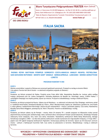 Biuro Turystyczno Pielgrzymkowe FRATER Adam Zielinski biuro: ul. Dworcowa 19, 85-009 Bydgoszcz, tel./fax 52 322 48 39, e-mail:[email protected] konto: Bank Millennium S.A. O/Bydgoszcz Nr: 76 1160 2202 0000 0000 4190 3630 Wpis do Rejestru Organizatorów Turystyki i Pośredników Turystycznych pod nr 16 NIP 967-035-11-14, REGON 093166900 www.frater.pl 15/12/13 ITALIA SACRA PADWA · RZYM · WATYKAN · POMPEJE · SORRENTO · COSTA AMAFLIA · AMALFI · NEAPOL · PIETRELCINA SAN GIOVANNI ROTONDO · MONTE SANT’ ANGELO · SERRACAPRIOLA · LANCIANO · MORZE ADRIATYCKIE · LORETO PROGRAM RAMOWY 9 DNI DZIEŃ 1 Zbiórka uczestników i wyjazd ze Złotowa we wczesnych godzinach porannych. Przejazd na nocleg na terenie Włoch. ( do wyboru Tarvisio lub Lido di Jesolo – w zależności od godziny wyjazdu ze Złotowa ) DZIEŃ 2 Śniadanie, po którym przejazd do Padwy. Przejście przez Prato della Valle. Nawiedzimy Bazylikę św. Justyny, gdzie według tradycji, pochowany jest św. Łukasz Ewangelista. Starówką dojdziemy do Bazyliki św. Antoniego, zwaną „Cudem Padwy” z sarkofagiem Świętego oraz kaplicą polską. Spacer po mieście. Przejazd na obiadokolację i nocleg w okolicach Rzymu. DZIEŃ 3 Śniadanie, po którym przejazd do Rzymu. Udamy się od Watykanu – w zależności od obecności Ojca Świętego, weźmiemy udział w modlitwie Anioł Pański. Zwiedzanie Bazyliki św. Piotra: „Pieta” Michała Anioła, kaplica św. Sebastiana z grobem św. Jana Pawła II, ołtarz główny z baldachimem Berniniego. Zejście do grot watykańskich – miejsca pochówku papieży. Czas wolny. Nawiedzimy Bazylikę Santa Maria Maggiore, poświęconą św. Marii z Nazaretu. Powrót na obiadokolację i nocleg. DZIEŃ 4 Śniadanie, po którym udamy się do Pompei – miasta, które 24 sierpnia 79 r. zostało zasypane na kilkanaście stuleci ponad pięciometrową warstwą pyłu wulkanicznego, który zachował obraz starożytnych Pompei sprzed katastrofy. Zwiedzając Pompeje zobaczymy liczne świątynie, fora, teatr oraz domy mieszkalne. Nawiedzimy sanktuarium Matki Bożej Różańcowej, którego konsekracja nastąpiła w 1892 r. Już dwa lata później sanktuarium zostało wyniesione do rangi bazyliki mniejszej, a 4 maja 1901 r. papież Leon XIII ogłosił świątynię Sanktuarium Papieskim. Kontynuacja podróży do Sorrento. Spacer po XV-wiecznym centrum miasta – jednym z ładniejszych kurortów Italii. Czas wolny na plażowanie w Sorrento. Obiadokolację i nocleg w okolicach Sorrento. Biuro Turystyczno Pielgrzymkowe FRATER Adam Zielinski biuro: ul. Dworcowa 19, 85-009 Bydgoszcz, tel./fax 52 322 48 39, e-mail:[email protected] konto: Bank Millennium S.A. O/Bydgoszcz Nr: 76 1160 2202 0000 0000 4190 3630 Wpis do Rejestru Organizatorów Turystyki i Pośredników Turystycznych pod nr 16 NIP 967-035-11-14, REGON 093166900 www.frater.pl 15/12/13 DZIEŃ 5 Śniadanie. Przejazd wzdłuż Costa Amaflia, uznanym za jedno z najpiękniejszych wybrzeży świata do Amalfi – nawiedzimy arcydzieło sztuki – Katedrę PW Św. Andrzeja Apostoła z relikwiami Świętego. Przejazd do Neapolu – spacer po mieście połączony ze zwiedzaniem. Zobaczymy Zamek Nowy, Zamek Jajeczny, Galerię Umberto I oraz Katedrę Św. Januarego, patrona miasta. Z Neapolu podążać będziemy w kierunku wschodnim przemierzając masyw apeniński do Pietrelciny – miejsca narodzin i młodości Ojca Pio. Zobaczymy Plac Zwiastowania, dom rodzinny Świętego oraz kościół Św. Anny, w którym został ochrzczony. Przejdziemy także pod drzewo na Piana Romana, pod którym otrzymał pierwsze, niewidzialne stygmaty. Przejazd na obiadokolację i nocleg do San Giovanni Rotondo. DZIEŃ 6 Śniadanie. Pobyt w San Giovanni Rotondo – nawiedzenie sanktuarium św. Ojca Pio – miejsca, w którym Święty spędził większość życia. Udamy się do świątyni klasztornej Matki Bożej Łaskawej, w której o. Pio otrzymał stygmaty. Przejście do starej części klasztornej, gdzie znajduje się muzeum, a w nim cela Świętego. Nawiedzimy nowy kościół, w którym wystawione jest w kryształowej trumnie ciało o. Pio – czas na modlitwę i zadumę. Przejazd do Monte Sant’ Angelo – miejsca, które dało początek kultowi św. Michała Archanioła. Modlitwa w grocie św. Michała Archanioła. Przejazd na obiadokolację i nocleg. DZIEŃ 7 Śniadanie, po którym udamy się do Serracapriola. W wybudowanym w XVI w konwencie kapucyńskim przeżywał swój nowicjat Brat Pio, przyszły święty stygmatyk i jeden z największych wspomożycieli w walce ze złem. Także tutaj, w wieku XVI i XVII w. posługiwał inny wielki egzorcysta i gigant w walce ze złem, uzdrawiający wielu z opętania także do dziś – Ojciec Matteo d’Agnone, którego doczesne szczątki złożono w prezbiterium tutejszego kościoła. Msza Święta, po której przejazd do Lanciano – nawiedzimy miejsce pierwszego potwierdzonego Cudu Eucharystycznego. W VIII stuleciu, podczas odprawiania Mszy św. przez mnicha bazyliańskiego, po dokonanej konsekracji, hostia stała się Ciałem, a wino przemieniło się w żywą Krew, krzepnąc w pięć nierównych i różnych, co do kształtu i wielkości grudek. Modlitwa i zaduma przed Relikwiami Ciała i Krwi Pańskiej w kościele św. Franciszka. Napełnieni niezwykłymi przeżyciami nawiedzonych miejsc udamy się na plażę nad Adriatykiem, aby zaczerpnąwszy morskiej bryzy zrelaksować się nieco. Przejazd na obiadokolację i nocleg w okolice Loreto. DZIEŃ 8 Śniadanie. Przejazd do Loreto – nawiedzenie sanktuarium św. Domku. Udamy się na plac Madonny, zobaczymy pałace: Apostolski i Iliryjski, piękną fontannę oraz dzwonnicę. We wnętrzu bazyliki nawiedzimy św. Domek, a także liczne kaplice w tym kaplicę polską z freskami A. Gatti przedstawiającymi religijno-patriotyczne epizody z historii Polski oraz w centrum ołtarz ku czci Najświętszego Serca Jezusowego. Przejazd na obiadokolację i nocleg w okolicach Tarvisio. DZIEŃ 9 Śniadani