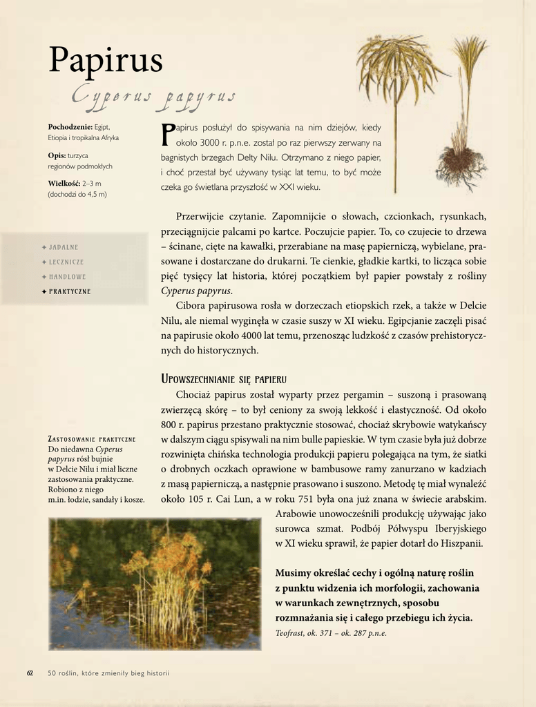 Papirus Cyperus papyrus Pochodzenie: Egipt, Etiopia i tropikalna Afryka Opis: turzyca regionów podmokłych Wielkość: 2–3 m (dochodzi do 4,5 m) P apirus posłużył do spisywania na nim dziejów, kiedy około 3000 r. p.n.e. został po raz pierwszy zerwany na bagnistych brzegach Delty Nilu. Otrzymano z niego papier, i choć przestał być używany tysiąc lat temu, to być może czeka go świetlana przyszłość w XXI wieku. Przerwijcie czytanie. Zapomnijcie o słowach, czcionkach, rysunkach, przeciągnijcie palcami po kartce. Poczujcie papier. To, co czujecie to drzewa – ścinane, cięte na kawałki, przerabiane na masę papierniczą, wybielane, prasowane i dostarczane do drukarni. Te cienkie, gładkie kartki, to licząca sobie pięć tysięcy lat historia, której początkiem był papier powstały z rośliny Cyperus papyrus. Cibora papirusowa rosła w dorzeczach etiopskich rzek, a także w Delcie Nilu, ale niemal wyginęła w czasie suszy w XI wieku. Egipcjanie zaczęli pisać na papirusie około 4000 lat temu, przenosząc ludzkość z czasów prehistorycznych do historycznych. jadalne lecznicze handlowe praktyczne Upowszechnianie Zastosowanie praktyczne Do niedawna Cyperus papyrus rósł bujnie w Delcie Nilu i miał liczne zastosowania praktyczne. Robiono z niego m.in. łodzie, sandały i kosze. się papieru Chociaż papirus został wyparty przez pergamin – suszoną i prasowaną zwierzęcą skórę – to był ceniony za swoją lekkość i elastyczność. Od około 800 r. papirus przestano praktycznie stosować, chociaż skrybowie watykańscy w dalszym ciągu spisywali na nim bulle papieskie. W tym czasie była już dobrze rozwinięta chińska technologia produkcji papieru polegająca na tym, że siatki o drobnych oczkach oprawione w bambusowe ramy zanurzano w kadziach z masą papierniczą, a następnie prasowano i suszono. Metodę tę miał wynaleźć około 105 r. Cai Lun, a w roku 751 była ona już znana w świecie arabskim. Arabowie unowocześnili produkcję używając jako surowca szmat. Podbój Półwyspu Iberyjskiego w XI wieku sprawił, że papier dotarł do Hiszpanii. usimy określać cechy i ogólną naturę roślin M z punktu widzenia ich morfologii, zachowania w warunkach zewnętrznych, sposobu rozmnażania się i całego przebiegu ich życia. Teofrast, ok. 371 – ok. 287 p.n.e. 62 50 roś l i n , k t ór e z mi e n i ły b ie g hist o r ii W tym samym roku kiedy Arabowie wycofali się do Afryki Północnej, Krzysztof Kolumb wyruszył w podróż do Ameryki, gdzie meksykańscy Aztekowie i Toltekowie wyrabiali papier z kory drzew. (Papier z kory był produkowany w stanie Puebla jeszcze w 2000 roku). Podobnie jak w przypadku papirusu, w masie papierniczej głównym składnikiem jest celuloza. Występuje ona w ściankach komórek roślinnych nadając M a s a p a p i r u s o w a im sztywność i sprężystość. Cai Lun dokonując swojego odkrycia mógł inspi- Papirus wytwarzano z łodyg trzciny papirusowej rować się widokiem os przeżuwających celulozę i budujących z niej gniazdo. (cibory papirusowej). Długie Francuski naukowiec René de Réaumur musiał wiedzieć, z czego zbudowane paski kładziono obok siebie, a następnie układano drugą jest le guêpier, gniazdo os, kiedy w 1719 roku wymyślił, że szmaty można by warstwę w poprzek. Obie zastąpić drewnem, gdyby tylko udało się znaleźć sposób na rozdrobnienie go. warstwy ściskano do uzyskania jednolitego W 1843 roku Saksończyk Friedrich Gottlob Keller opracował metodę wytwa- arkusza, który był rzania masy drzewnej, a 12 lat później Mellier Watt opatentował metodę che- następnie wygładzany. micznego rozwłókniania drewna. W latach 60. XX wieku pisarze pisali takie historie jak ta, stukając w klawisze maszyn do pisania i zużywając ryzy papieru. Potem wszystkie te mądre słowa uwięzione na kartce papieru były drukowane na wielkich belach papieru gazetowego. Mniej więcej 50 lat temu pojawiły się klawiatury komputerowe i cyfrowe przesyłanie danych, co sprawiło, że cały wielki przemysł prasowy i wydawniczy czeka niepewna przyszłość. Mimo to, wraz z pojawieniem się poczty elektronicznej, w niektórych krajach zużycie papieru wzrosło o 40 %. Statystycznie rzecz ujmując, przeciętny Amerykanin zadrukowuje rocznie równowartość dziewięciu dużych sosen. Indonezja, zajmująca drugie S zkoła myślenia w świecie miejsce pod względem bioróżnorodności, wy cięła już 75% swoich zasobów leśnych, głównie na potrzeby Teofrast żył w Eresos na greckiej produkcji papieru. Istnieją dwa sposoby rozwiązania tego wyspie Lesbos w latach ok. 371 – problemu: pierwszy to zwiększenie zakresu recyklingu, ok. 287 p.n.e. Był filozofem i płodnym a drugi – pozyskiwanie lokalnych surowców do produkcji pisarzem, chociaż do naszych czasów papieru. Łączenie papieru uzyskanego w ramach recyprzetrwały tylko nieliczne jego dzieła, m.in. Badania nad roślinami oraz klingu z materiałami niedrzewnymi pozwoliłoby uratować Przyczyny powstawania roślin, dzięki dużą część lasów. Do produkcji papieru nadają się niemal którym zyskał sobie tytuł ojca botaniki. wszystkie rośliny włókniste, od bambusa, przez konopie, Zmarł w 287 r. p.n.e. włókna trzciny cukrowej (odpad po produkcji cukru trzci„Umieramy, kiedy dopiero nowego), po kukurydzę i słomę ryżową, a także papirus. rozpoczynamy życie”, napisał. Papi rus 63