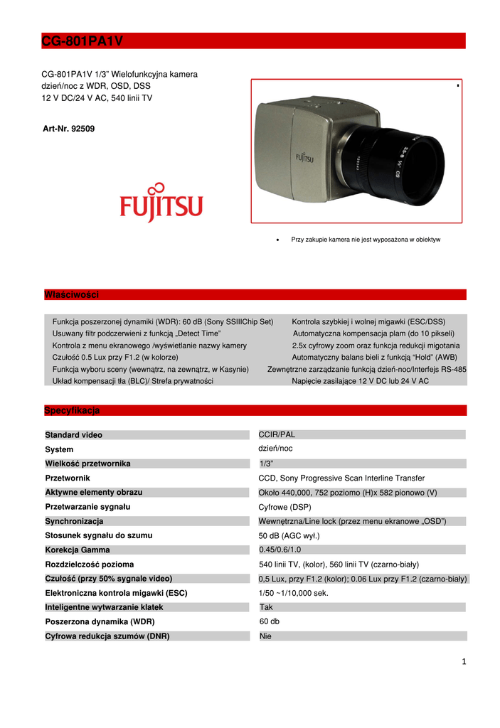 CG-801PA1V CG-801PA1V 1/3” Wielofunkcyjna kamera dzień/noc z WDR, OSD, DSS 12 V DC/24 V AC, 540 linii TV Art-Nr. 92509 • Przy zakupie kamera nie jest wyposażona w obiektyw Właściwości Funkcja poszerzonej dynamiki (WDR): 60 dB (Sony SSIIIChip Set) Kontrola szybkiej i wolnej migawki (ESC/DSS) Usuwany filtr podczerwieni z funkcją „Detect Time” Automatyczna kompensacja plam (do 10 pikseli) Kontrola z menu ekranowego /wyświetlanie nazwy kamery 2.5x cyfrowy zoom oraz funkcja redukcji migotania Czułość 0.5 Lux przy F1.2 (w kolorze) Funkcja wyboru sceny (wewnątrz, na zewnątrz, w Kasynie) Automatyczny balans bieli z funkcją “Hold” (AWB) Zewnętrzne zarządzanie funkcją dzień-noc/Interfejs RS-485 Układ kompensacji tła (BLC)/ Strefa prywatności Napięcie zasilające 12 V DC lub 24 V AC Specyfikacja Standard video CCIR/PAL System dzień/noc Wielkość przetwornika 1/3” Przetwornik CCD, Sony Progressive Scan Interline Transfer Aktywne elementy obrazu Około 440,000, 752 poziomo (H)x 582 pionowo (V) Przetwarzanie sygnału Cyfrowe (DSP) Synchronizacja Wewnętrzna/Line lock (przez menu ekranowe „OSD”) Stosunek sygnału do szumu 50 dB (AGC wył.) Korekcja Gamma 0.45/0.6/1.0 Rozdzielczość pozioma 540 linii TV, (kolor), 560 linii TV (czarno-biały) Czułość (przy 50% sygnale video) 0,5 Lux, przy F1.2 (kolor); 0.06 Lux przy F1.2 (czarno-biały) Elektroniczna kontrola migawki (ESC) 1/50 ~1/10,000 sek. Inteligentne wytwarzanie klatek Tak Poszerzona dynamika (WDR) 60 db Cyfrowa redukcja szumów (DNR) Nie 1 CG-801PA1V (Specyfikacja cd) Automatyczna kontrola wzmocnienia (AGC) Wł./wył. przełączane (przez menu ekranowe „OSD”) Kompensacja tylnego oświetlenia BLC, WDR, wł./wył. przełączane (przez menu ekranowe „OSD”) Balans bieli (AWB) Auto/hold/wewnątrz (około 2800 K), na zewnątrz (około 6000 K), wybierane z menu ekranowego „OSD” Kompensacja plam (blemish compensation) Automatyczna detekcja plam oraz kompensacja (do 10 pikseli) Funkcja redukcji migotania Wł./wył. (przez menu ekranowe „OSD”) System ulepszania jakości obrazu na krawędziach jego elementów (APC) Poziomy i pionowy Przełączany filtr podczerwieni Tak Dopełniający balans kolorów (WCCB) Zbalansowanie różnicy temperatury kolorów pomiędzy obszarami o najw. Strefy prywatności Do 8 obszarów Obsługa z użyciem menu ekranowego OSD WDR, DSS, dzień/noc, E-Zoom, BLC, AWB, WCCB, AGC, redukcja migotania, strefy prywatności Ustawianie parametrów funkcji przez menu ekranowe Ustawianie adresów, ilości bitów/sek., LED/OSD wł./wył. Wyświetlanie nazwy kamery Tekst wprowadzany przez menu ekranowe “OSD” Funkcja detekcji ruchu Jest Typ montażu obiektywu Gwint CS Cyfrowy Zoom 1.5, 2.0, 2.5x (wybierane z menu ekranowego „OSD”) Stosowane sposoby kontroli przesłony Ręczna przesłona, kontrolowana napięciem DC Zewnętrzna regulacja Regulacja ogniskowej od podstawy obiektywu czterema przyciskami, RS-485 z terminacj¹ w³./wy³. Typy wyjść video CVBS, VBS Wyjścia video 1Vp-p, (C)VBS, 75 ohmów, BNC Zewnętrzne przyłącza Gniazdo DC do przesłony (4-pin), video (BNC), wejście zasilania, interfejs RS-485 Szeregowe interfejsy RS-485, protokół: PelcoD Montaż kamery Otwór z gwintem ¼”-20 UNC u góry i u dołu Napięcie zasilające 12 V DC, 24 V AC, (+/-15%) 50 Hz Pobór mocy Około 4.7 wat przy 12 V DC, 6.5 wat przy 24 V AC Zakres temperaturowy pracy -10° ~+50°C Wymiary (wys. x szer. x głęb.) Patrz rysunek Kolor Podobny do RAL7048 200 g i najm. luminancji (wł./wył. przełączane przez menu ekranowe „OSD”) Waga Wyposażenie Wtyczka 4-pinowa, płyta CD z oprogramowaniem do zdalnego zarządzania, Instrukcja Certyfikaty CE Wybrane akcesoria opcjonalne 43238 F03Z2.710DC-NFS F1.0/3-8 mm obiektyw DC, zmienno-ogniskowy, bez przesunięcia ogniskowej, gwint 1/3” CS 77773 VT-PS12DCDT1 Jednostka zasilająca 12 V DC/1.0 A, regulowana, wersja biurkowa, kable o dł. 1.8 m, z niezarobionymi końcami 45246 YV5X2.7R4B-SA2L F1.3/2.7-13.5 mm obiektyw DC, zmienno-ogniskowy, bez przesunięcia ogniskowej, gwint 1/3” CS 2 CG-801PA1V Informacja o produkcie Podstawową zaletą kamery Fujitsu CG-801P jest przetwornik „Progressive Scan CCD”. Dzięki niemu kamera jest w stanie czytać aż 50 pełnych obrazów na sekundę w PAL. Poszerzenie dynamiki zostało osiągnięte poprzez oddzielenie przetwarzania dwóch pełnych obrazów dla dwóch oddzielnych parametrów ekspozycji. Innymi słowy, regulowana przesłona obiektywu DC odpowiada za ekspozycję ciemniejszych fragmentów obrazu pierwszej ramki, podczas gdy krótka migawka jest używana do jaśniejszych fragmentów obrazu drugiej ramki. Te dwa obrazy skanowane przez przetwornik „Progressive Scan”, mogą być oddzielnie naświetlone, nawet bez użycia obiektywu DC. Jedna z migawek kamery odpowiada za jasne strefy obrazu, podczas gdy druga migawka „chipu” SS3TM, zapewnia optymalną ekspozycję ciemnych stref obrazu. W dalszej kolejności obydwa optymalnie naświetlone pełne obrazy są łączone w jeden pełny obraz video. Zastosowanie najnowszego „chip setu” Sony SS3TM, z którego korzysta także kamera Fujitsu CG-801P, daje wynik w postaci znacznej poprawy czułości. Mianowicie chodzi o polepszenie charakterystyk WDR, co oznacza poszerzenie zakresu dynamiki. Rezultaty są imponujące. Po przeprowadzeniu wielu testów, z dumą oznajmiamy, iż nie udało się wytworzyć do tej pory sceny o tak ekstremalnych warunkach oświetleniowych, że nie poradziłby sobie z nią model Fujitsu WDR. Do konfiguracji z poziomu komputera PC oraz do uaktualnień oprogramowania zalecane jest stosowanie urządzenia EDC-CR1, które posiada interfejs RS-485. 3 CG-801PA1V Oficjalny Dystrybutor w Polsce ® Nowe Systemy i Technologie NSyTech Sp. z o.o. 00-367 Warszawa Ul.Kopernika 3 Tel: (22) 8287907 8287908 Fax: (22) 8287909 http://www.nsytech.pl e-mail: [email protected] 4 VIDEOR E. Hartig GmbH, Carl-Zeiss-Straße 8, 63322 Rödermark, Germany 