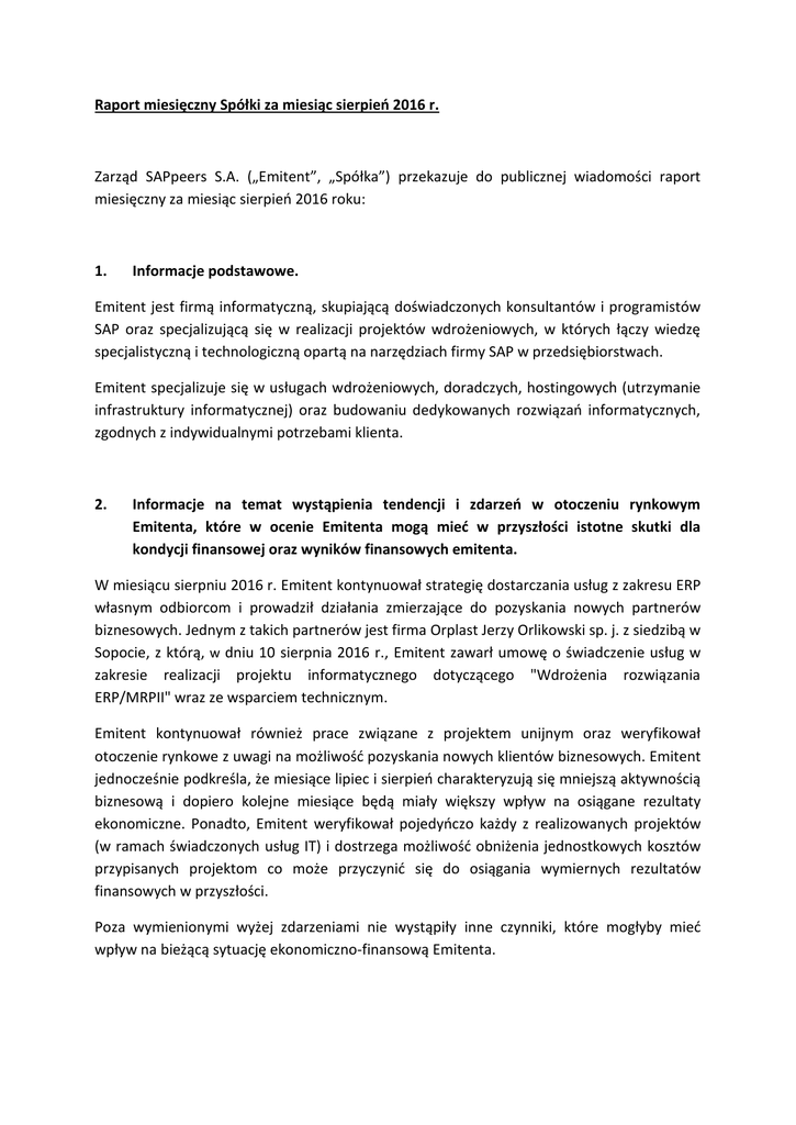Raport miesięczny Spółki za miesiąc sierpień 2016 r. Zarząd SAPpeers S.A. („Emitent”, „Spółka”) przekazuje do publicznej wiadomości raport miesięczny za miesiąc sierpień 2016 roku: 1. Informacje podstawowe. Emitent jest firmą informatyczną, skupiającą doświadczonych konsultantów i programistów SAP oraz specjalizującą się w realizacji projektów wdrożeniowych, w których łączy wiedzę specjalistyczną i technologiczną opartą na narzędziach firmy SAP w przedsiębiorstwach. Emitent specjalizuje się w usługach wdrożeniowych, doradczych, hostingowych (utrzymanie infrastruktury informatycznej) oraz budowaniu dedykowanych rozwiązań informatycznych, zgodnych z indywidualnymi potrzebami klienta. 2. Informacje na temat wystąpienia tendencji i zdarzeń w otoczeniu rynkowym Emitenta, które w ocenie Emitenta mogą mieć w przyszłości istotne skutki dla kondycji finansowej oraz wyników finansowych emitenta. W miesiącu sierpniu 2016 r. Emitent kontynuował strategię dostarczania usług z zakresu ERP własnym odbiorcom i prowadził działania zmierzające do pozyskania nowych partnerów biznesowych. Jednym z takich partnerów jest firma Orplast Jerzy Orlikowski sp. j. z siedzibą w Sopocie, z którą, w dniu 10 sierpnia 2016 r., Emitent zawarł umowę o świadczenie usług w zakresie realizacji projektu informatycznego dotyczącego "Wdrożenia rozwiązania ERP/MRPII" wraz ze wsparciem technicznym. Emitent kontynuował również prace związane z projektem unijnym oraz weryfikował otoczenie rynkowe z uwagi na możliwość pozyskania nowych klientów biznesowych. Emitent jednocześnie podkreśla, że miesiące lipiec i sierpień charakteryzują się mniejszą aktywnością biznesową i dopiero kolejne miesiące będą miały większy wpływ na osiągane rezultaty ekonomiczne. Ponadto, Emitent weryfikował pojedyńczo każdy z realizowanych projektów (w ramach świadczonych usług IT) i dostrzega możliwość obniżenia jednostkowych kosztów przypisanych projektom co może przyczynić się do osiągania wymiernych rezultatów finansowych w przyszłości. Poza wymienionymi wyżej zdarzeniami nie wystąpiły inne czynniki, które mogłyby mieć wpływ na bieżącą sytuację ekonomiczno-finansową Emitenta. 3. Zestawienie wszystkich informacji opublikowanych przez Spółkę w trybie raportu bieżącego w okresie objętym raportem. Raporty bieżące i okresowe opublikowane w systemie EBI w sierpniu 2016 roku: Raport bieżący nr 19/2016 z 12.08.2016 r. Raport miesięczny za miesiąc lipiec 2016 r. Raport bieżący nr 20/2016 z 12.08.2016 r. Raport okresowy za II kwartał 2016 r. Raporty opublikowanie w systemie ESPI w sierpniu 2016 r.: Raport nr 3/2016 z 10.08.2016 r. Zawarcie umowy świadczenia usług IT z Orplast Raporty Emitenta są publikowane na bieżąco na stronie internetowej Spółki: www.sappeers.com, a także na stronach: www.newconnect.pl oraz www.gpwinfostrefa.pl. 4. Informacje na temat realizacji celów emisji, jeżeli taka realizacja, choćby w części, miała miejsce w okresie objętym niniejszym raportem. W sierpniu 2016 r. nie realizowano inwestycji ze środków pozyskanych z emisji akcji serii C. 5. Kalendarz inwestora, obejmujący wydarzenia mające mieć miejsce w nadchodzącym miesiącu, które dotyczą emitenta i są istotne z punktu widzenia interesów, w szczególności daty publikacji raportów okresowych, planowanych walnych zgromadzeń, otwarcia subskrypcji, spotkań z inwestorami lub analitykami oraz oczekiwany termin publikacji raportu analitycznego. Spółka planuje opublikowanie w terminie do dnia 14 października br. raportu miesięcznego opisującego dokonania Spółki we wrześniu 2016 r. Podstawa prawna: pkt. 16 „Dobre Praktyki Spółek Notowanych na NewConnect”