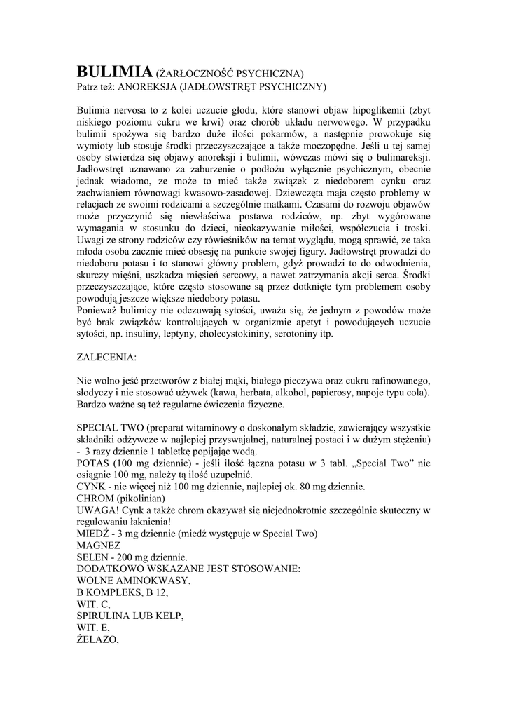 BULIMIA (śARŁOCZNOŚĆ PSYCHICZNA) Patrz teŜ: ANOREKSJA (JADŁOWSTRĘT PSYCHICZNY) Bulimia nervosa to z kolei uczucie głodu, które stanowi objaw hipoglikemii (zbyt niskiego poziomu cukru we krwi) oraz chorób układu nerwowego. W przypadku bulimii spoŜywa się bardzo duŜe ilości pokarmów, a następnie prowokuje się wymioty lub stosuje środki przeczyszczające a takŜe moczopędne. Jeśli u tej samej osoby stwierdza się objawy anoreksji i bulimii, wówczas mówi się o bulimareksji. Jadłowstręt uznawano za zaburzenie o podłoŜu wyłącznie psychicznym, obecnie jednak wiadomo, ze moŜe to mieć takŜe związek z niedoborem cynku oraz zachwianiem równowagi kwasowo-zasadowej. Dziewczęta maja często problemy w relacjach ze swoimi rodzicami a szczególnie matkami. Czasami do rozwoju objawów moŜe przyczynić się niewłaściwa postawa rodziców, np. zbyt wygórowane wymagania w stosunku do dzieci, nieokazywanie miłości, współczucia i troski. Uwagi ze strony rodziców czy rówieśników na temat wyglądu, mogą sprawić, ze taka młoda osoba zacznie mieć obsesję na punkcie swojej figury. Jadłowstręt prowadzi do niedoboru potasu i to stanowi główny problem, gdyŜ prowadzi to do odwodnienia, skurczy mięśni, uszkadza mięsień sercowy, a nawet zatrzymania akcji serca. Środki przeczyszczające, które często stosowane są przez dotknięte tym problemem osoby powodują jeszcze większe niedobory potasu. PoniewaŜ bulimicy nie odczuwają sytości, uwaŜa się, Ŝe jednym z powodów moŜe być brak związków kontrolujących w organizmie apetyt i powodujących uczucie sytości, np. insuliny, leptyny, cholecystokininy, serotoniny itp. ZALECENIA: Nie wolno jeść przetworów z białej mąki, białego pieczywa oraz cukru rafinowanego, słodyczy i nie stosować uŜywek (kawa, herbata, alkohol, papierosy, napoje typu cola). Bardzo waŜne są teŜ regularne ćwiczenia fizyczne. SPECIAL TWO (preparat witaminowy o doskonałym składzie, zawierający wszystkie składniki odŜywcze w najlepiej przyswajalnej, naturalnej postaci i w duŜym stęŜeniu) - 3 razy dziennie 1 tabletkę popijając wodą. POTAS (100 mg dziennie) - jeśli ilość łączna potasu w 3 tabl. „Special Two” nie osiągnie 100 mg, naleŜy tą ilość uzupełnić. CYNK - nie więcej niŜ 100 mg dziennie, najlepiej ok. 80 mg dziennie. CHROM (pikolinian) UWAGA! Cynk a takŜe chrom okazywał się niejednokrotnie szczególnie skuteczny w regulowaniu łaknienia! MIEDŹ - 3 mg dziennie (miedź występuje w Special Two) MAGNEZ SELEN - 200 mg dziennie. DODATKOWO WSKAZANE JEST STOSOWANIE: WOLNE AMINOKWASY, B KOMPLEKS, B 12, WIT. C, SPIRULINA LUB KELP, WIT. E, śELAZO, WIT. D, LECYTYNA. BORACELLE (olej z ogórecznika lekarskiego) – 2 razy dziennie 1 kaps. Zamiast tego moŜna zmielić nasiona wiesiołka i zmieszać w równych proporcjach z otartymi nasionami kozieradki. Zmieszać wszystko z miodem i pyłkiem pszczelim. SpoŜywać 3 razy dziennie po 1 duŜej łyŜce. ZIOŁA USPOKAJAJĄCE I WZMAGAJĄCE APETYT ORAZ REGENERUJĄCE WATROBĘ I OCZYSZCZAJĄCE KREW: mniszek lekarski, nagietek, arcydzięgiel, skrzyp, krwawnik, pokrzywa, chmiel, melisa, mięta, tatarak, owoc róŜy. Wszystkie zioła dokładnie wymieszać i codziennie rano jedna duŜą łyŜkę mieszanki zalać czterema szklankami wrzątku w termosie. Pić z tego trzy razy dziennie po 1 szklance ciepłego odwaru z dodatkiem 1 małej łyŜeczki soku z cytryny. UWAGA: Niezwykle waŜne w zapobieganiu i leczeniu anoreksji i bulimii są niewątpliwie najwaŜniejsze w organizmie uspokajające hormony, jakimi są serotonina, endorfina i melatonina. Najlepsze naturalne sposoby na pobudzenie organizmu do wytwarzania hormonu szczęścia – endorfiny oraz antydepresyjnej serotoniny i melatoniny podane zostały w temacie DEPRESJA, którego treść naleŜy koniecznie bardzo uwaŜnie przeczytać, gdyŜ nadmierny stres i depresja mogą mieć ścisły związek z anoreksją i bulimią. Sławomir Gromadzki [email protected] UWAGA! Informacje o wymienionych w opracowaniu ziołolekach oraz sposób ich zaŜywania znajdują się w dziale ARTYKUŁY w temacie ZIOLOŁEKI. Środki te moŜna nabyć w niektórych sklepach zielarskich bądź zamówić za pobraniem pocztowym (płatne przy odbiorze) w sklepie zielarsko-medycznym "Leki z BoŜej Apteki" (Szczecin): EMAIL: [email protected] TEL: 091 433 85 38 Aby leczenie opisanej tutaj dolegliwości było kompletne naleŜy koniecznie dodatkowo przeczytać treść wszystkich opracowań na temat zdrowia (znajdujących się w dziale ARTYKUŁY) a przynajmniej artykuł pt. ZASADY ZDROWIA, gdyŜ realizując podane tam zalecenia oraz odŜywiając się wyłącznie według zawartych tam przepisów kulinarnych z czasem usunięta zostanie prawdziwa przyczyna dolegliwości a nie jedynie jej objawy. Nie mniej istotne jest uwaŜne wysłuchanie znajdujących się równieŜ na tej stronie cyklu wszystkich wykładów (audio) na temat zdrowia, gdyŜ w wyniku ich wysłuchania oraz zastosowania podanych podczas tych prelekcji zaleceń wiele osób uwolniło się od roŜnych - często opornych na wcześniejsze próby leczenia - dolegliwości. Zachęcam do uwaŜnego wysłuchania wszystkich tych wykładów bez względu na temat, gdyŜ w kaŜdym z nich znajduje się wiele cennych informacji dotyczących zdrowia. Niezwykle waŜne jest codziennie powierzanie swojego Ŝycia i zdrowia Bogu, który jest w stanie dokonać o wiele więcej niŜ jakiekolwiek kuracje. Szczegóły na ten temat wyjaśnia we wspaniały sposób ksiąŜeczka Droga do Chrystusa, którą gorąco polecam, i którą moŜna znaleźć pod niŜej podanym adresem internetowym: http://nadzieja.pl/ksiazki/droga/01_bezwarunkowa_milosc.html Serdecznie zachęcam do uwaŜnej lektury tej ksiąŜki, gdyŜ właściwe zrozumienie i akceptacja przedstawionych tam prawd doprowadzi do nowonarodzenia, a tym samym do uzyskania odpowiedniej motywacji oraz sił niezbędnych do przeprowadzenia radykalnych zmian w stylu Ŝycia