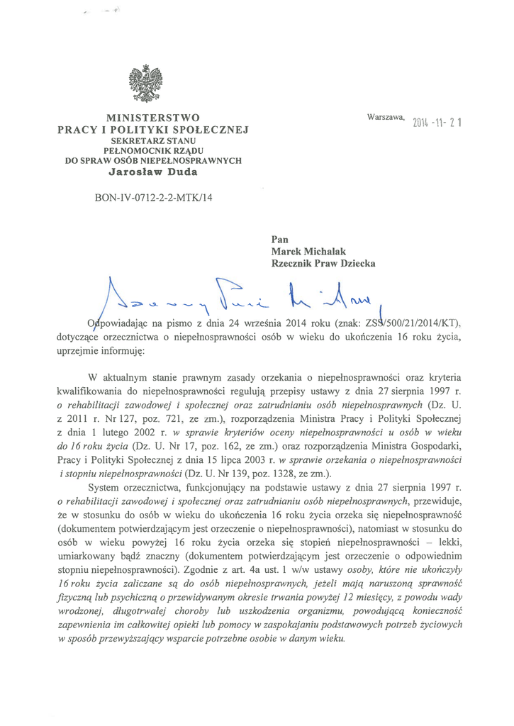 S Warszawa, MINISTERSTWO PRACY I POLITYKI SPOŁECZNEJ Z1 SEKRETARZ STANU PEŁNOMOCNIK RZĄDU DO SPRAW OSÓB NIEPEŁNOSPRAWNYCH Jarosław Duda BON-IV-071 2-2-2-MTK/1 4 Pan Marek Michalak Rzecznik Praw Dziecka L O powiadając na pismo z dnia 24 września 2014 roku (znak: ZS /500/21/2014/KT), dotyczące orzecznictwa o niepełnosprawności osób w wieku do ukończenia 16 roku życia, uprzejmie informuję: W aktualnym stanie prawnym zasady orzekania o niepełnosprawności oraz kryteria kwalifikowania do niepełnosprawności regulują przepisy ustawy z dnia 27 sierpnia 1997 r. o rehabilitacji zawodowej I społecznej oraz zatrudnianiu osób niepełnosprawnych (Dz. U. z 2011 r. Nr 127, poz. 721, ze zm.), rozporządzenia Ministra Pracy i Polityki Społecznej z dnia 1 lutego 2002 r. w sprawie kryteriów oceny niepełnosprawności u osób w wieku do 16 roku życia (Dz. U. Nr 17, poz. 162, ze zm.) oraz rozporządzenia Ministra Gospodarki, Pracy i Polityki Społecznej z dnia 15 lipca 2003 r. w sprawie orzekania o niepełnosprawności i stopniu niepełnosprawności (Dz. U. Nr 139, poz. 1328, ze zm.). System orzecznictwa, funkcjonujący na podstawie ustawy z dnia 27 sierpnia 199”7 r. o rehabilitacji zawodowej i społecznej oraz zatrudnianiu osób niepełnosprawnych, przewiduje, że w stosunku do osób w wieku do ukończenia 16 roku życia orzeka się niepełnosprawność (dokumentem potwierdzającym jest orzeczenie o niepełnosprawności), natomiast w stosunku do lekki, osób w wieku powyżej 16 roku życia orzeka się stopień niepełnosprawności umiarkowany bądź znaczny (dokumentem potwierdzającym jest orzeczenie o odpowiednim stopniu niepełnosprawności). Zgodnie z ai-t. 4a ust. 1 w/w ustawy osoby, które nie ukończyły 16 roku życia zaliczane są do osób niepełnosprawnych, jeżeli mają naruszoną sprawność Jizyczną lub psychiczną o przewidywanym okresie trwania powyżej 12 miesięcy, z powodu wady wrodzonej, długotrwałej choroby lub uszkodzenia organizmu, powodującą konieczność zapewnienia im całkowitej opieki lub pomocy w zaspokajaniu podstawowych potrzeb życiowych w sposób przewyższający wsparcie potrzebne osobie w danym wieku. — 4 Należy przy tym zauważyć, iż godnie z art. 2 pkt 10 przedmiotowej ustawy niepełnosprawność oznacza trwałą lub okresową niezdolność do wypełniania ról społecznych z powodu stałego lub długotrwałego naruszenia sprawności organizmu, w szczególności powodującą niezdolność do pracy. Pojęcie niepełnosprawność obejmuje więc kategorię zdolności do pełnienia przez człowieka ról społecznych adekwatnie do wieku. Zachodzi bowiem zależność pomiędzy ograniczeniem zdolności do realizacji oczekiwań, funkcji, zachowań i postaw wynikających z zajmowanej pozycji społecznej w różnych grupach społecznych a niepełnosprawnością. Niepełnosprawność, zgodnie z kryterium ustawowym, to niemożność efektywnego pełnienia ról społecznych tj. wypełniania zobowiązania wynikającego z zajmowanej pozycji społecznej przy korzystaniu przez osobę z przysługuj ących jej przywilejów i praw według bardziej lub mniej określonego wzoru, a więc niemożność bądź trudności w codziennej aktywności i uczestnictwie. — Zgodnie z treścią 3 ust. 1 rozporządzenia Ministra Gospodarki, Pracy i Polityki Społecznej z dnia 15 lipca 2003 r. w sprawie orzekania o niepełnosprawności i stopniu niepełnosprawności przy orzekaniu o niepełnosprawności osoby, która nie ukończyła 16 roku życia bierze się pod uwagę: • zaświadczenie lekarskie zawierające opis stanu zdrowia, wydane przez lekarza, pod którego opieką lekarską znajduje się dziecko, oraz inne posiadane dokumenty mogące mieć wpływ na ustalenie niepełnosprawności; • ocenę stanu zdrowia wystawioną przez lekarza przewodniczącego składu orzekającego, zawierającą opis przebiegu choroby zasadniczej oraz wyniki dotychczasowego leczenia i rehabilitacji, opis badania przedmiotowego, rozpoznanie choroby zasadniczej i chorób współistniejących oraz rokowania odnośnie do przebiegu choroby, a także ograniczenia w funkcjonowaniu występujące w Życiu codziennym w porównaniu do dzieci z pełną sprawnością psychiczną i fizyczną właściwą dla wieku dziecka; • możliwość poprawy zaburzonej funkcji organizmu poprzez zaopatrzenie w przedmioty ortopedyczne, środki techniczne, środki pomocnicze lub inne działania. - Wniosek o wydanie orzeczenia o niepełnosprawności rozpatruje skład orzekający, wyznaczony przez przewodniczący powiatowego/wojewódzkiego zespołu do spraw orzekania o niepełnosprawności, spośród członków zespołu do których należą: lekarz, psycholog, pracownik socjalny, doradca zawodowy i pedagog. Jeśli okoliczności sprawy, przede wszystkim stan faktyczny, uzasadniają wyznaczenie do składu większej liczby specjalistów, przewodniczący może wyznaczyć więcej niż dwie osoby. Ważne jest, że przewodniczącym składu orzekającego zawsze musi być lekarz, specjalista w dziedzinie odpowiedniej do choroby zasadniczej osoby zainteresowanej. Każdy z członków zespołu uczestniczący w posiedzeniu składu orzekającego sporządza, w zakresie swojej specjalności, ocenę fimkcjonalną osoby orzekanej. Lekarz dokonuje oceny stanu zdrowia uwzględniając m.in. przebieg choroby zasadniczej oraz wyniki dotychczasowego leczenia i rehabilitacji po wcześniejszym zapoznaniu się z całością dokumentacji medycznej dołączanej do złożonego wniosku o wydanie orzeczenia potwierdzającego niepełnosprawność. Obok oceny medycznej, w przypadku dzieci poniżej 16 go roku życia, dokonywana jest również ocena przez psychologa lub pedagoga członka — — 2 zespołu orzekającego. W przypadku sporządzania oceny psychologicznej dokonuje się oceny występowania dysfunkcji psychicznych warunkujących trudności w samodzielnym funkcjonowaniu, z uwzględnieniem zaburzeń w zakresie procesów poznawczych oraz emocjonal