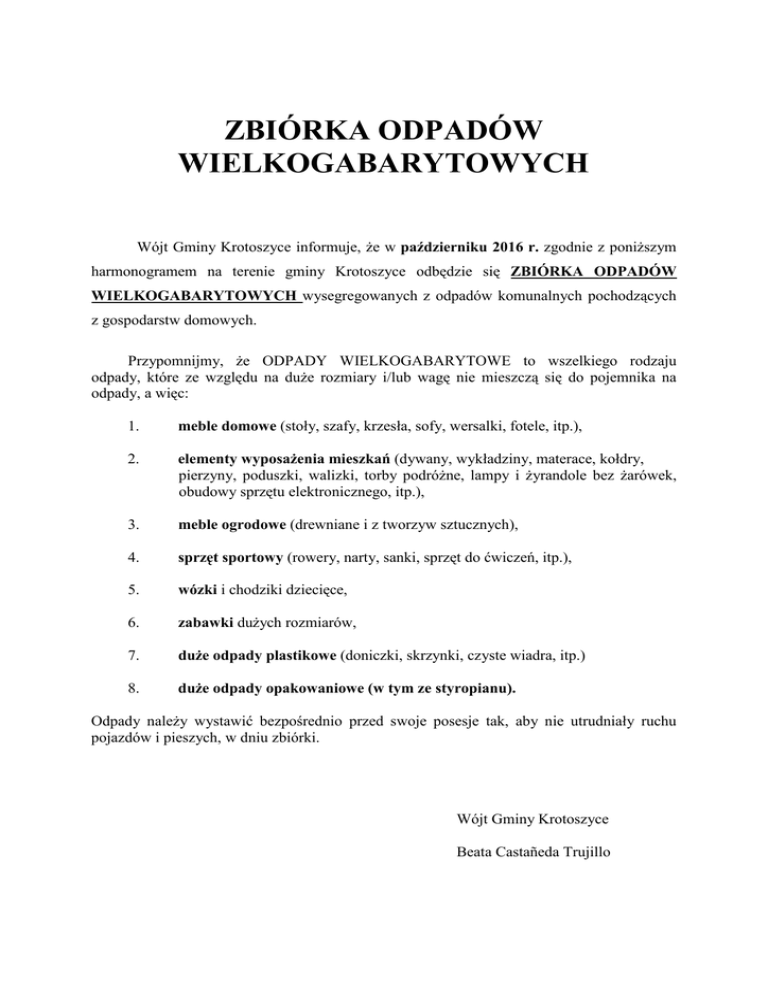 ZBIÓRKA ODPADÓW WIELKOGABARYTOWYCH Wójt Gminy Krotoszyce informuje, że w październiku 2016 r. zgodnie z poniższym harmonogramem na terenie gminy Krotoszyce odbędzie się ZBIÓRKA ODPADÓW WIELKOGABARYTOWYCH wysegregowanych z odpadów komunalnych pochodzących z gospodarstw domowych. Przypomnijmy, że ODPADY WIELKOGABARYTOWE to wszelkiego rodzaju odpady, które ze względu na duże rozmiary i/lub wagę nie mieszczą się do pojemnika na odpady, a więc: 1. meble domowe (stoły, szafy, krzesła, sofy, wersalki, fotele, itp.), 2. elementy wyposażenia mieszkań (dywany, wykładziny, materace, kołdry, pierzyny, poduszki, walizki, torby podróżne, lampy i żyrandole bez żarówek, obudowy sprzętu elektronicznego, itp.), 3. meble ogrodowe (drewniane i z tworzyw sztucznych), 4. sprzęt sportowy (rowery, narty, sanki, sprzęt do ćwiczeń, itp.), 5. wózki i chodziki dziecięce, 6. zabawki dużych rozmiarów, 7. duże odpady plastikowe (doniczki, skrzynki, czyste wiadra, itp.) 8. duże odpady opakowaniowe (w tym ze styropianu). Odpady należy wystawić bezpośrednio przed swoje posesje tak, aby nie utrudniały ruchu pojazdów i pieszych, w dniu zbiórki. Wójt Gminy Krotoszyce Beata Castañeda Trujillo harmonogram zbiórki odpadów wielkogabarytowych. data 24.10 2016 (Poniedziałek) 25.10.2016 (Wtorek) 26.10.12016 (Środa) godz. rozpoczęcia miejscowość Pawłowice Małe, Szymanowice,Dunino, Janowice Duże, Kozice, Bielowice, Złotniki, Prostynia, Babin, Kościelec, Warmątowice Sienkiewiczowskie, 07:00 – 18:00 Ty czyk Legnicki 14:30 – 18:00 14:30 – 18:00 Czerwony Kościół, Wilczyce, Krajów, Winnica Krotoszyce