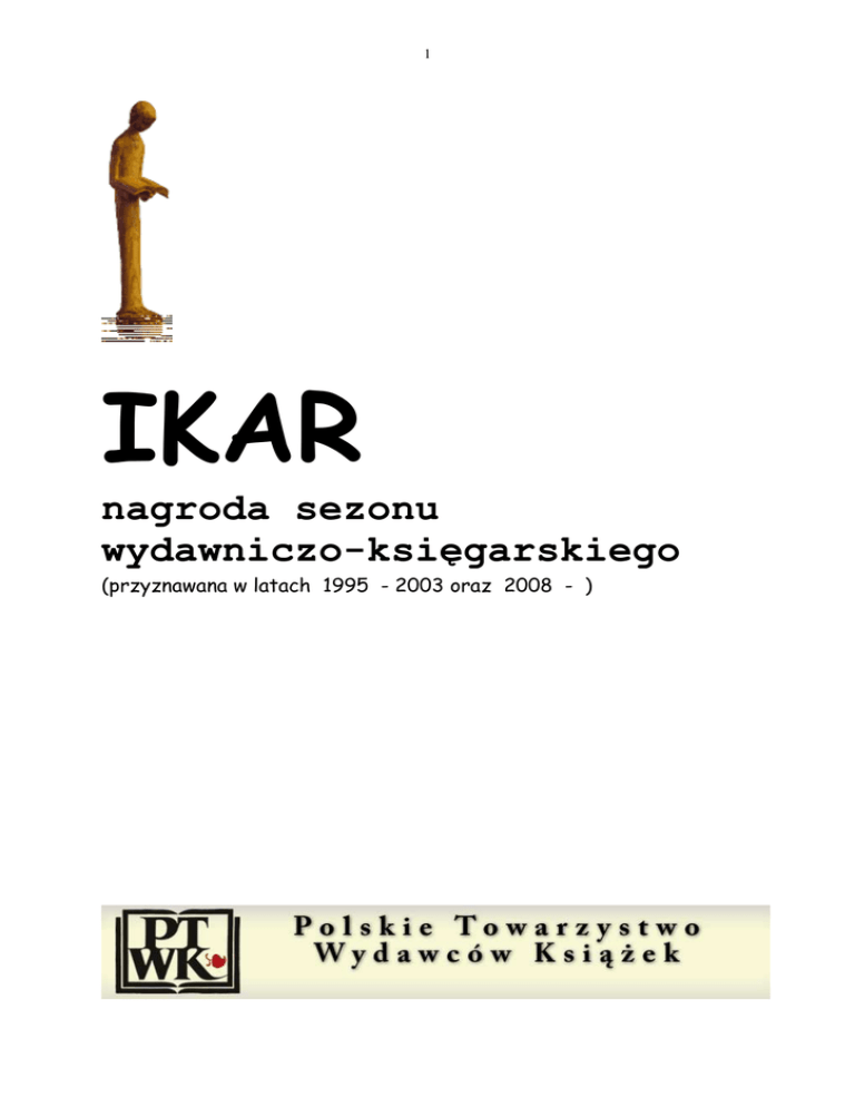 1 IKAR nagroda sezonu wydawniczo-księgarskiego (przyznawana w latach 1995 - 2003 oraz 2008 - ) 2 B ylejakość zalęgła się w naszym życiu na dobre. Coraz rzadziej rażą nas brak punktualności, korektorskie błędy, amatorszczyzna. Profesjonalizm, etyka i zawodowa elegancja coraz częściej okazują się zbędne w wielu dziedzinach ludzkiej aktywności. Co więcej, często bywa, że działalność nie respektująca fundamentalnych norm zawodowych i etycznych, nie wspominając już o przepisach prawa, bywa opłacalna pod każdym względem i przynosi wymierne korzyści. Konieczność jednoznacznego reagowania na szereg negatywnych zjawisk występujących w obszarze książki i przeciwdziałania im oraz stymulowania właściwym rozwojem rynku od dawna stanowiła temat wielu środowiskowych rozmów i dyskusji. Istniała potrzeba przypominania, wskazywania i promowania tego, co wartościowe i godne naśladowania. W 1994 roku Andrzej Nagraba, dyrektor handlowy wydawnictwa Wiedza Powszechna opublikował w miesięczniku Wydawca artykuł pt. Oscar dla książki: „...marzy mi się ogromna impreza, coś na kształt wręczania Oscarów dla polskiej książki”. We wrześniu 1994 roku, podczas 5. Krajowych Targów Książki sformułowana została idea honorowania najważniejszego wydarzenia sezonu wydawniczoksięgarskiego: Piotr Dobrołęcki (Megaron), Ryszard Grąbkowski (Ars Polona), Tadeusz Górny (Telemegaron), Tadeusz Lewandowski (Wydawca), Andrzej Nagraba (Wiedza Powszechna), Marek Tobera (Notes Wydawniczy), Jolanta Walewska (Szewal) oraz Tadeusz J. Żółciński (publicysta), podjęli realizacji pomysłu Andrzeja Nagraby. Jej efektem był projekt dyskusję nad formą dorocznej nagrody sezonu wydawniczo-księgarskiego, pod nazwą IKAR. Pomysłodawcy weszli w skład Kapituły Nagrody i sformułowany został regulamin określający zasady przyznawania IKARA. 13 września 1995 roku po raz pierwszy ogłoszono nominacje do nowej nagrody. Trzy dni później, prof. Aleksander Gieysztor, przewodniczący jury, które spośród 10 nominowanych wybrało jednego laureata nagrody, wręczył pierwszą statuetkę IKARA Andrzejowi Adamusowi, prezesowi z Wrocławia. Wyróżnienia otrzymali: Hanna Wydawnictwa Dolnośląskiego Macierewicz (Notes Wydawniczy) i Jan Rodzeń (Klub Księgarza). Miejscem dorocznej celebry z okazji przyznania nagrody stały się Krajowe Targi Książki. 3 W roku 1999, tym razem podczas targów międzynarodowych, powstało Stowarzyszenie Promocji IKAR, Książki którego głównym zadaniem było zapewnianie warunków funkcjonowania nagrody. Regulamin nagrody podlegał modyfikacjom, następowały zmiany w składzie Kapituły i Jury. IKAR z roku na rok zyskiwał zwolenników, sympatyków i przyjaciół. Nagroda Sezonu Wydawniczo-Księgarskiego została zaaprobowana przez środowisko, stała się wyróżnieniem ważnym i pożądanym. Pozyskała także wspaniałych sponsorów, jak choćby Plus GSM oraz znaczących patronów medialnych, takich jak Polskie Radio SA, TVP SA czy redakcja „Rzeczpospolitej”. Laureatami nagrody głównej byli: Wydawnictwo Dolnośląskie (1995), Władysław Kopaliński (1996), Wydawnictwo Literackie (1997), SW „Czytelnik” (1998), Ryszard Kapuściński (1999), ks. Jan Twardowski (2000), Empik sp. z o.o. (2001), Powiatowa i Miejska Biblioteka Publiczna w Bochni (2002), Biblioteka Narodowa (2003). W roku 2002 Nagrodę Specjalną otrzymało Wydawnictwo ISKRY. Nominacje zgłaszała Kapituła Nagrody, zaś nagrodę główną przyznawało powoływane co roku Jury, któremu przewodniczyli kolejno: prof. Aleksander Gieysztor, dr Janusz Odrowąż-Pieniążek i prof. Janusz Tazbir. W 2004 roku stowarzyszenie utraciło sponsorów. Wobec niemożności pozyskania środków na realizację projektu, przyznawanie nagrody, a wraz z nią działalność stowarzyszenia zawieszono bezterminowo. Mimo wielu starań, przerwa w przyznawaniu IKARA trwała aż cztery lata. Dopiero w roku 2008 znaleziono kolejnych sponsorów (Murator EXPO sp. z o.o. oraz PAP SA), a organizatorem nagrody zostało Polskie Towarzystwo Wydawców Książek. Zachowano podstawowe zasady i tryb przyznawania nagrody, zaś miejscem jej wręczenia stały się stołeczne imprezy targowe. Od 2008 roku jury, pod przewodnictwem prof. Janusza Tazbira, przyznało następujące nagrody główne: Tygodnikowi „Polityka” (2008), Markowi Krawczykowi (2009) oraz Porozumieniu Wydawców Książki Historycznej (2010) Od 2010 roku wręczenie nagrody IKAR odbywa się w dniu inauguracji Warszawskich Targów Książki. 4 O IKARZE PISALI... w pierwszym rzędzie prasa fachowa: „... Wielką troską animatorów było okrzepnięcie Ikara, dbałość o klarowność koncepcji, rzec można – jej czystość. Pozostał więc nagrodą sezonu wydawniczoksięgarskiego, premiującą profesjonalizm, styl, elegancję i sposób bycia na rynku. Zachował swój branżowy charakter. A od innych nagród, których w dziedzinie książki jest przecież wiele, różni go m.in. ambicja objęcia możliwie najszerszego spektrum – od spraw edytorskich po biblioteczne, od kategorii autorskiej po księgarstwo hurtowe. Wyróżnia go także wyłącznie honorowy charakter. Nominowani mogą liczyć jedynie na bukiet kwiatów i dyplom, laureat także na piękną statuetkę dłuta Krzysztofa Sochackiego.” (M. Tobera, Notes Wydawniczy) Pisała też prasa codzienna, od „Rzeczpospolitej” przez „Polskę Zbrojną”, aż po liczne tytuły prasy lokalnej: „...Laureatem zostało warszawskie wydawnictwo Czytelnik, a wśród nominowanych do nagrody znalazła się księgarnia EUREKA ze Świdnicy, która sprzedaje książki od kilkunastu lat. Jak się dowiedzieliśmy, nie tylko nagroda, ale i sama nominacja jest marzeniem każdego księgarza w kraju.(...) To jedyna tego typu nagroda na polskim rynku wydawniczym. Wręcza się ją dopiero od czterech lat, a już dziś jest bezcenna – mówi Barbara Drapich. – „Ikar” potwierdza naszą fachowość