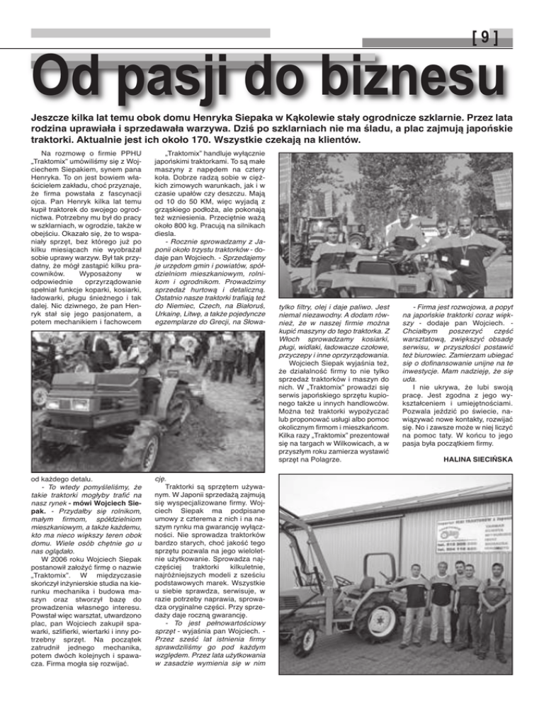 Od pasji do biznesu [9] Jeszcze kilka lat temu obok domu Henryka Siepaka w Kąkolewie stały ogrodnicze szklarnie. Przez lata rodzina uprawiała i sprzedawała warzywa. Dziś po szklarniach nie ma śladu, a plac zajmują japońskie traktorki. Aktualnie jest ich około 170. Wszystkie czekają na klientów. Na rozmowę o firmie PPHU „Traktomix” umówiliśmy się z Wojciechem Siepakiem, synem pana Henryka. To on jest bowiem właścicielem zakładu, choć przyznaje, że firma powstała z fascynacji ojca. Pan Henryk kilka lat temu kupił traktorek do swojego ogrodnictwa. Potrzebny mu był do pracy w szklarniach, w ogrodzie, także w obejściu. Okazało się, że to wspaniały sprzęt, bez którego już po kilku miesiącach nie wyobrażał sobie uprawy warzyw. Był tak przydatny, że mógł zastąpić kilku pracowników. Wyposażony w odpowiednie oprzyrządowanie spełniał funkcje koparki, kosiarki, ładowarki, pługu śnieżnego i tak dalej. Nic dziwnego, że pan Henryk stał się jego pasjonatem, a potem mechanikiem i fachowcem od każdego detalu. - To wtedy pomyśleliśmy, że takie traktorki mogłyby trafić na nasz rynek - mówi Wojciech Siepak. - Przydałby się rolnikom, małym firmom, spółdzielniom mieszkaniowym, a także każdemu, kto ma nieco większy teren obok domu. Wiele osób chętnie go u nas oglądało. W 2006 roku Wojciech Siepak postanowił założyć firmę o nazwie „Traktomix”. W międzyczasie skończył inżynierskie studia na kierunku mechanika i budowa maszyn oraz stworzył bazę do prowadzenia własnego interesu. Powstał więc warsztat, utwardzono plac, pan Wojciech zakupił spawarki, szlifierki, wiertarki i inny potrzebny sprzęt. Na początek zatrudnił jednego mechanika, potem dwóch kolejnych i spawacza. Firma mogła się rozwijać. „Traktomix” handluje wyłącznie japońskimi traktorkami. To są małe maszyny z napędem na cztery koła. Dobrze radzą sobie w ciężkich zimowych warunkach, jak i w czasie upałów czy deszczu. Mają od 10 do 50 KM, więc wyjadą z grząskiego podłoża, ale pokonają też wzniesienia. Przeciętnie ważą około 800 kg. Pracują na silnikach diesla. - Rocznie sprowadzamy z Japonii około trzystu traktorków - dodaje pan Wojciech. - Sprzedajemy je urzędom gmin i powiatów, spółdzielniom mieszkaniowym, rolnikom i ogrodnikom. Prowadzimy sprzedaż hurtową i detaliczną. Ostatnio nasze traktorki trafiają też do Niemiec, Czech, na Białoruś, Urkainę, Litwę, a także pojedyncze egzemplarze do Grecji, na Słowa- cję. Traktorki są sprzętem używanym. W Japonii sprzedażą zajmują się wyspecjalizowane firmy. Wojciech Siepak ma podpisane umowy z czterema z nich i na naszym rynku ma gwarancję wyłączności. Nie sprowadza traktorków bardzo starych, choć jakość tego sprzętu pozwala na jego wieloletnie użytkowanie. Sprowadza najczęściej traktorki kilkuletnie, najróżniejszych modeli z sześciu podstawowych marek. Wszystkie u siebie sprawdza, serwisuje, w razie potrzeby naprawia, sprowadza oryginalne części. Przy sprzedaży daje roczną gwarancję. - To jest pełnowartościowy sprzęt - wyjaśnia pan Wojciech. Przez sześć lat istnienia firmy sprawdziliśmy go pod każdym względem. Przez lata użytkowania w zasadzie wymienia się w nim tylko filtry, olej i daje paliwo. Jest niemal niezawodny. A dodam również, że w naszej firmie można kupić maszyny do tego traktorka. Z Włoch sprowadzamy kosiarki, pługi, widlaki, ładowacze czołowe, przyczepy i inne oprzyrządowania. Wojciech Siepak wyjaśnia też, że działalność firmy to nie tylko sprzedaż traktorków i maszyn do nich. W „Traktomix” prowadzi się serwis japońskiego sprzętu kupionego także u innych handlowców. Można też traktorki wypożyczać lub proponować usługi albo pomoc okolicznym firmom i mieszkańcom. Kilka razy „Traktomix” prezentował się na targach w Wilkowicach, a w przyszłym roku zamierza wystawić sprzęt na Polagrze. - Firma jest rozwojowa, a popyt na japońskie traktorki coraz większy - dodaje pan Wojciech. Chciałbym poszerzyć część warsztatową, zwiększyć obsadę serwisu, w przyszłości postawić też biurowiec. Zamierzam ubiegać się o dofinansowanie unijne na te inwestycje. Mam nadzieję, że się uda. I nie ukrywa, że lubi swoją pracę. Jest zgodna z jego wykształceniem i umiejętnościami. Pozwala jeździć po świecie, nawiązywać nowe kontakty, rozwijać się. No i zawsze może w niej liczyć na pomoc taty. W końcu to jego pasja była początkiem firmy. HALINA SIECIŃSKA