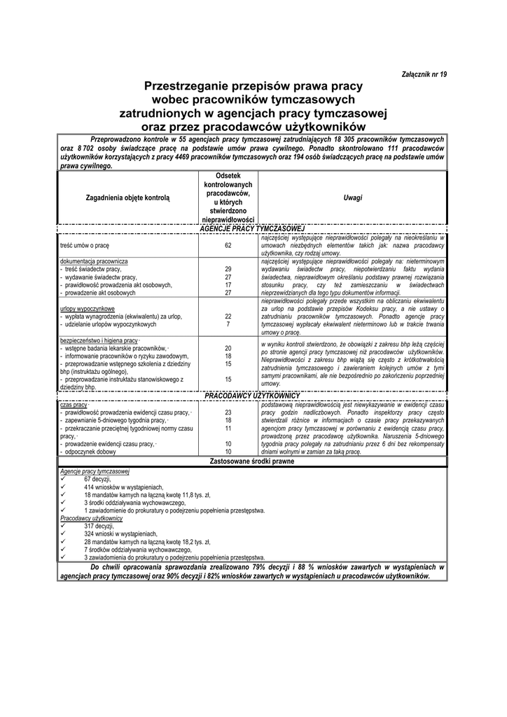 Załącznik nr 19 Przestrzeganie przepisów prawa pracy wobec pracowników tymczasowych zatrudnionych w agencjach pracy tymczasowej oraz przez pracodawców użytkowników Przeprowadzono kontrole w 55 agencjach pracy tymczasowej zatrudniających 18 305 pracowników tymczasowych oraz 8 702 osoby świadczące pracę na podstawie umów prawa cywilnego. Ponadto skontrolowano 111 pracodawców użytkowników korzystających z pracy 4469 pracowników tymczasowych oraz 194 osób świadczących pracę na podstawie umów prawa cywilnego. Odsetek kontrolowanych pracodawców, Zagadnienia objęte kontrolą Uwagi u których stwierdzono nieprawidłowości AGENCJE PRACY TYMCZASOWEJ treść umów o pracę 62 dokumentacja pracownicza - treść świadectw pracy, - wydawanie świadectw pracy, - prawidłowość prowadzenia akt osobowych, - prowadzenie akt osobowych 29 27 17 27 urlopy wypoczynkowe - wypłata wynagrodzenia (ekwiwalentu) za urlop, - udzielanie urlopów wypoczynkowych 22 7 bezpieczeństwo i higiena pracy· - wstępne badania lekarskie pracowników,· - informowanie pracowników o ryzyku zawodowym, - przeprowadzanie wstępnego szkolenia z dziedziny bhp (instruktażu ogólnego), - przeprowadzanie instruktażu stanowiskowego z dziedziny bhp. 20 18 15 15 najczęściej występujące nieprawidłowości polegały na nieokreślaniu w umowach niezbędnych elementów takich jak: nazwa pracodawcy użytkownika, czy rodzaj umowy. najczęściej występujące nieprawidłowości polegały na: nieterminowym wydawaniu świadectw pracy, niepotwierdzaniu faktu wydania świadectwa, nieprawidłowym określaniu podstawy prawnej rozwiązania stosunku pracy, czy też zamieszczaniu w świadectwach nieprzewidzianych dla tego typu dokumentów informacji. nieprawidłowości polegały przede wszystkim na obliczaniu ekwiwalentu za urlop na podstawie przepisów Kodeksu pracy, a nie ustawy o zatrudnianiu pracowników tymczasowych. Ponadto agencje pracy tymczasowej wypłacały ekwiwalent nieterminowo lub w trakcie trwania umowy o pracę. w wyniku kontroli stwierdzono, że obowiązki z zakresu bhp leżą częściej po stronie agencji pracy tymczasowej niż pracodawców użytkowników. Nieprawidłowości z zakresu bhp wiążą się często z krótkotrwałością zatrudnienia tymczasowego i zawieraniem kolejnych umów z tymi samymi pracownikami, ale nie bezpośrednio po zakończeniu poprzedniej umowy. PRACODAWCY UŻYTKOWNICY czas pracy· - prawidłowość prowadzenia ewidencji czasu pracy,· - zapewnianie 5-dniowego tygodnia pracy,· - przekraczanie przeciętnej tygodniowej normy czasu pracy,· - prowadzenie ewidencji czasu pracy,· - odpoczynek dobowy 23 18 11 10 10 podstawową nieprawidłowością jest niewykazywanie w ewidencji czasu pracy godzin nadliczbowych. Ponadto inspektorzy pracy często stwierdzali różnice w informacjach o czasie pracy przekazywanych agencjom pracy tymczasowej w porównaniu z ewidencją czasu pracy, prowadzoną przez pracodawcę użytkownika. Naruszenia 5-dniowego tygodnia pracy polegały na zatrudnianiu przez 6 dni bez rekompensaty dniami wolnymi w zamian za taką pracę. Zastosowane środki prawne Agencje pracy tymczasowej 9 67 decyzji, 9 414 wniosków w wystąpieniach, 9 18 mandatów karnych na łączną kwotę 11,8 tys. zł, 9 3 środki oddziaływania wychowawczego, 9 1 zawiadomienie do prokuratury o podejrzeniu popełnienia przestępstwa. Pracodawcy użytkownicy 9 317 decyzji, 9 324 wnioski w wystąpieniach, 9 28 mandatów karnych na łączną kwotę 18,2 tys. zł, 9 7 środków oddziaływania wychowawczego, 9 3 zawiadomienia do prokuratury o podejrzeniu popełnienia przestępstwa. Do chwili opracowania sprawozdania zrealizowano 79% decyzji i 88 % wniosków zawartych w wystąpieniach w agencjach pracy tymczasowej oraz 90% decyzji i 82% wniosków zawartych w wystąpieniach u pracodawców użytkowników.