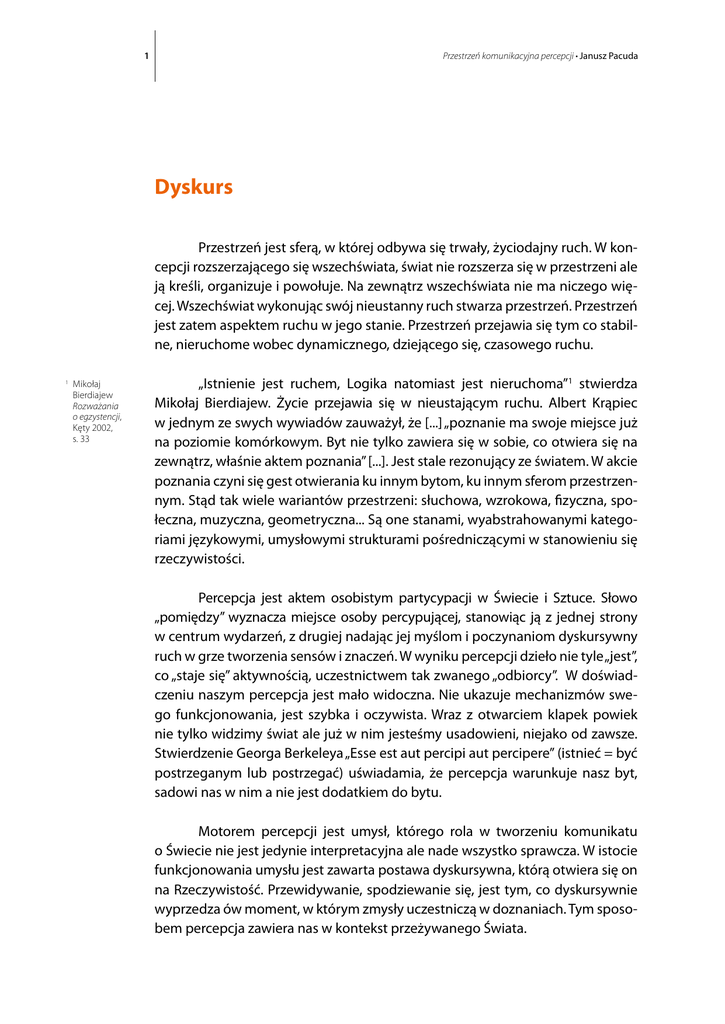 1 Przestrzeń komunikacyjna percepcji • Janusz Pacuda Dyskurs Mikołaj Bierdiajew Rozważania o egzystencji, Kęty 2002, s. 33 1 Przestrzeń jest sferą, w której odbywa się trwały, życiodajny ruch. W koncepcji rozszerzającego się wszechświata, świat nie rozszerza się w przestrzeni ale ją kreśli, organizuje i powołuje. Na zewnątrz wszechświata nie ma niczego więcej. Wszechświat wykonując swój nieustanny ruch stwarza przestrzeń. Przestrzeń jest zatem aspektem ruchu w jego stanie. Przestrzeń przejawia się tym co stabilne, nieruchome wobec dynamicznego, dziejącego się, czasowego ruchu. „Istnienie jest ruchem, Logika natomiast jest nieruchoma”1 stwierdza Mikołaj Bierdiajew. Życie przejawia się w nieustającym ruchu. Albert Krąpiec w jednym ze swych wywiadów zauważył, że [...] „poznanie ma swoje miejsce już na poziomie komórkowym. Byt nie tylko zawiera się w sobie, co otwiera się na zewnątrz, właśnie aktem poznania” [...]. Jest stale rezonujący ze światem. W akcie poznania czyni się gest otwierania ku innym bytom, ku innym sferom przestrzennym. Stąd tak wiele wariantów przestrzeni: słuchowa, wzrokowa, fizyczna, społeczna, muzyczna, geometryczna... Są one stanami, wyabstrahowanymi kategoriami językowymi, umysłowymi strukturami pośredniczącymi w stanowieniu się rzeczywistości. Percepcja jest aktem osobistym partycypacji w Świecie i Sztuce. Słowo „pomiędzy” wyznacza miejsce osoby percypującej, stanowiąc ją z jednej strony w centrum wydarzeń, z drugiej nadając jej myślom i poczynaniom dyskursywny ruch w grze tworzenia sensów i znaczeń. W wyniku percepcji dzieło nie tyle „jest”, co „staje się” aktywnością, uczestnictwem tak zwanego „odbiorcy”. W doświadczeniu naszym percepcja jest mało widoczna. Nie ukazuje mechanizmów swego funkcjonowania, jest szybka i oczywista. Wraz z otwarciem klapek powiek nie tylko widzimy świat ale już w nim jesteśmy usadowieni, niejako od zawsze. Stwierdzenie Georga Berkeleya „Esse est aut percipi aut percipere” (istnieć = być postrzeganym lub postrzegać) uświadamia, że percepcja warunkuje nasz byt, sadowi nas w nim a nie jest dodatkiem do bytu. Motorem percepcji jest umysł, którego rola w tworzeniu komunikatu o Świecie nie jest jedynie interpretacyjna ale nade wszystko sprawcza. W istocie funkcjonowania umysłu jest zawarta postawa dyskursywna, którą otwiera się on na Rzeczywistość. Przewidywanie, spodziewanie się, jest tym, co dyskursywnie wyprzedza ów moment, w którym zmysły uczestniczą w doznaniach. Tym sposobem percepcja zawiera nas w kontekst przeżywanego Świata. 2 Przestrzeń komunikacyjna percepcji • Janusz Pacuda Percepcja umieszcza nas w Świecie, percepcja Sztuki umieszcza nas w świecie człowieka. Nie można być w świecie człowieka nie będąc wcześniej w Świecie. Gdy mamy na myśli percepcję sztuki, to rozumiemy ją zazwyczaj tak, jakby byśmy mogli ją w dowolnym momencie wyłączyć lub włączyć. Percepcja sztuki nie dotyczy wyłącznie przedmiotu sztuki. Istotą recepcji komunikatów, w tym istotą sztuki jest, wkraczanie dyskursem w obszary mapy wszelkich mentalnych odniesień. Człowiek (zapewne wszelkie istoty żyjące także) istnieje w złożonej sieci relacji między tym, co umysłowe a tym, co jest fizyczne. Karl Popper sugerował, że żyjemy w trzech – co najmniej – światach równocześnie. Pierwszy jest substancją, z której świat rzeczywisty i my, należący do niego, jesteśmy zbudowani, drugi dotyczy umocowania każdego z nas w realnym świecie przyczyną umysłu, trzeci to autonomiczny świat idei, myśli ludzkiej, wspólnej świadomości. W pierwszym przypadku umysł nie odgrywa roli – obecna jest substancja. W drugim i trzecim przypadku umysł jest tym, co konstruuje swoje światy. Świadomość zbiorowa to pojęcie nieostre – sama niewidoczna, jest postrzegalna między innymi poprzez media. Jest jak pole grawitacyjne, które każdego z nas dotyczy – niewidoczne, choć obecne. Za jej sprawą budujemy wspólnotę ludzką. Świadomość zbiorowa jest zjawiskiem mentalnym w jednostkowym umyśle każdego z nas z osobna, w którym ogniskuje się i zawiera nasze wyobrażenie na temat świata realnego i obrazu świata innych. Każdemu z nas jawi się jak wewnętrzny ekran, na którym dokonywana jest nieustannie projekcja wieloznacznych obrazów rzeczywistości nas dotyczącej. Nie możemy nie być obecni w którymkolwiek z tych światów. Jesteśmy zawarci w każdym z nich z osobna i we wszystkich trzech zarazem. Sytuacja ta stwarza naszą pozycję „pomiędzy”. Różnica sensu dwóch podobnych słów „między” i „pomiędzy” zasadza się w porównaniu, różnicowaniu występującym w słowie „pomiędzy”, a którego znaczenia nie zawiera słowo „między”. Pojęcie „między” jest demokratyczne lecz pasywne. Brak mu dynamizmu. Dyskurs – bieg w wielu kierunkach naraz – jest sposobem w jaki realizujemy się w świecie gdy ustanowieni jesteśmy wobec nieznanego, w sytuacji, która określa naszą kondycję wyrażeniem „pomiędzy”. Zarazem ten punkt odniesienia ukazuje nasz stan niestabilnego umocowania, zawieszenia, nierównowagi, z drugiej strony ukazuje ruchy stabilizujące układ tworząc rodzaj mostu. W takiej dwoistej sytuacji procesy umysłowe reprezentowane przez słowa „przewidywanie”, „spodziewanie”, „przypuszczenie”, „otwarcie w oczekiwaniu”, którymi określam praprzyczynę percepcji, znajdują swoje umocowanie w dyskursywnej, rozwibrowanej kondycji pojęcia „pomiędzy”. Percepcja kojarzy się jako stan stabilnego, linearnego przepływu skojarzeń, wrażeń, postrzegania. W swej istocie jest dramatycznym ruchem w wielu 3 Przestrzeń komunikacyjna percepcji • Janusz Pacuda kierunkach, z których można pozyskać, wyistoczyć, dobyć na jaw komunikat. Jest samotną walką o przetrwanie. Od jej szybkości zależy nasze życie. System percepcji – 