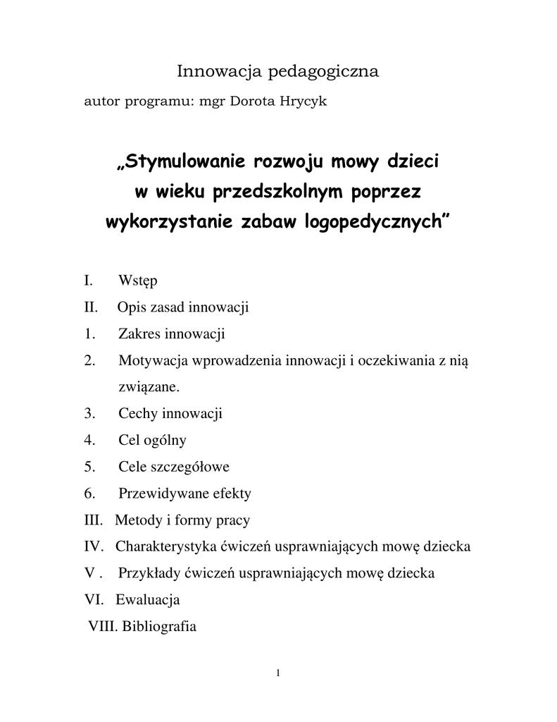 Innowacja pedagogiczna autor programu: mgr Dorota Hrycyk „Stymulowanie rozwoju mowy dzieci w wieku przedszkolnym poprzez wykorzystanie zabaw logopedycznych” I. Wstęp II. Opis zasad innowacji 1. Zakres innowacji 2. Motywacja wprowadzenia innowacji i oczekiwania z nią związane. 3. Cechy innowacji 4. Cel ogólny 5. Cele szczegółowe 6. Przewidywane efekty III. Metody i formy pracy IV. Charakterystyka ćwiczeń usprawniających mowę dziecka V . Przykłady ćwiczeń usprawniających mowę dziecka VI. Ewaluacja VIII. Bibliografia 1 I. Wstęp Mowa w dużej mierze wpływa na całokształt rozwoju dziecka. Daje możliwość precyzyjnej komunikacji, stanowi narzędzie w zdobywaniu informacji, pozwala na wyrażanie swoich myśli, własnych opinii i uczuć. Jest ona atutem w nawiązywaniu kontaktów społecznych. Rozwój mowy jest uwarunkowany genetycznie, zależy od wrodzonych właściwości organizmu człowieka, ale możliwy jest jedynie w kontakcie ze środowiskiem społecznym, z innymi ludźmi. Słowem jest to proces, w którym współgrają czynniki biologiczne i społeczne. Według Leona Kaczmarka w rozwoju mowy wyodrębnia się cztery okresy ( w nawiasach podano lata ramowo): Okres melodii (0 – 1) Okres wyrazu (1 – 2) Okres zdania (2 – 3) Okres swoistej mowy dziecięcej (3 – 7) Okres swoistej mowy dziecięcej przypada na wiek przedszkolny. Wymowę dziecka wstępującego do przedszkola charakteryzuje już duża umiejętność odtwarzania wszystkich elementów słowa. Dziecko potrafi się już porozumieć z dorosłym, chociaż mowa jego nie jest ukształtowana pod względem dźwiękowym. Dziecko 3-letnie powinno już wymawiać wszystkie samogłoski, tak ustne, jak i nosowe (a, o, e, u, i, y, ą, ę), chociaż w mowie jego mogą występować odstępstwa, np. zamiana samogłosek: a=o, e=a, i=y. Jest to związane z niewykształconą sprawnością narządów artykulacyjnych. Powinno również wymawiać spółgłoski wargowe: twarde i zmiękczone (m, mi, b, bi, p, pi), wargowo- zębowe: twarde i zmiękczone (f, fi, w, wi), środkowojęzykowe (ś, ć, ź, dź, ń), tylnojęzykowe twarde i zmiękczone (k, g, ki, gi), szczelinowe (ch), przedniojęzykowo- zębowe (t, d, n), przedniojęzykowo- dziąsłowe (l, li), spółgłoski (j, ł). W wieku tym mogą się już pojawiać głoski przedniojęzykowo-zębowe (s, c, z, dz), a czasem przedniojęzykowo- dziąsłowe (sz, ż, cz, dż). Uogólniając, mowę dziecka 3-letniego cechuje zmiękczanie głosek- s, z, c, dz, sz, ż, cz, dż są często wymawiane jak ś, ź, ć, dź; r może być wymawiane jak j lub ł, zamiast f występuje ch i odwrotnie. Wymowa dziecka 4-letniego będzie się różniła pod względem dźwiękowym. Utrwalają się takie głoski jak: s, z, c, dz. Dziecko nie powinno wymawiać ich już jak: ś, ź, ć, dź. Pojawia się głoska r, choć jej opóźnienie nie 2 powinno jeszcze niepokoić. Głoski sz, ż, cz, dż dziecko jeszcze zamienia na s, z, c, dz lub ś, ź, ć, dź. Mowa dziecka 5-letniego jest już w zasadzie zrozumiała. Głoski sz, ż, cz, dż zaczynają się ustalać. Dziecko potrafi je poprawnie powtórzyć, choć w mowie potocznej mogą być jeszcze wymawiane jak s, z, c dz. Głoska r powinna być już wymawiana, ale często pojawia się dopiero w tym okresie. U 6-latków mowa powinna być już opanowana pod względem dźwiękowym. Dużo dzieci ma jednak nadal problem z opanowaniem wymowy głosek sz, ż, cz, dż, r. Zdarzają się kłopoty z wymową grup spółgłoskowych, zwłaszcza w śródgłosie wyrazu. Przedstawiony rozwój mowy postępuje równolegle z rozwojem motoryki narządów artykulacyjnych. Mówienie jest sprawnością, której trzeba się nauczyć. Jest to możliwe dzięki sukcesywnemu dojrzewaniu różnych organów mowy. Od najmłodszych lat dziecko ćwiczy narządy artykulacyjne poprzez czynności ssania, połykania, żucia. Najtrudniejsze głoski wymagają dodatkowych ruchów precyzyjnych, np. uniesienia języka za dziąsła przy sz, ż, cz, dź, wytworzenia szczeliny przy wymowie głosek przedniojęzykowychzębowych albo szybkich ruchów wibracyjnych niezbędnych do wytworzenia r. W najwcześniejszych okresach życia sama natura zapewnia rozwój sprawności aparatu mowy poprzez takie czynności, jak ssanie, żucie itp. W późniejszych okresach trening ten jest kontynuowany przez samą czynność mówienia. Gdy czynność ta jest zaniżona lub niedbała zakres sprawnościowy mowy poprzestanie na minimum. Potrzebny jest wówczas duży trening oparty na ćwiczeniach artykulacyjnych. Mowa w dużej mierze wpływa na ogólny rozwój dziecka, jego osiągnięcia szkolne. Stanowi narzędzie w zdobywaniu informacji, pozwala na wyrażanie swoich myśli, opinii, odczuć. Ogromną rolę w procesie kształtowania mowy dziecka odgrywają rodzice i najbliższe otoczenie- to oni są jego pierwszymi nauczycielami mowy poprzez wspólne zabawy, czytanie książeczek, ich opowiadanie, śpiewanie piosenek. Istotne znaczenie w zakresie wspomagania i rozwoju mowy ma także działanie nauczyciela pracującego z dzieckiem w przedszkolu, gdzie zabawa stanowi dominujący sposób nauki. Jest kluczem do poznawania nowych słów, ćwiczy oddech, głos, słuch i wymowę. Doskonali formy gramatyczne uwzględniając przy tym akcent, melodię i rytm mowy. Poprzez zabawę możemy stymulować rozwój wszystkich funkcji, od których zależy prawidłowy rozwój mowy. 3 Wyniki badań pedagogicznych, a także moja własna obserwacja dowodzą, że rozwój mowy dzieci w wieku przedszkolnym jest bardzo zróżnicowany, u wielu dzieci występują oprócz wad wymowy, opóźniony rozwój wymowy lub niechęć do mówienia, zaburzenia słuchu fonematycznego, analizy i syntezy słuchowej. Występowanie tych zaburzeń ma istotny wpływ na przebieg procesu nauczania w okresie wczesnoszkolnym. Za słuszne uważam więc wprowadzenie dodatkowych zabaw, mających na celu rozbudzanie aktywności słownej dzieci, wpływających na rozwój mowy dziec