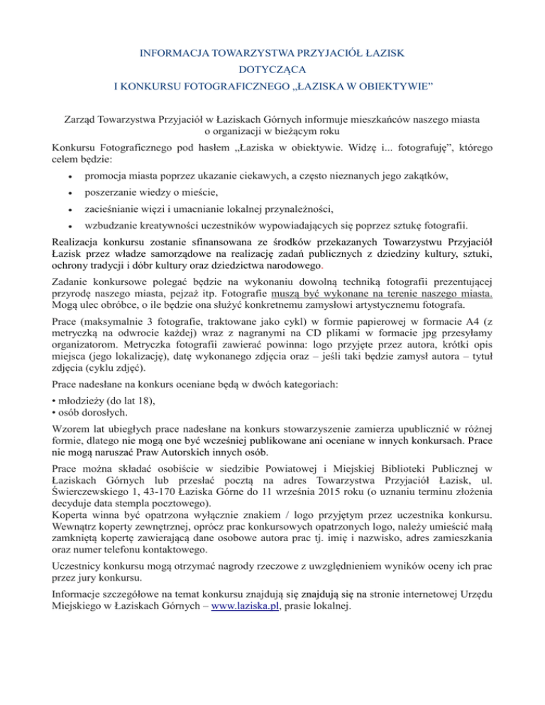 INFORMACJA TOWARZYSTWA PRZYJACIÓŁ ŁAZISK DOTYCZĄCA I KONKURSU FOTOGRAFICZNEGO „ŁAZISKA W OBIEKTYWIE” Zarząd Towarzystwa Przyjaciół w Łaziskach Górnych informuje mieszkańców naszego miasta o organizacji w bieżącym roku Konkursu Fotograficznego pod hasłem „Łaziska w obiektywie. Widzę i... fotografuję”, którego celem będzie: promocja miasta poprzez ukazanie ciekawych, a często nieznanych jego zakątków, poszerzanie wiedzy o mieście, zacieśnianie więzi i umacnianie lokalnej przynależności, wzbudzanie kreatywności uczestników wypowiadających się poprzez sztukę fotografii. Realizacja konkursu zostanie sfinansowana ze środków przekazanych Towarzystwu Przyjaciół Łazisk przez władze samorządowe na realizację zadań publicznych z dziedziny kultury, sztuki, ochrony tradycji i dóbr kultury oraz dziedzictwa narodowego. Zadanie konkursowe polegać będzie na wykonaniu dowolną techniką fotografii prezentującej przyrodę naszego miasta, pejzaż itp. Fotografie muszą być wykonane na terenie naszego miasta. Mogą ulec obróbce, o ile będzie ona służyć konkretnemu zamysłowi artystycznemu fotografa. Prace (maksymalnie 3 fotografie, traktowane jako cykl) w formie papierowej w formacie A4 (z metryczką na odwrocie każdej) wraz z nagranymi na CD plikami w formacie jpg przesyłamy organizatorom. Metryczka fotografii zawierać powinna: logo przyjęte przez autora, krótki opis miejsca (jego lokalizację), datę wykonanego zdjęcia oraz – jeśli taki będzie zamysł autora – tytuł zdjęcia (cyklu zdjęć). Prace nadesłane na konkurs oceniane będą w dwóch kategoriach: • młodzieży (do lat 18), • osób dorosłych. Wzorem lat ubiegłych prace nadesłane na konkurs stowarzyszenie zamierza upublicznić w różnej formie, dlatego nie mogą one być wcześniej publikowane ani oceniane w innych konkursach. Prace nie mogą naruszać Praw Autorskich innych osób. Prace można składać osobiście w siedzibie Powiatowej i Miejskiej Biblioteki Publicznej w Łaziskach Górnych lub przesłać pocztą na adres Towarzystwa Przyjaciół Łazisk, ul. Świerczewskiego 1, 43-170 Łaziska Górne do 11 września 2015 roku (o uznaniu terminu złożenia decyduje data stempla pocztowego). Koperta winna być opatrzona wyłącznie znakiem / logo przyjętym przez uczestnika konkursu. Wewnątrz koperty zewnętrznej, oprócz prac konkursowych opatrzonych logo, należy umieścić małą zamkniętą kopertę zawierającą dane osobowe autora prac tj. imię i nazwisko, adres zamieszkania oraz numer telefonu kontaktowego. Uczestnicy konkursu mogą otrzymać nagrody rzeczowe z uwzględnieniem wyników oceny ich prac przez jury konkursu. Informacje szczegółowe na temat konkursu znajdują się znajdują się na stronie internetowej Urzędu Miejskiego w Łaziskach Górnych – www.laziska.pl, prasie lokalnej. Regulamin Organizacyjny Konkursu organizowanego w 2015 roku przez Towarzystwo Przyjaciół Łazisk w Łaziskach Górnych zwane dalej TPŁ finansowanych ze środków budżetu Gminy Miejskiej Łaziska Górne. I. Nazwa konkursu: Konkurs Fotograficzny „Łaziska w obiektywie. Widzę i... fotografuję ” II. Uczestnicy Mieszkańcy Łazisk Górnych z tym, że konkurs poetycki rozgrywany będzie w 2 kategoriach: a. młodzież do lat 18, b. osoby dorosłe. III. Komisja Konkursowa – Jury 1. Komisję Konkursową powołuje Zarząd Towarzystwa Przyjaciół Łazisk, podejmując stosowną uchwałę. 2. Komisja składa się z 5 osób. 3. Członkiem Komisji może być osoba pełnoletnia, posiadająca wiedzę i doświadczenie zawodowe dające gwarancję prawidłowej i obiektywnej oceny prac konkursowych. 4. Członkowie Komisji mogą być wybierani spośród : a. przedstawicieli Towarzystwa Przyjaciół Łazisk, b. grona specjalistów w zakresie pozwalającym rzetelnie ocenić prace konkursowe osób. 5. Powołani przez Zarząd członkowie Komisji wybierają ze swojego grona przewodniczącego Komisji, który organizuje i kieruje jej działaniami. 6. Zarząd Towarzystwa Przyjaciół Łazisk zapewnia obsługę formalną posiedzeń Komisji (zwoływanie posiedzeń, protokołowanie itp.). 7. Protokoły z posiedzeń Komisji podpisuje protokolant oraz przewodniczący Komisji. 8. Termin zakończenia prac Komisji określa Zarząd Towarzystwa Przyjaciół Łazisk w stosownej uchwale, biorąc pod uwagę ilość złożonych prac. 9. Decyzje Komisji podejmowane są w drodze głosowania jawnego zwykłą większością głosów. 10. Opinie jurorów powinny zawierać krótkie uzasadnienie. 11. Autor pracy konkursowej ma prawo zapoznać się z opinią dotyczącą oceny swojej pracy. 12. Końcowy protokół z prac Komisji jej przewodniczący przekazuje niezwłocznie Zarządowi TPŁ, który ogłasza wyniki Konkursu w lokalnej prasie oraz na stronie internetowej: www.laziska.pl. IV. Zasady składania prac konkursowych 1. Termin składania prac konkursowych ustala się na dzień 11 września 2015 roku. 2. Prace konkursowe należy składać w zaklejonych kopertach na adres: Towarzystwo Przyjaciół Łazisk, ul. Świerczewskiego 1, 43-170 Łaziska Górne. 3. Koperta winna być opatrzona wyłącznie znakiem / logo przyjętym przez uczestnika konkursu. Wewnątrz koperty zewnętrznej, oprócz prac konkursowych opatrzonych logo, należy umieścić małą zamkniętą kopertę zawierającą dane osobowe autora prac tj. imię i nazwisko, adres zamieszkania oraz numer telefonu kontaktowego. V. Postanowienia końcowe 1. Po rozstrzygnięciu konkursów Zarząd TPŁ pisemnie zawiadamia uczestników konkursów o jego wynikach oraz o terminie i miejscu wręczenia nagród.
