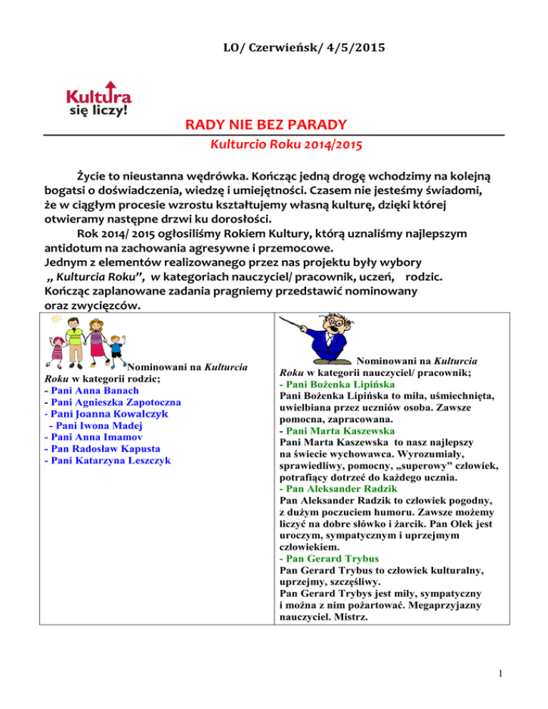 LO/ Czerwieńsk/ 4/5/2015 RADY NIE BEZ PARADY Kulturcio Roku 2014/2015 Życie to nieustanna wędrówka. Kończąc jedną drogę wchodzimy na kolejną bogatsi o doświadczenia, wiedzę i umiejętności. Czasem nie jesteśmy świadomi, że w ciągłym procesie wzrostu kształtujemy własną kulturę, dzięki której otwieramy następne drzwi ku dorosłości. Rok 2014/ 2015 ogłosiliśmy Rokiem Kultury, którą uznaliśmy najlepszym antidotum na zachowania agresywne i przemocowe. Jednym z elementów realizowanego przez nas projektu były wybory „ Kulturcia Roku”, w kategoriach nauczyciel/ pracownik, uczeń, rodzic. Kończąc zaplanowane zadania pragniemy przedstawić nominowany oraz zwycięzców. Nominowani na Kulturcia Roku w kategorii rodzic; - Pani Anna Banach - Pani Agnieszka Zapotoczna - Pani Joanna Kowalczyk - Pani Iwona Madej - Pani Anna Imamov - Pan Radosław Kapusta - Pani Katarzyna Leszczyk Nominowani na Kulturcia Roku w kategorii nauczyciel/ pracownik; - Pani Bożenka Lipińska Pani Bożenka Lipińska to miła, uśmiechnięta, uwielbiana przez uczniów osoba. Zawsze pomocna, zapracowana. - Pani Marta Kaszewska Pani Marta Kaszewska to nasz najlepszy na świecie wychowawca. Wyrozumiały, sprawiedliwy, pomocny, „superowy” człowiek, potrafiący dotrzeć do każdego ucznia. - Pan Aleksander Radzik Pan Aleksander Radzik to człowiek pogodny, z dużym poczuciem humoru. Zawsze możemy liczyć na dobre słówko i żarcik. Pan Olek jest uroczym, sympatycznym i uprzejmym człowiekiem. - Pan Gerard Trybus Pan Gerard Trybus to człowiek kulturalny, uprzejmy, szczęśliwy. Pan Gerard Trybys jest miły, sympatyczny i można z nim pożartować. Megaprzyjazny nauczyciel. Mistrz. 1 Nominowani na Kulturcia Roku w kategorii uczeń: Patryk Kuś Patryk Kuś to uczeń obowiązkowy, grzeczny, koleżeński, zachowujący się w sposób wzorowy. Patryk jest zawsze miły, pogodny i uśmiechnięty, skory do pomocy. Klaudia Górzyńska Klaudia Górzyńska to uczennica kulturalna. Zawsze zorganizowana i systematyczna. Koleżeńska, miła , sympatyczna. Damian Krzemiński Damian Krzemiński to uczeń grzeczny, miły, uczynny, kulturalny. Zawsze pomocny i koleżeński. Berk Imamov Berk Imamov jest dobrym kolegą. Mądrym, życzliwym, pomocnym. Zachowuje się w sposób kulturalny. W kategorii rodzic; Pani Anna Popek Uzasadnienie nominacji: Pani Anna Popek to osoba kulturalna. Dobrze zorganizowana i odpowiedzialna, czego efekty mogliśmy doświadczyć uczestnicząc w Studniówce. Pani Anna Popek jest zawsze uśmiechnięta i pomocna. W kategorii nauczyciel/ pracownik szkoły Pani Agnieszka Januszewicz Uzasadnienie nominacji; Pani Agnieszka Januszewicz to człowiek wysokiej kultury języka. Bawimy się ucząc kultury, ponieważ w łatwy i kulturalny sposób przekazuje nam wiedzę. Pani Agnieszka Januszewicz jest osobą uśmiechniętą, pogodną, miłą, pomocną, pełną szacunku dla innych. Dba o każdego ucznia i stara się go zrozumieć. Pani Agnieszka Januszewicz to osoba inteligentna i błyskotliwa. Zawsze trzyma fason i kulturę. W kategorii uczeń Dawid Iwanicki Uzasadnienie nominacji: Dawid Iwanicki jest kulturalny. Wie, jak zachować się na lekcji. Nie używa wulgarnych słów. Zawsze wita się ze wszystkimi. Mówi „dzień dobry”. Podsumowaniem naszej refleksji niech będą słowa Ernesta Bryla; Psalm stojących w kolejce, wyśpiewane przez Olę Słokę i chórek Za czym kolejka ta stoi Gratulujemy wyróżnionym, nominowanym Po szarość, po szarość, po szarość, i zwycięzcą!!! Na co w kolejce tej czekasz Wierzymy, że szkoła jest miejscem refleksji, Na starość, na starość, na starość, miejscem, w którym nie ma kolejek po starość, Co kupisz, gdy dojdziesz nicość. Miejscem spadających kamieni, Zmęczenie, zmęczenie, zmęczenie, kształtujących nas wszystkich dorosłych Co przyniesiesz do domu i dorastających. Kamienne zwątpienie Do szkoły nie przychodzicie niczym białe Bądź jak kamień, stój, wytrzymaj. niezapisane tablice, bez wiedzy, doświadczeń Kiedyś te kamienie drgną i kultury. Wierzymy jednak, że w naszej I Polecą jak lawina szkole, dzięki wielu realizowanym działaniom Przez noc, przez noc, przez noc. uchyliliśmy jeszcze mocniej drzwi ku kulturze. Bądź jak kamień, stój, wytrzymaj. Kiedyś te kamienie drgną I polecą jak lawina Przez noc, przez noc, przez noc…………. Dziękuję! Alicji Słońskiej, Ani Radkiewicz, Weronice Ziętali, Agnieszce Tojs, Karinie Bazeli, Dominice Bugaj, Łukaszowi Woroneckiemu, Krystianowi Lato za pracę w Szkolnym Kole Profilaktyków. Stopka redakcyjna: Opracowanie Marlena Działabij Drupka 2