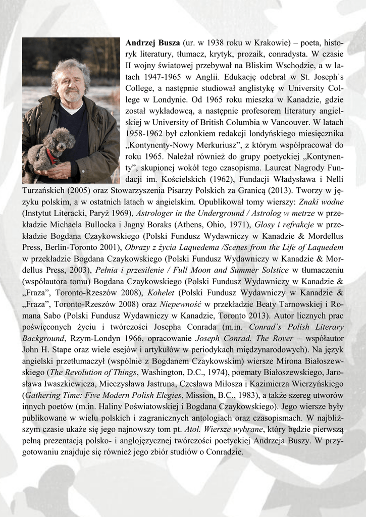 Andrzej Busza (ur. w 1938 roku w Krakowie) – poeta, historyk literatury, tłumacz, krytyk, prozaik, conradysta. W czasie II wojny światowej przebywał na Bliskim Wschodzie, a w latach 1947-1965 w Anglii. Edukację odebrał w St. Joseph`s College, a następnie studiował anglistykę w University College w Londynie. Od 1965 roku mieszka w Kanadzie, gdzie został wykładowcą, a następnie profesorem literatury angielskiej w University of British Columbia w Vancouver. W latach 1958-1962 był członkiem redakcji londyńskiego miesięcznika „Kontynenty-Nowy Merkuriusz”, z którym współpracował do roku 1965. Należał również do grupy poetyckiej „Kontynenty”, skupionej wokół tego czasopisma. Laureat Nagrody Fundacji im. Kościelskich (1962), Fundacji Władysława i Nelli Turzańskich (2005) oraz Stowarzyszenia Pisarzy Polskich za Granicą (2013). Tworzy w języku polskim, a w ostatnich latach w angielskim. Opublikował tomy wierszy: Znaki wodne (Instytut Literacki, Paryż 1969), Astrologer in the Underground / Astrolog w metrze w przekładzie Michaela Bullocka i Jagny Boraks (Athens, Ohio, 1971), Glosy i refrakcje w przekładzie Bogdana Czaykowskiego (Polski Fundusz Wydawniczy w Kanadzie & Mordellus Press, Berlin-Toronto 2001), Obrazy z życia Laquedema /Scenes from the Life of Laquedem w przekładzie Bogdana Czaykowskiego (Polski Fundusz Wydawniczy w Kanadzie & Mordellus Press, 2003), Pełnia i przesilenie / Full Moon and Summer Solstice w tłumaczeniu (współautora tomu) Bogdana Czaykowskiego (Polski Fundusz Wydawniczy w Kanadzie & „Fraza”, Toronto-Rzeszów 2008), Kohelet (Polski Fundusz Wydawniczy w Kanadzie & „Fraza”, Toronto-Rzeszów 2008) oraz Niepewność w przekładzie Beaty Tarnowskiej i Romana Sabo (Polski Fundusz Wydawniczy w Kanadzie, Toronto 2013). Autor licznych prac poświęconych życiu i twórczości Josepha Conrada (m.in. Conrad`s Polish Literary Background, Rzym-Londyn 1966, opracowanie Joseph Conrad. The Rover – współautor John H. Stape oraz wiele esejów i artykułów w periodykach międzynarodowych). Na język angielski przetłumaczył (wspólnie z Bogdanem Czaykowskim) wiersze Mirona Białoszewskiego (The Revolution of Things, Washington, D.C., 1974), poematy Białoszewskiego, Jarosława Iwaszkiewicza, Mieczysława Jastruna, Czesława Miłosza i Kazimierza Wierzyńskiego (Gathering Time: Five Modern Polish Elegies, Mission, B.C., 1983), a także szereg utworów innych poetów (m.in. Haliny Poświatowskiej i Bogdana Czaykowskiego). Jego wiersze były publikowane w wielu polskich i zagranicznych antologiach oraz czasopismach. W najbliższym czasie ukaże się jego najnowszy tom pt. Atol. Wiersze wybrane, który będzie pierwszą pełną prezentacją polsko- i anglojęzycznej twórczości poetyckiej Andrzeja Buszy. W przygotowaniu znajduje się również jego zbiór studiów o Conradzie.
