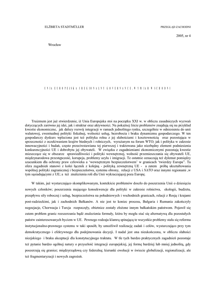 EL BIETA STADTMÜLLER PRZEGL D ZACHODNI 2005, nr 4 Wroc aw UNIA EUROPEJSKA I REGIONALNY GOVERNANCE. WYMIAR WSCHODNI Truizmem jest ju stwierdzenie, i Unia Europejska stoi na pocz tku XXI w. w obliczu zasadniczych wyzwa dotycz cych zarówno jej idei, jak i struktur oraz aktywno ci. Na poka nej li cie problemów znajduj si na przyk ad kwestie ekonomiczne, jak dalszy rozwój integracji w ramach jednolitego rynku, szczególnie w odniesieniu do unii walutowej, ewentualnej polityki fiskalnej, wolno ci us ug, bezrobocia i braku dynamizmu gospodarczego. W ten gospodarczy dyskurs wpleciona jest te polityka rolna z jej s abo ciami i kosztowno ci oraz pozostaj ca w sprzeczno ci z oczekiwaniem krajów biednych i rolniczych, wyra anym na forum WTO; jak i polityka w zakresie innowacyjno ci i bada , cz sto przeciwstawiana tej pierwszej i traktowana jako niezb dny element podniesienia konkurencyjno ci UE i dobrobytu jej obywateli. W zwi zku z zagadnieniami ekonomicznymi pozostaj kwestie mieszcz ce si w obszarze sprawiedliwo ci i polityki wewn trznej, wolno przemieszczania si obywateli UE, mi dzynarodowa przest pczo , korupcja, problemy azylu i imigracji. Te ostatnie oznaczaj te dylemat pomi dzy szacunkiem dla ochrony praw cz owieka a ‘wewn trznym bezpiecze stwem’ w granicach ‘twierdzy Europa”. Ta sfera zagadnie stanowi z kolei cznik z kolejn - polityk zewn trzn UE - a zatem prób ukszta towania wspólnej polityki zagranicznej i bezpiecze stwa, systemu obrony, relacji z USA i NATO oraz innymi regionami ,w tym s siaduj cymi z UE; a te znalezienia roli dla Unii wykraczaj cej poza Europ . W takim, ju wystarczaj co skomplikowanym, kontek cie problemów dosz o do poszerzenia Unii o dziesi ciu nowych cz onków; poszerzenia maj cego konsekwencje dla polityki w zakresie rolnictwa, ekologii, bud etu, przep ywu si y roboczej i us ug, bezpiecze stwa na po udniowych i wschodnich granicach, relacji z Rosj i krajami post-radzieckimi, jak i zachodnich Ba kanów. A nie jest to koniec procesu, Bu garia i Rumunia zako czy y negocjacje, Chorwacja i Turcja rozpocz y, obietnice zosta y z zatem problem granic rozszerzania b one innym ba ka skim pa stwom. Pojawi si znalezienia formu y, która by mog a sta si alternatyw dla pozosta ych pa stw zainteresowanych byciem w UE. Pewnego rodzaju klamr spinaj te wszystkie problemy sta a si reforma instytucjonalno-prawnego systemu w taki sposób, by umo liwi realizacj zada i celów, wystarczaj co przy tym demokratycznego i efektywnego dla podejmowania decyzji. I nadal jest ona nieuko czona, w obliczu s abo ci nicejskiego i braku akceptacji dla konstytucyjnego traktatu. W tle tych bardzo praktycznych zagadnie pozostaje te pytanie bardzo ogólnej natury o przysz integracji europejskiej, jej form bardziej lub mniej jednolit , gdy poszerzaj si granice; mi dzyrz dow czy federaln ; kierunki ewolucji w wiecie globalizacji, regionalizacji, ale te fragmentaryzacji i nowych zagro . Jak wida z powy szego przegl du istnieje daleko id ca wspó zale no mi dzy problemami wspó czesnej integracji europejskiej, dlatego nie tylko w ich rozwi zywaniu, ale i w analizach, jedynie umownie mo na zaj si wyodr bnion kwesti . Trzeba mie na uwadze ca y kompleks spraw europejskich, jak i mi dzynarodowy kontekst, warunkuj ce przedmiot opisu i analizy. W tym przypadku obiektem mojego zainteresowania staje si polityka zewn trzna Unii Europejskiej, skupiona na bezpo rednio s siaduj cych z ni uwzgl dnieniem wschodnich granic. W niniejszym artykule b stara a si po pa stwach, ze szczególnym jednak silniejszy akcent na uwarunkowania i perspektywy tej polityki ( a raczej jej pierwocin) ni na szczegó ow prezentacj dokumentów i wydarze (jest ich zreszt nie tak wiele i znalaz y ju omówienie w polskiej literaturze przedmiotu). REGIONALNY GOVERNANCE Pytanie o rol i polityk UE wobec s siadów wpisuje si w popularny obecnie, zarówno w polityce, jak i nauce dyskurs o znaczeniu ‘nowego regionalizmu’ oraz globalnego i regionalnego governance (‘rz dzenia’) systemem ( rodowiskiem) mi dzynarodowym i[1]. Unia Europejska i jej otoczenie staj si tu do wiadczalnym laboratorium, a potencjalnie modelem dla innych obszarów. Koncepcja governance ma bardzo szerokie znaczenie, st d te w literaturze naukowej znajdujemy wiele prób zdefiniowania jej, pocz wszy od definicji Jamesa Rosenau, jako zespo u mechanizmów reguluj cych dzia ania, które s efektywne nawet bez istnienia formalnej w adzy. Governance dotyczy tu tak e zasad i procedur, a zatem re imów, ale ró ni od nich, poniewa istnieje nie tylko w wyra nie okre lonych obszarach, nie odnosi si do jednostkowej sfery przedsi wzi , a jest powi zane z ca ym porz dkiem mi dzynarodowym ii[2]. Przeró ni aktorzy, rz dowi i pozarz dowi, uczestnicz w procesie governance, dzia aj c na ró nych poziomach, tworz c zmienne, elastyczne, sieci powi za , pos uguj c si niestandardowymi mechanizmami. Tego typu wspó praca by a na przyk ad widoczna podczas konferencji ONZ, jak Szczyt Ziemi w Rio (1992), konferencja ludno ciowa w Kairze (1995), ywno ciowa w Rzymie (1996) ,w których uczestniczy y - obok reprezentacji rz dów - te pozarz dowe organizacje (NGOs); czy szczyt ekologiczny i rozwoju w Johannesburgu (2002), gdzie te przybyli przedstawiciele transnarodowych korporacji (TNCs). Aczkolwiek w praktyce trudno mówi o zaistnieniu skutecznego globalnego czy mi dzynarodowego governance. Obecnie jest to raczej intelektualna konstrukcja czy moralny wybór, polegaj ce na wyobra aniu sobie przysz ci wiata w ten sposób. I to na dodatek z zastrze eniem, i to co mia oby s zbudowaniu sieci praw, norm, aktywno ci, mechanizmów, instytucjonalnych narz dzi, szerokiego uczestnictwa, prowadz cych do stabilnego porz dku i zrównowa onego rozwoju, mo e sta si zjawiskiem funkcjonuj cym w szarej strefie, poza kontrol spo ecze stw i ich instytucjonalnych reprezentacji. Taki ‘spontaniczny’ governance mo e prowadzi do dominacji najsilniejszych aktorów, co mo emy zaobserwowa w wiatowej gospodarce wolnego 