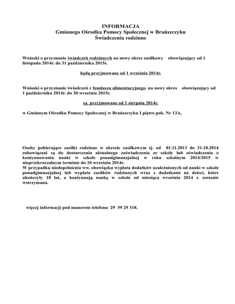 INFORMACJA Gminnego Ośrodka Pomocy Społecznej w Brańszczyku Świadczenia rodzinne Wnioski o przyznanie świadczeń rodzinnych na nowy okres zasiłkowy listopada 2014r. do 31 października 2015r. obowiązujący od 1 będą przyjmowane od 1 września 2014r. Wnioski o przyznanie świadczeń z funduszu alimentacyjnego na nowy okres 1 października 2014r. do 30 września 2015r. obowiązujący od są przyjmowane od 1 sierpnia 2014r. w Gminnym Ośrodku Pomocy Społecznej w Brańszczyku I piętro pok. Nr 13A, Osoby pobierające zasiłki rodzinne w okresie zasiłkowym tj. od 01.11.2013 do 31.10.2014 zobowiązani są do dostarczenia aktualnego zaświadczenia ze szkoły lub oświadczenia o kontynuowaniu nauki w szkole ponadgimnazjalnej w roku szkolnym 2014/2015 w nieprzekraczalnym terminie do 10 września 2014r. W przypadku niedopełnienia ww. obowiązku wypłata dodatków uzależnionych od nauki w szkole ponadgimnazjalnej lub wypłata zasiłków rodzinnych wraz z dodatkami na dzieci, które ukończyły 18 lat, a kontynuują naukę w szkole od miesiąca września 2014 r. zostanie wstrzymana. więcej informacji pod numerem telefonu 29 59 29 318. WYKAZ PODSTAWOWYCH DOKUMENTÓW DO WNIOSKU O ZASIŁEK RODZINNY I DODATKI NA OKRES ZASIŁKOWY od 01 listopada 2014 do 31 października 2015 (oryginały dokumentów do wglądu pracownika urzędu) 1. kserokopia dowodu osobistego wnioskodawcy – gdy osoba przebywa na terenie gminy Brańszczyk bez stałego zameldowania dołącza dokument potwierdzający tymczasowe zameldowanie lub zamieszkanie w miejscu pobytu; 2. w przypadku gdy rodzice dziecka lub jeden z rodziców jest zameldowany na terenie innej gminy – zaświadczenie z właściwego organu OPS,GOPS lub MOPS o nie pobieraniu świadczeń rodzinnych; 3. kserokopia skróconego odpisu aktu urodzenia dziecka- w przypadku składania wniosku po raz pierwszy; 4. zaświadczenie z Urzędu Skarbowego lub oświadczenie o osiągniętym dochodzie, podatku należnym, i składce na ubezpieczenie społeczne w 2013r. przez wszystkich pełnoletnich członków rodziny (w tym dzieci, które w 2013r. osiągnęły pełnoletność ); 5. dokument określający wysokość dochodu uzyskanego w roku 2013: a. PIT-y rozliczeniowe za rok 2013 np. PIT-11, PIT-28, PIT-40A itp. wystawione przez z-d pracy, ZUS, PUP i inne organy, b. dokument określający liczbę miesięcy w których dochód był osiągany np. zaświadczenie od pracodawcy, świadectwo pracy, decyzja o rencie, emeryturze, zaświadczenie z PUP, umowa o pracę, c. wypełniony załącznik nr 6- oświadczenie członków rodziny rozliczających się na podstawie przepisów o zryczałtowanym podatku dochodowym za 2013r. itp.; 6. zaświadczenia z ZUS lub oświadczenia pełnoletnich członków rodziny zawierające informację o wysokości składek na ubezpieczenie zdrowotne w 2013r. (w przypadku osiągniętego dochodu); 7. wypełniony załącznik nr 7- oświadczenie o dochodach niepodlegających opodatkowaniu w 2013r. (przez wszystkich pełnoletnich członków rodziny) + dokumenty stwierdzające wysokość wykazanego dochodu w 2013r, np. o stypendium na dzieci., otrzymanych alimentach, oświadczenie lub zaświadczenie właściwego organu gminy o wielkości gospodarstwa rolnego wyrażonej w hektarach przeliczeniowych ogólnej powierzchni w roku kalendarzowym poprzedzającym okres zasiłkowy albo kserokopia nakazu płatniczego za 2013 r. itp.; 8. kserokopia wyroku rozwodowego lub o separację z klauzulą prawomocności (aktualny) w przypadku osoby samotnie wychowującej dzieci; 9. kserokopia wyroku zasądzającego alimenty (aktualny)+ przekazy lub przelewy pieniężne dokumentujące faktyczną wysokość otrzymanych alimentów w 2013r.; 10. zaświadczenie Komornika Sądowego o wysokości wyegzekwowanych alimentów w 2013r.; 11. w przypadku braku zatrudnienia- oświadczenie osoby bezrobotnej potwierdzone decyzją z Powiatowego Urzędu Pracy, lub zaświadczenie z PUP (w przypadku zarejestrowanych osób bezrobotnych z prawem do zasiłku); 12. w przypadku utraty dochodu za 2013r.- dokument określający datę utraty dochodu oraz miesięczną wysokość utraconego dochodu, jeżeli dochód rodziny uległ obniżeniu na skutek utraty dochodu np. świadectwo pracy, PIT – 11, umowa zlecenie potwierdzona zaświadczeniem od pracodawcy itp. 13. w przypadku uzyskania dochodu po 01 stycznia 2014r. do dnia złożenia wniosku zaświadczenie z z-du pracy (od kiedy zatrudnienie i wysokość wynagrodzenia netto za drugi przepracowany miesiąc), w innym przypadku oświadczenie; 14. w przypadku prowadzenia działalności gospodarczej - kserokopia wpisu do ewidencji działalności gosp. lub dokument o rezygnacji z działalności gosp.; 15. zaświadczenie szkoły o uczęszczaniu dziecka do szkoły ponadgimnazjalnej; 16. orzeczenie o niepełnosprawności w przypadku gdy w rodzinie wychowuje się dziecko niepełnosprawne; 17. zaświadczenie ze specjalnego ośrodka szkolno-wychowawczego, dotyczące niezamieszkiwania dziecka niepełnosprawnego w internacie w przypadku nauki w wymienionej placówce; 18. kopię karty pobytu, w przypadku cudzoziemca przebywającego na terytorium Rzeczypospolitej Polskiej na podstawie zezwolenia na osiedlenie się, zezwolenia na pobyt rezydenta długoterminowego Wspólnot Europejskich, zezwolenia na zamieszkanie na czas oznaczony lub w związku z uzyskaniem w Rzeczypospolitej Polskiej statusu uchodźcy albo ochrony uzupełniającej; W przypadku ubiegania się o niżej wymienione dodatki należy złożyć stosowne dokumenty: 1. dodatek z tytułu urodzenia dziecka • zaświadczenie lekarskie lub zaświadczenie wystawione przez położną, potwierdzające pozostawanie matki dziecka pod opieką medyczną nie później niż od 10 tygodnia ciąży do porodu, 1. dodatek z tytułu opieki nad dzieckiem w okresie korzystania z urlopu wychowawczego • zaświadczenie od pracodawcy o terminie urlopu wychowawczego i okresie, na jaki został udzielony, oraz o okresach zatrudnienia, (co najmn