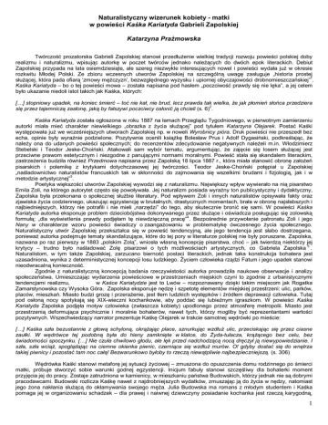 Naturalistyczny wizerunek kobiety - matki w powieści Kaśka Kariatyda Gabrieli Zapolskiej Katarzyna Prażmowska Twórczość prozatorska Gabrieli Zapolskiej stanowi przedłużenie wielkiej tradycji rozwoju powieści polskiej doby realizmu i naturalizmu, wpisując autorkę w poczet twórców jednako należących do dwóch epok literackich. Debiut Zapolskiej przypada na lata osiemdziesiąte, ale szereg niezwykle interesujących nowel i powieści wydała już w okresie rozkwitu Młodej Polski. Ze zbioru wczesnych utworów Zapolskiej na szczególną uwagę zasługuje „historia prostej 1 służącej, która pada ofiarą ‘zmowy mężczyzn’, bezwzględnego wyzysku i upiornej obyczajowości drobnomieszczańskiej” . Kaśka Kariatyda – bo o tej powieści mowa – została napisana pod hasłem „poczciwość prawdy się nie lęka”, a jej celem było ukazanie niedoli istot takich jak Kaśka, których: […] stopniowy upadek, na koniec śmierć – toć nie kał, nie brud, lecz prawda tak wielka, że jak płomień słońca przedziera się przez tajemniczą zasłonę, jaką by fałszywi poczciwcy osłonić ją chcieli (s. 6)2. Kaśka Kariatyda została ogłoszona w roku 1887 na łamach Przeglądu Tygodniowego, w pierwotnym zamierzeniu autorki miała mieć charakter niewielkiego „obrazka z życia służącej” pod tytułem Katarzyna Olejarek. Postać Kaśki występowała już we wcześniejszych utworach Zapolskiej np. w noweli Wyrobnicy pióra. Druk powieści nie przeszedł bez echa, opinie były wyraźnie podzielone. Pozytywnie ocenili książkę Bolesław Prus i Adolf Dygasiński, podkreślając, że należy ona do udanych powieści społecznych; do recenzentów zdecydowanie negatywnych należeli m.in. Włodzimierz Stebelski i Teodor Jeske-Choiński. Atakowali sam wybór tematu, argumentując, że zajęcie się losem służącej jest przeciwne prawom estetycznym i niezgodne z panującymi normami moralnymi. Powieść stała się skandalem literackim, zastrzeżenia budziła również Przedmowa napisana przez Zapolską 18 lipca 1887 r., która miała stanowić obronę założeń pisarskich i polemikę z krytykami dotychczasowej jej twórczości. Teodor Jeske-Choiński potępiał u Zapolskiej „naśladownictwo naturalistów francuskich tak w skłonności do zajmowania się wszelkimi brudami i fizjologią, jak i w metodzie artystycznej”3. Poetyka większości utworów Zapolskiej wywodzi się z naturalizmu. Największy wpływ wywierało na nią pisarstwo Emila Zoli, na którego autorytet często się powoływała. Jej naturalizm posiada wyraźny ton publicystyczny i dydaktyczny, Zapolska była przekonana o społecznej służbie literatury. Pod wpływem Zoli i innych naturalistów opisywała fakty oraz zjawiska życia codziennego, ukazując egzystencję w brutalnych, drastycznych momentach, brała w obronę najsłabszych i najbiedniejszych, którzy nie potrafili i nie mieli „narzędzi” do tego, aby skutecznie bronić się sami. W powieści Kaśka Kariatyda autorka eksponuje problem dzieciobójstwa dokonywanego przez służące i oświadcza posługując się zolowską formułą: „dla wyświetlenia prawdy podjęłam tę niewdzięczną pracę”4. Bezpośrednie przywołanie patronatu Zoli i jego Nany w charakterze wzoru powieści świadczy o zaangażowaniu w problematykę ówczesnego życia społecznego. Naturalistyczny utwór Zapolskiej przekształca się w powieść tendencyjną, ale jego tendencja jest słabo dostrzegana, ponieważ autorka podejmuje tematy skandalizujące, które do tej pory w literaturze polskiej nie były poruszane. Zapolska, nazwana po raz pierwszy w 1883 „polskim Zolą”, wniosła własną koncepcję pisarstwa, choć – jak twierdzą niektórzy jej krytycy – trudno było naśladować Zolę pisarzowi o tych możliwościach artystycznych, co Gabriela Zapolska 5 . Naturalistom, w tym także Zapolskiej, zarzucano bierność postaci literackich, jednak taka konstrukcja bohatera jest uzasadniona, wynika z deterministycznej koncepcji losu ludzkiego. Życiem człowieka rządzi Fatum i jego upadek stanowi nieodwracalną konieczność. Zgodnie z naturalistyczną koncepcją badania rzeczywistości autorka prowadziła naukowe obserwacje i analizy społeczeństwa. Umieszczając wydarzenia powieściowe w przestrzeniach miejskich czyni to zgodnie z urbanistycznymi tendencjami realizmu, w Kaśce Kariatydzie jest to Lwów – rozpoznawany dzięki takim miejscom jak Rogatka Zamarstynowska czy Wysoka Góra. Zapolska eksponuje nędzę i szpetotę elementów miejskiej przestrzeni: ulic, parków, placów, mieszkań. Miasto budzi grozę i przerażenie, jest tłem ludzkich występków i źródłem deprawacji człowieka. Tutaj pod osłoną nocy spotykają się XIX-wieczni kochankowie, aby poddać się lubieżnym igraszkom. W powieści Kaśka Kariatyda Zapolska podjęła motyw człowieka (zwłaszcza kobiety) upodlonego przez atmosferę metropolii. Miasto jest przestrzenią deformująca psychicznie i moralnie bohaterów, nawet tych, którzy mogliby być reprezentantami wartości pozytywnych. Wszechwiedzący narrator prezentuje Kaśkę Olejarek w trakcie samotnej wędrówki po mieście: […] Kaśka szła bezustannie z głową schyloną, okrążając place, sznurkując wzdłuż ulic, przeciskając się przez ciasne zaułki. W wędrówce tej podobną była do hieny zamknięte w klatce, do Żyda-tułacza, krążącego bez celu, bez świadomości spoczynku. […] Nie czuła chwilowo głodu, ale lęk przed nadchodzącą nocą dręczył ją niewypowiedzianie. I szła, szła wciąż, spoglądając na ciemne okienka piwnic, czerniące się wzdłuż murów. O! gdyby dostać się do wnętrza takiej piwnicy i pozostać tam noc całą! Bezwarunkowo byłoby to rzeczą niewątpliwie najbezpieczniejszą. (s. 306) Wędrówka Kaśki stanowi metaforę jej sytuacji życiowej – zmuszona do opuszczenia domu rodzinnego po śmierci matki, próbuje stworzyć sobie warunki godnej egzystencji. Inicjum fab