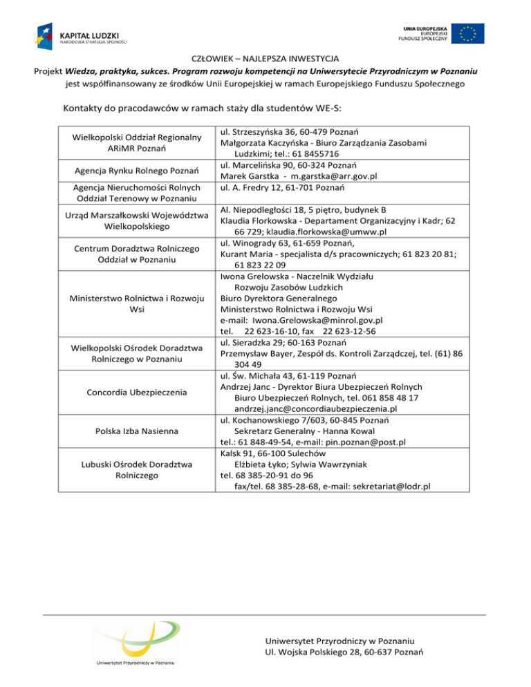 CZŁOWIEK – NAJLEPSZA INWESTYCJA Projekt Wiedza, praktyka, sukces. Program rozwoju kompetencji na Uniwersytecie Przyrodniczym w Poznaniu jest współfinansowany ze środków Unii Europejskiej w ramach Europejskiego Funduszu Społecznego Kontakty do pracodawców w ramach staży dla studentów WE-S: Wielkopolski Oddział Regionalny ARiMR Poznań Agencja Rynku Rolnego Poznań Agencja Nieruchomości Rolnych Oddział Terenowy w Poznaniu Urząd Marszałkowski Województwa Wielkopolskiego Centrum Doradztwa Rolniczego Oddział w Poznaniu Ministerstwo Rolnictwa i Rozwoju Wsi Wielkopolski Ośrodek Doradztwa Rolniczego w Poznaniu Concordia Ubezpieczenia Polska Izba Nasienna Lubuski Ośrodek Doradztwa Rolniczego ul. Strzeszyńska 36, 60-479 Poznań Małgorzata Kaczyńska - Biuro Zarządzania Zasobami Ludzkimi; tel.: 61 8455716 ul. Marcelińska 90, 60-324 Poznań Marek Garstka - [email protected] ul. A. Fredry 12, 61-701 Poznań Al. Niepodległości 18, 5 piętro, budynek B Klaudia Florkowska - Departament Organizacyjny i Kadr; 62 66 729; [email protected] ul. Winogrady 63, 61-659 Poznań, Kurant Maria - specjalista d/s pracowniczych; 61 823 20 81; 61 823 22 09 Iwona Grelowska - Naczelnik Wydziału Rozwoju Zasobów Ludzkich Biuro Dyrektora Generalnego Ministerstwo Rolnictwa i Rozwoju Wsi e-mail: [email protected] tel. 22 623-16-10, fax 22 623-12-56 ul. Sieradzka 29; 60-163 Poznań Przemysław Bayer, Zespół ds. Kontroli Zarządczej, tel. (61) 86 304 49 ul. Św. Michała 43, 61-119 Poznań Andrzej Janc - Dyrektor Biura Ubezpieczeń Rolnych Biuro Ubezpieczeń Rolnych, tel. 061 858 48 17 [email protected] ul. Kochanowskiego 7/603, 60-845 Poznań Sekretarz Generalny - Hanna Kowal tel.: 61 848-49-54, e-mail: [email protected] Kalsk 91, 66-100 Sulechów Elżbieta Łyko; Sylwia Wawrzyniak tel. 68 385-20-91 do 96 fax/tel. 68 385-28-68, e-mail: [email protected] Uniwersytet Przyrodniczy w Poznaniu Ul. Wojska Polskiego 28, 60-637 Poznań