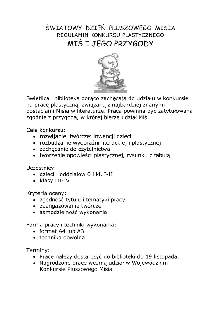 ŚWIATOWY DZIEŃ PLUSZOWEGO MISIA REGULAMIN KONKURSU PLASTYCZNEGO MIŚ I JEGO PRZYGODY Świetlica i biblioteka gorąco zachęcają do udziału w konkursie na pracę plastyczną związaną z najbardziej znanymi postaciami Misia w literaturze. Praca powinna być zatytułowana zgodnie z przygodą, w której bierze udział Miś. Cele konkursu: rozwijanie twórczej inwencji dzieci rozbudzanie wyobraźni literackiej i plastycznej zachęcanie do czytelnictwa tworzenie opowieści plastycznej, rysunku z fabułą Uczestnicy: dzieci oddziałów 0 i kl. I-II klasy III-IV Kryteria oceny: zgodność tytułu i tematyki pracy zaangażowanie twórcze samodzielność wykonania Forma pracy i techniki wykonania: format A4 lub A3 technika dowolna Terminy: Prace należy dostarczyć do biblioteki do 19 listopada. Nagrodzone prace wezmą udział w Wojewódzkim Konkursie Pluszowego Misia Propozycje książek o misiach Michael Bond - seria o Misiu Paddingtonie Joanna Chmielewska "Pafnucy: opowieści o dobrym niedźwiedziu" Honorata Chróścielewska "Pożegnanie z misiem" " Czesław Janczarski - seria o Misiu Uszatku Janosch "Ach, jak cudowna jest Panama" i inne z serii o Misiu i Tygrysku Rudyard Kipling "Księga dżungli" Gosta Knutsson "Nalle, wesoły niedźwiadek" Aleksander Alan Milne "Kubuś Puchatek"; "Chatka Puchatka" Janina Porazińska "Pamiętnik Czarnego Noska" Ewa Szelburg-Zarembina "Przygoda Misia" Anna Szymanowska "Przygody misia Guziczka" Bogusław Zeman "Opowieści misia Tulisia: bajki dla chorusków i nie tylko POWODZENIA