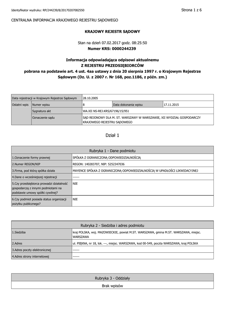 Strona 1 z 6 Identyfikator wydruku: RP/244239/8/20170207082550 CENTRALNA INFORMACJA KRAJOWEGO REJESTRU SĄDOWEGO KRAJOWY REJESTR SĄDOWY Stan na dzień 07.02.2017 godz. 08:25:50 Numer KRS: 0000244239 Informacja odpowiadająca odpisowi aktualnemu Z REJESTRU PRZEDSIĘBIORCÓW pobrana na podstawie art. 4 ust. 4aa ustawy z dnia 20 sierpnia 1997 r. o Krajowym Rejestrze Sądowym (Dz. U. z 2007 r. Nr 168, poz.1186, z późn. zm.) Data rejestracji w Krajowym Rejestrze Sądowym 28.10.2005 Ostatni wpis Numer wpisu 8 Sygnatura akt WA.XII NS-REJ.KRS/67196/15/951 Oznaczenie sądu SĄD REJONOWY DLA M. ST. WARSZAWY W WARSZAWIE, XII WYDZIAŁ GOSPODARCZY KRAJOWEGO REJESTRU SĄDOWEGO Data dokonania wpisu 17.11.2015 Dział 1 Rubryka 1 - Dane podmiotu 1.Oznaczenie formy prawnej SPÓŁKA Z OGRANICZONĄ ODPOWIEDZIALNOŚCIĄ 2.Numer REGON/NIP REGON: 140283707, NIP: 5252347036 3.Firma, pod którą spółka działa MAYENCE SPÓŁKA Z OGRANICZONĄ ODPOWIEDZIALNOŚCIĄ W UPADŁOŚCI LIKWIDACYJNEJ 4.Dane o wcześniejszej rejestracji ------ 5.Czy przedsiębiorca prowadzi działalność gospodarczą z innymi podmiotami na podstawie umowy spółki cywilnej? NIE 6.Czy podmiot posiada status organizacji pożytku publicznego? NIE Rubryka 2 - Siedziba i adres podmiotu 1.Siedziba kraj POLSKA, woj. MAZOWIECKIE, powiat M.ST. WARSZAWA, gmina M.ST. WARSZAWA, miejsc. WARSZAWA 2.Adres ul. PIĘKNA, nr 18, lok. ---, miejsc. WARSZAWA, kod 00-549, poczta WARSZAWA, kraj POLSKA 3.Adres poczty elektronicznej ------ 4.Adres strony internetowej ------ Rubryka 3 - Oddziały Brak wpisów Strona 2 z 6 Identyfikator wydruku: RP/244239/8/20170207082550 Rubryka 4 - Informacje o umowie 1.Informacja o zawarciu lub zmianach umowy spółki 1 12.10.2005 NOTARIUSZ WOJCIECH SZCZYPKOWSKI, KANCELARIA NOTARIALNA W WARSZAWIE, UL.ŁUCKA 18 LOK.12, WARSZAWA, REP.A NR 5222/2005 2 21.12.2005R. REP. A NR 8017/2005, WOJCIECH SZCZYPKOWSKI, NOTARIUSZ W WARSZAWIE, KANCELARIA NOTARIALNA PRZY UL. ŁUCKIEJ 18 LOK.12, 00-845 WARSZAWA ZMIANA PAR.2, PAR.6, PAR.11 ORAZ PRZYJĘCIE TEKSTU JEDNOLITEGO AKTU ZAŁOŻYCIELSKIEGO 03.01.2006R., REP. A NR 13/2006, WOJCIECH SZCZYPKOWSKI, NOTARIUSZ W WARSZAWIE, KANCELARIA NOTARIALNA PRZY UL. ŁUCKIEJ 18 LOK.12, 00-845 WARSZAWA ZMIANA PAR.2 ORAZ PRZYJĘCIE TEKSTU JEDNOLITEGO AKTU ZAŁOŻYCIELSKIEGO 3 22.01.2008 REPERTORIUM A NR 1398/2008, ASESOR NOTARIALNY PIOTR WÓJCIK, ZASTĘPCA ARTURA KĘDZIERSKIEGO, NOTARIUSZA W WARSZAWIE, KANCELARIA NOTARIALNA W WARSZAWIE, UL.ŁUCKA ZMIANA §2 4 23.12.2011 R., REP. A NR 3497/2011, NOTARIUSZ ANNA GĄSIENNICKA, KANCELARIA NOTARIALNA W KRAKOWIE, ZMIANA § 29 Rubryka 5 1.Czas, na jaki została utworzona spółka NIEOZNACZONY 2.Oznaczenie pisma innego niż Monitor Sądowy i Gospodarczy, przeznaczonego do ogłoszeń spółki ------ 3.Wspólnik może mieć: WIĘKSZĄ LICZBĘ UDZIAŁÓW 4.Czy statut przyznaje uprawnienia osobiste określonym akcjonariuszom lub tytuły uczestnictwa w dochodach lub majątku spółki nie wynikających z akcji? ***** 5.Czy obligatoriusze mają prawo do udziałów w zysku? ***** Rubryka 6 - Sposób powstania spółki Brak wpisów Rubryka 7 - Dane wspólników 1 1.Nazwisko / Nazwa lub firma MAYENCE S.A. 2.Imiona ***** 3.Numer PESEL/REGON --- 4.Numer KRS ---------- 5.Posiadane przez wspólnika udziały 500 (PIĘĆSET) UDZIAŁÓW O ŁĄCZNEJ WARTOŚCI 50.000 PLN (PIĘĆDZIESIĄT TYSIĘCY ZŁOTYCH) 6.Czy wspólnik posiada całość udziałów spółki? TAK Rubryka 8 - Kapitał spółki Strona 3 z 6 Identyfikator wydruku: RP/244239/8/20170207082550 1.Wysokość kapitału zakładowego 50 000,00 ZŁ Podrubryka 1 Informacja o wniesieniu aportu Brak wpisów Rubryka 9 - Nie dotyczy Brak wpisów Rubryka 10 - Nie dotyczy Brak wpisów Dział 2 Rubryka 1 - Organ uprawniony do reprezentacji podmiotu 1.Nazwa organu uprawnionego do reprezentowania podmiotu ZARZĄD 2.Sposób reprezentacji podmiotu DO REPREZENTOWANIA SPÓŁKI UPRAWNIONY JEST KAŻDY CZŁONEK ZARZĄDU DZIAŁAJĄCY SAMODZIELNIE Podrubryka 1 Dane osób wchodzących w skład organu 1 2 1.Nazwisko / Nazwa lub Firma FREMONT 2.Imiona VINCENT PIERRE EMILE 3.Numer PESEL/REGON --- 4.Numer KRS **** 5.Funkcja w organie reprezentującym CZŁONEK ZARZĄDU 6.Czy osoba wchodząca w skład zarządu została zawieszona w czynnościach? NIE 7.Data do jakiej została zawieszona ------ 1.Nazwisko / Nazwa lub Firma BECQ DE FOUQUIERES 2.Imiona XAVIER 3.Numer PESEL/REGON --- 4.Numer KRS **** 5.Funkcja w organie reprezentującym CZŁONEK ZARZĄDU 6.Czy osoba wchodząca w skład zarządu została zawieszona w czynnościach? NIE 7.Data do jakiej została zawieszona ------ Rubryka 2 - Organ nadzoru Brak wpisów Strona 4 z 6 Identyfikator wydruku: RP/244239/8/20170207082550 Rubryka 3 - Prokurenci Brak wpisów Dział 3 Rubryka 1 - Przedmiot działalności 1.Przedmiot przeważającej działalności przedsiębiorcy 1 --- 2.Przedmiot pozostałej działalności przedsiębiorcy 1 22, , , DZIAŁALNOŚĆ WYDAWNICZA; POLIGRAFIA I REPRODUKCJA ZAPISANYCH NOŚNIKÓW INFORMACJI 2 70, , , OBSŁUGA NIERUCHOMOŚCI 3 74, 13, Z, BADANIE RYNKU I OPINII PUBLICZNEJ 4 74, 14, A, DORADZTWO W ZAKRESIE PROWADZENIA DZIAŁALNOŚCI GOSPODARCZEJ I ZARZĄDZANIA 5 74, 14, B, ZARZĄDZANIE I KIEROWANIE W ZAKRESIE PROWADZENIA DZIAŁALNOŚCI GOSPODARCZEJ 6 74, 15, Z, DZIAŁALNOŚĆ HOLDINGÓW 7 74, 40, Z, REKLAMA 8 74, 87, B, DZIAŁALNOŚĆ KOMERCYJNA POZOSTAŁA, GDZIE INDZIEJ NIESKLASYFIKOWANA 9 92, 11, Z, PRODUKCJA FILMÓW I NAGRAŃ WIDEO 10 72, 60, Z, DZIAŁALNOŚĆ ZWIĄZANA Z INFORMATYKĄ, POZOSTAŁA 11 51, 90, Z, POZOSTAŁA SPRZEDAŻ HURTOWA 12 51, 18, Z, DZIAŁALNOŚĆ AGENTÓW SPECJALIZUJĄCYCH SIĘ W SPRZEDAŻY OKREŚLONEGO TOWARU LUB OKREŚLONEJ GRUPY TOWARÓW, GDZIE INDZIEJ NIESKLASYFIKOWANA 13 51, 19, Z, DZIAŁALNOŚĆ AGENTÓW ZAJMUJĄCYCH SIĘ SPRZEDAŻĄ TOWARÓW RÓŻNEGO RODZAJU Rubryka 2 - Wzmianki o złożonych dokumentach Rodzaj dokumentu Nr kolejny w polu Data złożenia Za okres od do 1.Wzmianka o złożeniu rocznego sprawozdania finansowego 1 28.05.2015 OD 01.07.2013