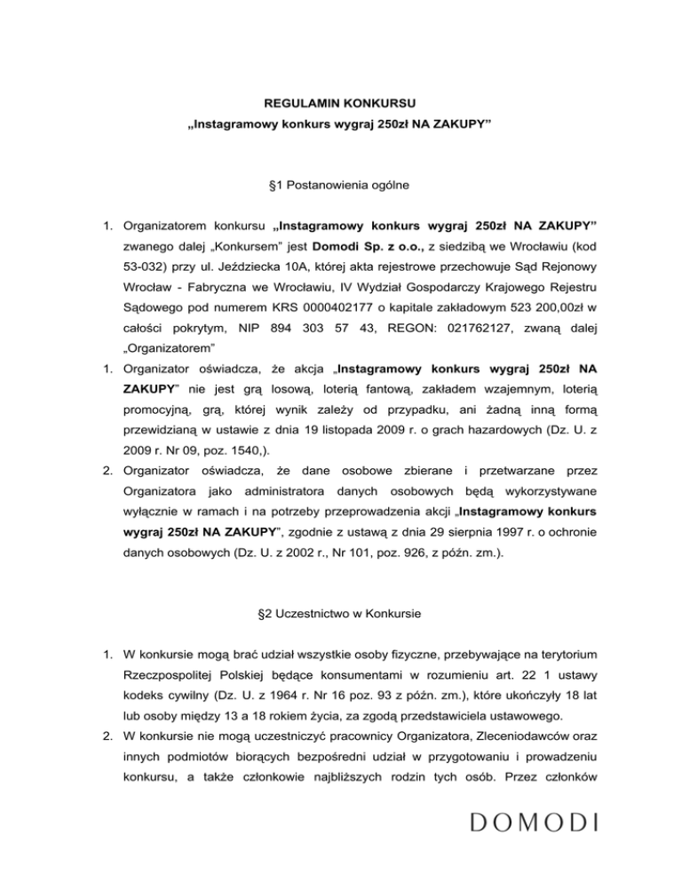 REGULAMIN KONKURSU „Instagramowy konkurs wygraj 250zł NA ZAKUPY” §1 Postanowienia ogólne 1. Organizatorem konkursu „Instagramowy konkurs wygraj 250zł NA ZAKUPY” zwanego dalej „Konkursem” jest Domodi Sp. z o.o., z siedzibą we Wrocławiu (kod 53032) przy ul. Jeździecka 10A, której akta rejestrowe przechowuje Sąd Rejonowy Wrocław Fabryczna we Wrocławiu, IV Wydział Gospodarczy Krajowego Rejestru Sądowego pod numerem KRS 0000402177 o kapitale zakładowym 523 200,00zł w całości pokrytym, NIP 894 303 57 43, REGON: 021762127, zwaną dalej „Organizatorem” 1. Organizator oświadcza, że akcja „ Instagramowy konkurs wygraj 250zł NA ZAKUPY ” nie jest grą losową, loterią fantową, zakładem wzajemnym, loterią promocyjną, grą, której wynik zależy od przypadku, ani żadną inną formą przewidzianą w ustawie z dnia 19 listopada 2009 r. o grach hazardowych (Dz. U. z 2009 r. Nr 09, poz. 1540,). 2. Organizator oświadcza, że dane osobowe zbierane i przetwarzane przez Organizatora jako administratora danych osobowych będą wykorzystywane wyłącznie w ramach i na potrzeby przeprowadzenia akcji „ Instagramowy konkurs wygraj 250zł NA ZAKUPY ”, zgodnie z ustawą z dnia 29 sierpnia 1997 r. o ochronie danych osobowych (Dz. U. z 2002 r., Nr 101, poz. 926, z późn. zm.). §2 Uczestnictwo w Konkursie 1. W konkursie mogą brać udział wszystkie osoby fizyczne, przebywające na terytorium Rzeczpospolitej Polskiej będące konsumentami w rozumieniu art. 22 1 ustawy kodeks cywilny (Dz. U. z 1964 r. Nr 16 poz. 93 z późn. zm.), które ukończyły 18 lat lub osoby między 13 a 18 rokiem życia, za zgodą przedstawiciela ustawowego. 2. W konkursie nie mogą uczestniczyć pracownicy Organizatora, Zleceniodawców oraz innych podmiotów biorących bezpośredni udział w przygotowaniu i prowadzeniu konkursu, a także członkowie najbliższych rodzin tych osób. Przez członków najbliższej rodziny rozumie się: wstępnych, zstępnych, rodzeństwo, małżonków, małżonków rodzeństwa, rodziców, małżonków, krewnych i powinowatych do drugiego stopnia i osoby pozostające w stosunku przysposobienia. 3. Udział w konkursie jest bezpłatny. §3 Zasady uczestnictwa w konkursie 1. Aby wziąć udział w Konkursie należy: ○ Zostać followersem Domodi na Instagramie profil @domodipl ○ Zostawić komentarz pod postem konkursowym z odpowiedzią na pytanie: jakie buty na jesień wybierasz i dlaczego? 2. Każdy uczestnik konkursu może dodać nieograniczoną ilość komentarzy. 3. Udział w Konkursie jest bezpłatny. 4. Zgłoszenie do Konkursu jest równoznaczne z przyjęciem przez Uczestnika warunków niniejszego Regulaminu po spełnieniu powyższych kryteriów uczestnictwa w konkursie. Przez zgłoszenie do Konkursu uczestnik akceptuje treść Regulaminu oraz warunki Konkursu opublikowane w treści ogłoszenia Konkursu i zobowiązuje się stosować warunki i zasady określone w w/w ogłoszeniu oraz w Regulaminie dla przeprowadzenia Konkursu. 5. Uczestnik konkursu przesyłając zgłoszenie do konkursu oświadcza, iż przysługują mu wyłączne i nieograniczone prawa autorskie do przesłanych prac konkursowych, które są przejawem jego własnej indywidualnej twórczości o oryginalnym charakterze i są wolne od wad fizycznych i prawnych oraz roszczeń podmiotów trzecich oraz oświadcza, że uzyskał wszelkie zezwolenia lub zgody prawem wymagane na korzystanie z przesłanych prac, o ile są one konieczne lub potrzebne dla ich wykorzystywania przez Organizatora. W przypadku, gdyby oświadczenia, o których mowa powyżej okazały się niezgodne ze stanem faktycznym i/lub prawnym osoba, która nadesłała zgłoszenie, w przypadku ewentualnych roszczeń osób trzecich, ponosi wyłączną i całkowitą odpowiedzialność oraz oświadcza, że ureguluje wszystkie związane z tym faktem poniesione przez Organizatora szkody. Ponadto, w sytuacji o której mowa powyżej, osoba ta podlega dyskwalifikacji z konkursu i zobowiązana jest do niezwłocznego zwrotu przyznanej przez Organizatora nagrody. Uczestnik oświadcza, że wyraża zgodę na wielokrotne (nieograniczone ilościowo, czasowo i terytorialnie) oraz nieodpłatne korzystanie w całości jak i w dowolnie wybranych fragmentach z jego pracy konkursowej (zgłoszenia) przez Organizatora oraz firmy powiązane z Organizatorem kapitałowo lub osobowo w sposób pośredni lub bezpośredni jak również przez podmioty wskazane przez Organizatora na wszystkich znanych polach eksploatacji, a w szczególności: ○ Utrwalanie i zwielokrotnianie drukiem lub podobną techniką, w tym fotokopiowanie i mikrokopiowanie; ○ Wydawanie (publikowanie) i rozpowszechnianie we wszystkich wydaniach, niezależnie od formy, standardu, systemu lub formatu, bez ograniczenia liczby nakładów, wydań oraz egzemplarzy; obejmuje to także prawo do częściowego lub całkowitego przedruku (przed i po produkcji), w tym na fotokopiach, mikrokopiach i mikroreprodukcjach, a także do powielania w inny sposób; ○ Wprowadzanie do pamięci komputera i sporządzanie kopii takich zapisów dla potrzeb eksploatacji oraz trwała lub czasowe zwielokrotnianie komputerowego zapisu w całości lub w części dowolnymi środkami i w dowolnej formie; ○ Wykorzystywanie do celów marketingowych, w tym reklamy, promocji, oznaczenia lub identyfikacji Organizatora; obejmuje to również utrwalanie i zwielokrotnianie poligraficzne oraz wykorzystanie tych utrwaleń; utrwalanie audiowizualne dowolną techniką niezależnie do standardu, systemu i formatu; nadanie za pomocą wizji lub fonii przewodowej lub bezprzewodowej przy pomocy dowolnych środków technicznych, w tym nadawanie za pośrednictwem satelity; nagrywanie na urządzeniach służących do wielokrotnego odtwarzania za pomocą nośników dźwięku i obrazu, w tym powielania, rozpowszechniania i odtwarzania nagrań, przekazywanie, odtwarzanie i emitowanie w audycjach w środkach masowego przekazu, po utrwaleniu na nośni