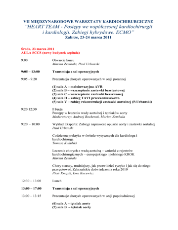 VII MIĘDZYNARODOWE WARSZTATY KARDIOCHIRURGICZNE ”HEART TEAM - Postępy we współczesnej kardiochirurgii i kardiologii. Zabiegi hybrydowe. ECMO” Zabrze, 23-24 marca 2011 Środa, 23 marca 2011 AULA SCCS (nowy budynek szpitala) 9:00 Otwarcie kursu Marian Zembala, Paul Urbanski 9:05 – 13:00 Transmisja z sal operacyjnych 9:05 - 9:20 Prezentacja chorych operowanych w sesji porannej (1) sala A – małoinwazyjna AVR (2) sala B – wszczepienie zastawki bezstentowej (3) sala C – wszczepienie zastawki bezszwowej (4) sala H – zabieg TAVI przezkoniuszkowo (5) sala V – zabieg rekonstrukcji zastawki aortalnej (P.Urbanski) 9:20 12:30 I Sesja Postępy w leczeniu wady aortalnej i tętniaków aorty Moderatorzy: Andrzej Bochenek, Marian Zembala 9:20 - 10:00 Wykład Eksperta: Zabiegi naprawcze opuszki aorty i zastawki aortalnej Paul Urbanski Codzienna praktyka w świetle wytycznych dla kardiologa i kardiochirurga Tomasz Kukulski Leczenie chorych z wadą aortalną – wnioski z rejestrów kardiochirurgicznych – europejskiego i polskiego KROK Marian Zembala Chory starszy, trudniejszy, jak przewidzieć ryzyko i jak się do niego przygotować. Zabrzańskie doświadczenia roku 2010 Piotr Knapik, Ewa Kucewicz 12:30 – 13:00 Lunch 13:00 – 17:00 Transmisja z sal operacyjnych 13:00 – 13:15 Prezentacje chorych operowanych w sesji popołudniowej (6) sala A – tętniak aorty (7) sala B – tętniak aorty (8) sala C – tętniak aorty (9) sala H – zabieg hybrydowy AAA sala V – zabieg rekonstrukcji zastawki aortalnej (P.Urbanski) 13:15– 16:00 II Sesja Postępy w leczeniu wad serca i tętniaków aorty Moderatorzy: Tomasz Kukulski, Stanisław Woś Dwupłatkowa zastawka aortalna – ocena kardiologa i kardiochirurga Witold Streb, Jacek Wojarski Dyna-CT – kiedy i dlaczego pomaga w diagnostyce chorób aorty? Jan Głowacki Modelowanie przepływu przez zastawkę aortalną Zbigniew Nawrat, Zbigniew Małota Doświadczenie w zastosowaniu zastawki bezszwowej Perceval Tomasz Niklewski Leczenie przeciwkrzepliwe i antyagregacyjne u chorych ze sztuczną zastawką – jakie wytyczne nas obowiązują i kiedy? Przemysław Trzeciak, Jerzy Foremny Leczenie przeciwkrzepliwe i antyagregacyjne po zabiegach PCI i TAVI Piotr Chodór, Wiktor Kuliczkowski 16:00 – 16:30 Przerwa kawowa 16:30 – 18:00 III Sesja Dzielimy się doświadczeniem 1. Zabiegi oszczędzające zastawkę aortalną – kiedy, dlaczego i w jaki sposób? 2. Zabiegi hybrydowe w tętniakach aorty Moderatorzy: Paul Urbanski, Marek Jasiński Uczestnicy panelu: Romuald Cichoń, Marek Cisowski, Bogusław Kapelak, Maciej Kolowca, Marcin Krasoń, Wiktor Kuliczkowski, Jan Głowacki, Roman Przybylski 18:00 Podsumowanie Marian Zembala, Ewa Kucewicz, Paul Urbanski 19:00 Biesiada górnicza „TEAMWORK” w Kopalni GUIDO Czwartek, 24 marca 2011 AULA SCCS (nowy budynek szpitala) 8:30 – 8:45 Raport dyżurnych anestezjologa, kardiochirurga i kardiologa 8:45 – 12:30 Transmisja z sal operacyjnych 8:45 – 9:00 Prezentacja przypadków operowanych w sesji porannej (10) sala A – MV plast + … w kardiomiopatii (11) sala B – Małoinwazyjna chirurgiczna ablacja (12) sala C – PAVTI (12) sala H – małoinwazyjna MV (P.Perier) (13) sala V – CABG + MV plast 9:00 – 12:30 IV Sesja Postępy w chirurgii wady mitralnej i trójdzielnej Moderatorzy: Andrzej Biedermann, Paul Urbanski 9:00 – 9:30 Wykład Eksperta: Mitral valve repair –lessons from experience Patrick Perier Co wynika z obowiązujących wytycznych MV, TV. Naprawiać, wymieniać, kiedy? Tomasz Kukulski MitraClip - alternatywne możliwości naprawy MV u chorych dużego ryzyka Zbigniew Kalarus Wyniki wczesne i odległe leczenia operacyjnego metodą Perier chorych z zespołem Ebsteina Jacek Pająk, Jarosław Rycaj Nowe wytyczne GUCH – 2010 – ważne dla kardiochirurga Szymon Pawlak Chory z insulinozależną cukrzycą – niedoceniany problem. Dlaczego kontrolowana insulinoterapia może pomóc? Jerzy Foremny, Małgorzata Kędzierska Plastyka mitralna w zabiegach chirurgicznego leczenia kardiomiopatii pozawałowej Roman Przybylski 12:30 – 13:00 Lunch 13:00 – 14:30 V Sesja HEART TEAM szansa dla chorych leczących – dlaczego potrzebujemy sal hybrydowych? Moderatorzy: Jacek Różański, Marian Zembala Małoinwazyjne i hybrydowe operacje wieńcowe Krzysztof Filipiak, Mariusz Gąsior Małoinwazyjne i hybrydowe operacje tętniaków aorty. Stentgrafty aortalne Marcin Krasoń, Roman Przybylski Hybrydowe operacje zastawkowe u chorych dużego ryzyka (TAVI przezkoniuszkowe i przeznaczyniowe) Krzysztof Wilczek, Piotr Chodór, Roman Przybylski Możliwości i nadzieje wobec zabiegów małoinwazyjnych PAVTI Małgorzata Szkutnik, Jacek Kusa Migotanie przedsionków 2010 - nowe wytyczne Radosław Lenarczyk, Piotr Buchta Małoinwazyjne leczenie utrwalonego migotania przedsionków i zabiegi hybrydowe Zbigniew Kalarus, Michał Zembala 14:30 – 14:45 Przerwa kawowa 15:00 – 17:00 Prezentacja pracowni biosymulatorów zabiegów: PCI wieńcowych, szyjnych, nerkowych, naczyniowych, obwodowych, zastawkowych, echokardiografii przezprzełykowej, w celu diagnostyki wad, funkcji serca, ale także np. pozycjonowania położenia kaniul ECMO resuscytacji krążeniowo-oddechowej. (Ośrodek Naukowo-Dydaktyczny i Nowych Technologii Medycznych SCCS) 15:00 – 16:30 VI Sesja Rola i możliwości ECMO w ratowaniu chorych z ostrą niewydolnością oddechową także w przebiegu powikłań grypy A H1 N1 (sesja dla anestezjologów, kardiochirurgów i perfuzjonistów) Moderatorzy: Piotr Knapik, Andrzej Sosnowski, Szymon Pawlak Wskazania do zastosowania ECMO u dorosłych. Przebieg pandemii grypy w Australii, Kanadzie i Polsce – doświadczenia i wnioski Andrzej Sosnowski, Piotr Knapik Kiedy żylno-żylne ECMO, a kiedy żylno tętnicze? Szymon Pawlak Techniczne aspekty ECMO i rola perfuzjonistów nad jego funkcjonowaniem Grzegorz Włoczka, Marcin Borowiec 17:00 Zakończenie 2-dniowych warsztatów