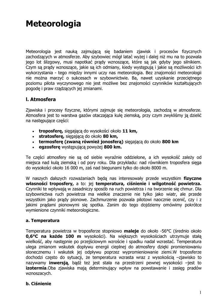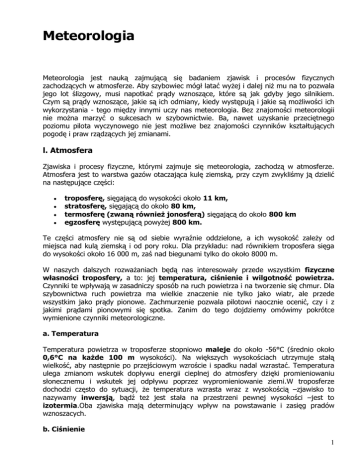 Meteorologia Meteorologia jest nauką zajmującą się badaniem zjawisk i procesów fizycznych zachodzących w atmosferze. Aby szybowiec mógł latać wyżej i dalej niż mu na to pozwala jego lot ślizgowy, musi napotkać prądy wznoszące, które są jak gdyby jego silnikiem. Czym są prądy wznoszące, jakie są ich odmiany, kiedy występują i jakie są możliwości ich wykorzystania - tego między innymi uczy nas meteorologia. Bez znajomości meteorologii nie można marzyć o sukcesach w szybownictwie. Ba, nawet uzyskanie przeciętnego poziomu pilota wyczynowego nie jest możliwe bez znajomości czynników kształtujących pogodę i praw rządzących jej zmianami. l. Atmosfera Zjawiska i procesy fizyczne, którymi zajmuje się meteorologia, zachodzą w atmosferze. Atmosfera jest to warstwa gazów otaczająca kulę ziemską, przy czym zwykliśmy ją dzielić na następujące części: • • • • troposferę, sięgającą do wysokości około 11 km, stratosferę, sięgającą do około 80 km, termosferę (zwaną również jonosferą) sięgającą do około 800 km egzosferę występującą powyżej 800 km. Te części atmosfery nie są od siebie wyraźnie oddzielone, a ich wysokość zależy od miejsca nad kulą ziemską i od pory roku. Dla przykładu: nad równikiem troposfera sięga do wysokości około 16 000 m, zaś nad biegunami tylko do około 8000 m. W naszych dalszych rozważaniach będą nas interesowały przede wszystkim fizyczne własności troposfery, a to: jej temperatura, ciśnienie i wilgotność powietrza. Czynniki te wpływają w zasadniczy sposób na ruch powietrza i na tworzenie się chmur. Dla szybownictwa ruch powietrza ma wielkie znaczenie nie tylko jako wiatr, ale przede wszystkim jako prądy pionowe. Zachmurzenie pozwala pilotowi naocznie ocenić, czy i z jakimi prądami pionowymi się spotka. Zanim do tego dojdziemy omówimy pokrótce wymienione czynniki meteorologiczne. a. Temperatura Temperatura powietrza w troposferze stopniowo maleje do około -56°C (średnio około 0,6°C na każde 100 m wysokości). Na większych wysokościach utrzymuje stałą wielkość, aby następnie po przejściowym wzroście i spadku nadal wzrastać. Temperatura ulega zmianom wskutek dopływu energii cieplnej do atmosfery dzięki promieniowaniu słonecznemu i wskutek jej odpływu poprzez wypromieniowanie ziemi.W troposferze dochodzi często do sytuacji, że temperatura wzrasta wraz z wysokością –zjawisko to nazywamy inwersją, bądź też jest stała na przestrzeni pewnej wysokości –jest to izotermia.Oba zjawiska mają determinujący wpływ na powstawanie i zasięg pradów wznoszacych. b. Ciśnienie 1 Ciśnienie atmosferyczne maleje z wysokością. Jego przebieg ilustruje rysunek l. Dla nas większe jednak znaczenie ma poziomy rozkład ciśnienia, który powoduje powstawanie i zanikanie wyżów i niżów barometrycznych, tj. "układów barometrycznych kształtujących pogodę". c. Wilgotność Wilgotność powietrza zależy od ilości pary wodnej zawartej w jednostce objętości powietrza. Zwykle posługujemy się dwoma określeniami: • • wilgotność bezwzględna, tj. ciśnienie pary wodnej przy danej temperaturze powietrza (podane w jednostkach ciśnienia) lub ilość pary na jednostkę objętości powietrza (w g/m3); wilgotność względna, tj. stosunek ciśnienia pary wodnej zawartej w powietrzu przy danej temperaturze do tego ciśnienia, które wywierałaby ilość pary wodnej nasycająca powietrze przy tej samej temperaturze. 2. Ruch powietrza Skoro znamy już fizyczne własności atmosfery ziemskiej (powietrza), zastanówmy się nad tym, co powoduje jego ruch. Otóż przyczyną powstawania poziomego ruchu powietrza jest nierównomierny rozkład ciśnień (w poziomie). Ten nierównomierny rozkład ciśnień powstaje w wyniku nierównomiernego nagrzewania się powierzchni ziemi (powietrze nagrzane jako lżejsze - wznosi się, powietrze zimne - jako cięższe - opada). Oczywiście inaczej nagrzewa się ziemia w okolicach równika, a inaczej w pobliżu biegunów. Również niejednakowo nagrzewa się ląd i woda. Gdy więc powstanie różnica temperatur, a więc i różnica ciśnień (w poziomie), cząstki powietrza będą dążyć do przemieszczania się od obszaru podwyższonego ciśnienia ku obszarom niższego ciśnienia. Niestety, zagadnienie to nie przedstawia się aż tak prosto, jak mogłoby się na pierwszy rzut oka wydawać. Ponieważ powietrze porusza się względem obracającej się Ziemi, więc obrót Ziemi wpływa na ruch powietrza pod postacią siły odchylającej (siły Coriolisa), przy czym odchylenie od pierwotnego kierunku ruchu następuje w prawo na półkuli północnej, w lewo zaś na półkuli południowej. 2 To jednak jeszcze nie wszystko. Tarcie powietrza o powierzchnię ziemi powoduje dalsze zmiany kierunku ruchu powietrza. W ostatecznym wyniku wiatry w rejonach obniżonego ciśnienia, tzw. niżach, wieją przeciwnie do ruchu wskazówek zegara z odchyleniem w lewo, tj. ku środkowi niżu. W rejonach podwyższonego ciśnienia, tzw. wyżach, wiatry wieją zgodnie z ruchem wskazówek zegara z odchyleniem również w lewo, tj. na zewnątrz układu (rys. 2 i 3) Na półkuli południowej kierunki wiatrów w niżu i wyżu barometrycznym są odwrotne, lecz odchylenia nadal pozostają ku środkowi niżu i od środka wyżu. Teraz, gdy już wiemy co powoduje ruch powietrza i jak on powstaje, rozpatrzmy to zagadnienie dla całej kuli ziemskiej, biorąc pod uwagę, że strefa równika jest pod względem nagrzewania silnie uprzywilejowana, natomiast okolice biegunów mają stały niedobór ciepła. Naturalną konsekwencją tego byłoby stale unoszenie się rozgrzanego powietrza nad równikiem i stałe opadanie powietrza nad biegunami. Oczywiście uniesione nad równikiem ciepłe powietrze przemieszczałoby się górą ku biegunom, aby po ochłodzeniu i opadnięciu w rejonie biegunów wracać na małej wysokości ku równikowi stopniowo się ogrzewając.