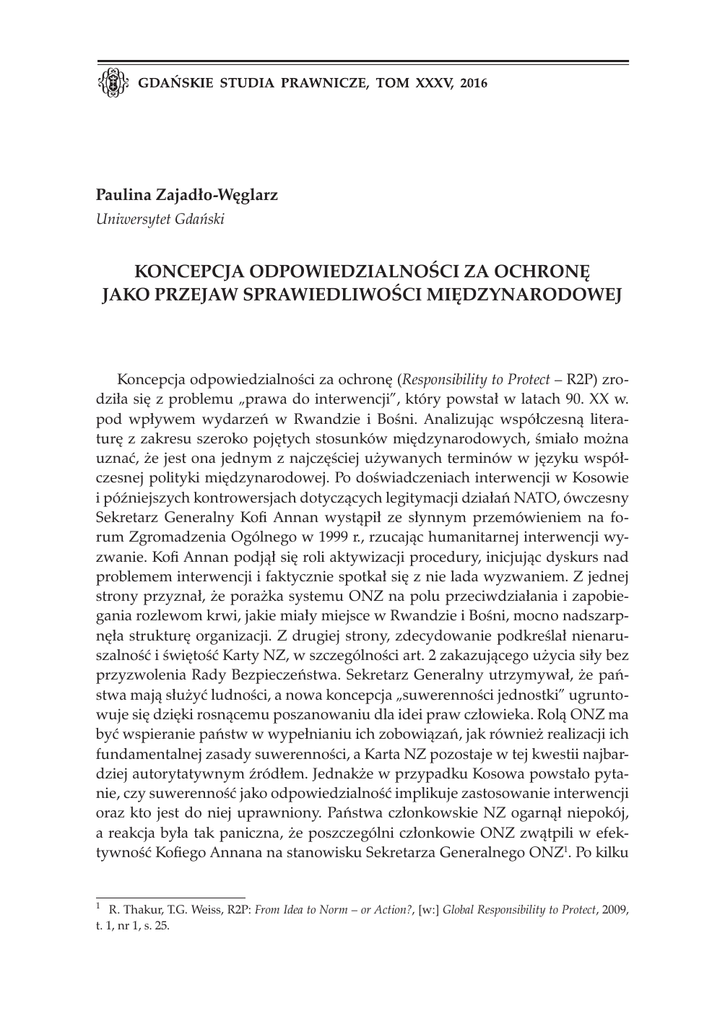 Paulina Zajadło-Węglarz Uniwersytet Gdański Koncepcja odpowiedzialności za ochronę jako przejaw sprawiedliwości międzynarodowej Koncepcja odpowiedzialności za ochronę (Responsibility to Protect – R2P) zrodziła się z problemu „prawa do interwencji”, który powstał w latach 90. XX w. pod wpływem wydarzeń w Rwandzie i Bośni. Analizując współczesną literaturę z zakresu szeroko pojętych stosunków międzynarodowych, śmiało można uznać, że jest ona jednym z najczęściej używanych terminów w języku współczesnej polityki międzynarodowej. Po doświadczeniach interwencji w Kosowie i późniejszych kontrowersjach dotyczących legitymacji działań NATO, ówczesny Sekretarz Generalny Kofi Annan wystąpił ze słynnym przemówieniem na forum Zgromadzenia Ogólnego w 1999 r., rzucając humanitarnej interwencji wyzwanie. Kofi Annan podjął się roli aktywizacji procedury, inicjując dyskurs nad problemem interwencji i faktycznie spotkał się z nie lada wyzwaniem. Z jednej strony przyznał, że porażka systemu ONZ na polu przeciwdziałania i zapobiegania rozlewom krwi, jakie miały miejsce w Rwandzie i Bośni, mocno nadszarpnęła strukturę organizacji. Z drugiej strony, zdecydowanie podkreślał nienaruszalność i świętość Karty NZ, w szczególności art. 2 zakazującego użycia siły bez przyzwolenia Rady Bezpieczeństwa. Sekretarz Generalny utrzymywał, że państwa mają służyć ludności, a nowa koncepcja „suwerenności jednostki” ugruntowuje się dzięki rosnącemu poszanowaniu dla idei praw człowieka. Rolą ONZ ma być wspieranie państw w wypełnianiu ich zobowiązań, jak również realizacji ich fundamentalnej zasady suwerenności, a Karta NZ pozostaje w tej kwestii najbardziej autorytatywnym źródłem. Jednakże w przypadku Kosowa powstało pytanie, czy suwerenność jako odpowiedzialność implikuje zastosowanie interwencji oraz kto jest do niej uprawniony. Państwa członkowskie NZ ogarnął niepokój, a reakcja była tak paniczna, że poszczególni członkowie ONZ zwątpili w efektywność Kofiego Annana na stanowisku Sekretarza Generalnego ONZ1. Po kilku 1 R. Thakur, T.G. Weiss, R2P: From Idea to Norm – or Action?, [w:] Global Responsibility to Protect, 2009, t. 1, nr 1, s. 25. 548 Paulina Zajadło-Węglarz latach funkcjonowania R2P na forum debaty o stanie współczesnych stosunków międzynarodowych okazuje się, że jest to wyjątkowo wartościowe osiągnięcie2. Kanada podjęła wyzwanie rzucone przez Sekretarza Generalnego i na początku 2000 r. utworzyła Międzynarodową Komisję ds. Interwencji i Suwerenności Państwowej (International Commission on Intervention and State Sovereignty – ICISS). Komisja przedstawiła owoce swojej pracy, proklamując raport Responsibility to Protect, przyjęty przez Sekretarza Generalnego NZ 18 grudnia 2001 r. Podstawowym założeniem raportu było rozwiązanie problemu „suwerenność kontra interwencja” poprzez przesunięcie ciężaru debaty z „interwencji” na „odpowiedzialność” i tym samym wprowadzenie zupełnie innowacyjnej koncepcji suwerenności państwowej: suwerenność nie jako kontrola, ale suwerenność jako odpowiedzialność. ICISS określiła odpowiedzialność za prewencję główną zasadą odpowiedzialności za ochronę3. Demonstrując długofalowe założenia dotyczące różnych form zapobiegania, komisja skoncentrowała się na trzech płaszczyznach działania: etapie wczesnego ostrzegania, zapobieganiu elementarnym przyczynom konfliktu oraz prewencji bezpośredniej. Komisja określiła, że wady związane z wczesnym wykrywaniem są często wyolbrzymiane, a sedno sprawy leży nie w przewidywaniu wybuchu konfliktu, lecz w stworzeniu politycznej woli do działania4. Dziś już wiadomo, że rzezie dokonane w Bośni, Rwandzie i Darfurze były możliwe do przewidzenia, a szczegółowa analiza sygnałów ostrzegawczych powinna zmobilizować do konstruktywnego zaangażowania państw trzecich. Niestety, zalecenia komisji w sprawie rozwiązywania elementarnych przyczyn konfliktu okazały się niejednoznaczne. ICISS podkreśliła zasadniczą rolę Rady Bezpieczeństwa w tej sprawie oraz określiła cztery kluczowe wymiary prewencji: polityczne (prawidłowe funkcjonowanie instytucji rządzących, przestrzeganie praw człowieka i wspieranie autorytetu państwowego), ekonomiczne (wyrównywanie zdolności ekonomicznych), prawne (wspieranie prawidłowych reguł prawa i odpowiedzialności państwa) oraz wojskowe (odnoszące się do rozbrojenia, reintegracji i reform sektorowych). Wymienione aspekty powinny mieć również wpływ na bezpośrednią prewencję ze strony struktur światowych z tą różnicą, że za polityczny wymiar uznano dyplomację prewencyjną Sekretarza Generalnego, ekonomicznie odniesiono się do pozytywnych i negatywnych pobudek Rady Bezpieczeństwa, prawnie powoływano się na podział środków pomiędzy mediacją i sankcjami prawnymi. Natomiast w kwestii wymiaru wojskowego odesłano do prawidłowego rozmieszczenia sił prewencyjnych na świecie. Mimo iż komisja wykazała doniosłość działań prewencyjnych sam raport proponował niewiele koncepcyjnych innowacji oraz rozwojowych propozycji, koncen2 Wystąpienie Sekretarza Generalnego z 10 stycznia 2006 r. w Central Hall w Westminster z okazji 60. rocznicy United Nations Association of the UK (UNA-UK), http://www.youtube.com/playlist?list=PL8A464666337D837A. 3 The International Commission on Intervention and State Sovereignty (ICISS), The Resposibility to Protect, s. xi, http://responsibilitytoprotect.org/ICISS%20Report.pdf. 4 ICISS, Responsibility to Protect, s. 21. Koncepcja odpowiedzialności za ochronę jako przejaw sprawiedliwości… 549 trując się w zamian na centralizacji ogólnoświatowych wysiłków prewencyjnych i rozwoju zdolności wczesnego ostrzegania. Wyraźnie zauważalny w raporcie jest niewielki nacisk położony na warunki stosowania prewencji na tle przesłanek stosowania siły