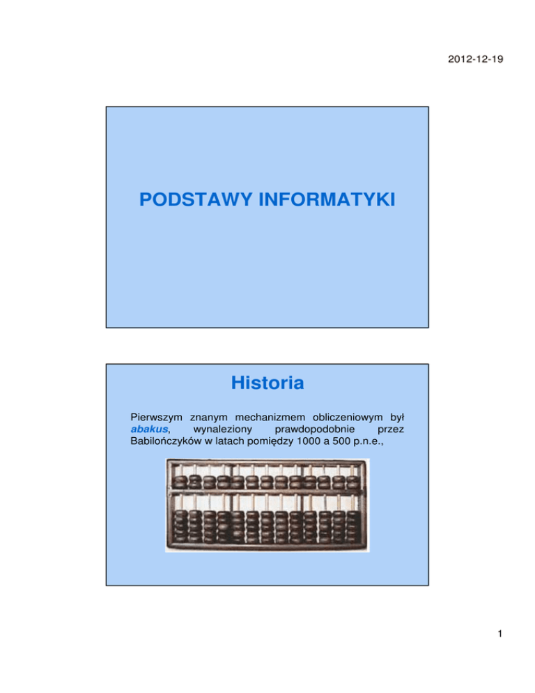 2012-12-19 PODSTAWY INFORMATYKI Historia Pierwszym znanym mechanizmem obliczeniowym był abakus, wynaleziony prawdopodobnie przez Babilończyków w latach pomiędzy 1000 a 500 p.n.e., 1 2012-12-19 Użycie zera • ok. 600 n.e. – Indie, użycie zera jako rzeczywistej wartości wraz z koncepcją liczb ujemnych. • XVIII w. - wielki matematyk szwajcarski Leonhard Euler wierzył, iż liczby ujemne są większe od nieskończoności, a powszechną praktyką było ignorowanie wyników ujemnych w równaniach przy założeniu, że nie mają one żadnego znaczenia. ok. 1614r. – John Napier • szkocki matematyk wynalazł narzędzie nazwane Tabliczkami Napiera, które były tablicami mnożeń wyrytymi na pasach z drewna lub z kości. • wynalazł również logarytmy. • W 1621r. angielski matematyk i duchowny William Oughtred użył logarytmów Napiera jako podstawy działania suwaka logarytmicznego. Suwak był wyjątkowo przydatnym narzędziem pozostającym w powszechnym użyciu przez ponad trzysta lat. 2 2012-12-19 Maszyna Schickarda • Niestety nie istnieją żadne oryginalne kopie maszyny Schickarda, • Na podstawie jego notatek zbudowano działające modele, które są w posiadaniu firmy IBM. • Mnożenie • Dodawanie • Odejmowanie 1642r. – Maszyna Arytmetyczna • Blaise Pascal • Maszyna Arytmetyczna potrafiła jedynie dodawać, odejmowanie wykonywało się przez użycie technik dopełnieniowych, w których odejmowana liczba była najpierw zamieniana na swoje dopełnienie, a dopiero ono było następnie dodawane do liczby pierwszej. • Mnożenie i dzielenie były realizowane za pomocą serii dodawań lub odejmowań. 3 2012-12-19 1671r. – Gottfried von Leibnitz • wstąpił na uniwersytet w wieku lat piętnastu i stopień magistra otrzymał jako siedemnastoletni młodzieniec • powiedział: „Marnotrawstwem jest, aby mądry człowiek tracił godziny jak niewolnicy przy pracach rachunkowych, które można by bezpiecznie powierzyć komukolwiek o mniejszym rozumie, gdyby maszyny mogły być używane” • Rachmistrz Krokowy: – – – – – dodawanie odejmowanie mnożenie dzielenie obliczanie pierwiastków kwadratowych przy pomocy serii dodawań. • Leibniz mocno bronił stosowania binarnego systemu liczbowego, który jest podstawą działania współczesnych komputerów. Początek XIXw. • Francuz, Joseph-Marie Jacquard, wynalazł metodę automatycznego sterowania układem wątku i osnowy nici na krosnach jedwabnych, która polegała na zapisie wzorów dziurek na zestawie specjalnych kart z wybitymi otworami. • Perforowane karty Jacquarda: – zapis muzyki (automatyczne pianina) – przechowywanie programów komputerowych. 80- kolumnowa karta perforowana systemu IBM 4 2012-12-19 1822r. – Charles Babbage Maszyna Różnicowa - automatycznie wyliczała tablice logarytmów i funkcji trygonometrycznych. Ciekawostka: po ponad 150 latach zespół naukowców z Londyńskiego Muzeum Nauki zbudował, według oryginalnych planów, Maszynę Różnicową Babbage'a: • kute żelazo, brąz i stali, • składała się z 4000 komponentów, • ważyła 3 tony, • 10 stóp szerokości, • 6 stóp wysokości. Pierwsza seria obliczeń – początek lat 1990 – wyniki z dokładnością do 31 miejsc po przecinku. 1943r. - COLOSSUS • Maszyna Alana Turinga, zawierała 1800 lamp elektronowych. • COLOSSUS był jednym z pierwszych na świecie działających, programowanych komputerów cyfrowych. • Maszyna o specjalnym przeznaczeniu, która w rzeczywistości nadawała się do wąskiego zakresu zadań (na przykład nie potrafiła mnożyć dziesiętnie). 5 2012-12-19 1943 – 1946r. ENIAC Pierwszy komputer elektroniczny ogólnego przeznaczenia John Eckert • wysokość 10 stóp, • 1000 stóp kwadratowych podłogi • ważył 30 ton, John Mauchly • ponad 70 000 oporników, • 10 000 kondensatorów, • 6 000 przełączników • 18 000 lamp elektronowych. • 150 kW energii elektrycznej, co wystarczało do oświetlenia małego miasteczka. Ciekawostka. Dane z roku 1952 pokazują, iż tylko w tym jednym roku musiano wymienić około 19,000 lamp elektronowych, co daje średnio 50 lamp dziennie! 1951r. – UNIVAC I Pierwszy handlowo dostępny uniwersalny, automatyczny komputer (Universal Automatic Computer - UNIVAC I). 6 2012-12-19 Polska myśl techniczna Odra to nazwa serii komputerów produkowanych w Zakładach Elektronicznych Elwro we Wrocławiu (zlikwidowanych po 1989r). • Możliwość pracy z oprogramowaniem stworzonym przez firmy trzecie • Możliwość podłączenia urządzeń peryferyjnych. Przedostatnia Odra wyszła z użycia 18 lipca 2003 po 29 latach bezawaryjnej pracy jako główna sterownia dystrybucji wrocławskiego przedsiębiorstwa Hutmen. Prawdopodobnie PKP w Ostródzie nadal używa maszyny cyfrowej Odra 1305 (ewenement na skalę całego kraju). Elwro 800 Junior • 8-bitowy mikrokomputer domowy produkowany od 1986 r. przez zakłady Elwro dla szkół. • wbudowany interpreter języka BASIC. • w jednym z trybów pracy był programowo zgodny z Sinclair ZX Spectrum. Budowa: • procesor: Z80A 3,5 MHz • RAM 64 Kb, ROM 24 Kb • grafika: 256 x 192 pikseli • tekst: 32 (64) x 24 znaków • kolory: 8 - każdy po dwa tryby jasności • dźwięk: 1 kanał 10 oktaw 7 2012-12-19 PC Ciekawostka • w roku 1975 komputer mainframe IBM mogący wykonywać 10.000.000 instrukcji na sekundę kosztował około 10.000.000 $. • w roku 1995 gra komputerowa, zdolna wykonywać 500.000.000 instrukcji na sekundę, była dostępna na rynku w cenie około 500$! Generacje • I generacja – komputery na lampach. Budowane na skalę przemysłową. Język maszynowy (lista instrukcji, z których każda jest serią binarnych liczb): 1010 0101 0000 0000 0000 1111 gdzie 1010 - rozkaz dodawania 0101 - zawartość rejestru 5 0000 0000 0000 1111 - adres miejsca w pamięci komputera • w notacji szesnastkowej: A 5 000F 8 2012-12-19 Generacje • II generacja – od 1949r. komputery na tran