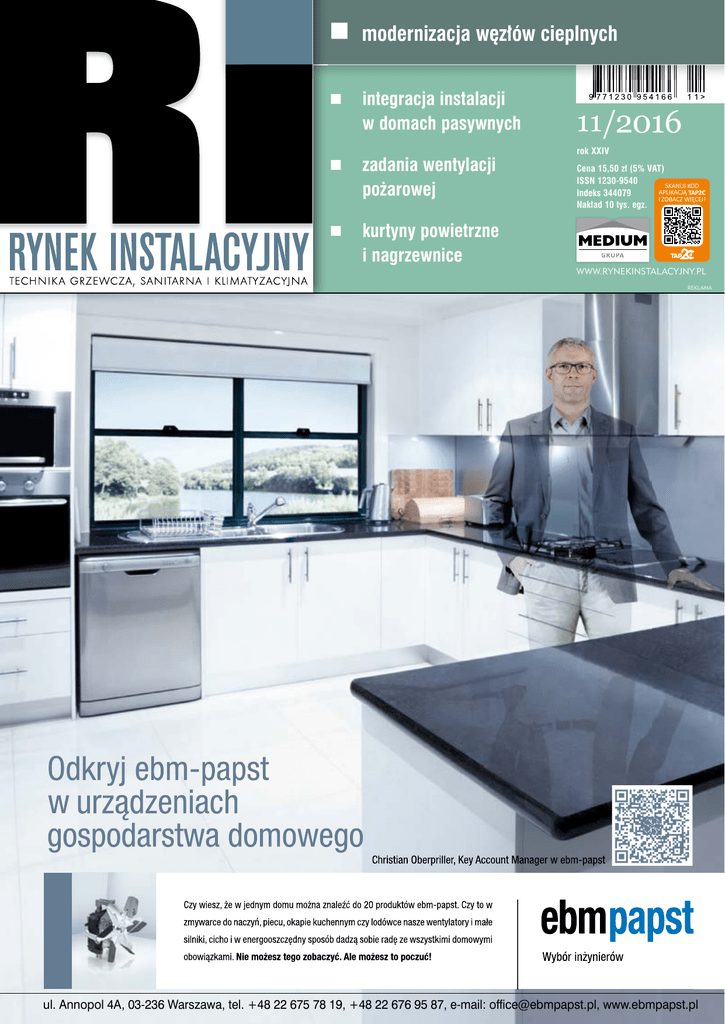 modernizacja węzłów cieplnych integracja instalacji w domach pasywnych zadania wentylacji pożarowej kurtyny powietrzne i nagrzewnice 11/2016 rok XXIV Cena 15,50 zł (5% VAT) ISSN 1230-9540 SKANUJ KOD APLIKACJĄ Indeks 344079 I ZOBACZ WIĘCEJ! Nakład 10 tys. egz. GRUPA WWW.RYNEKINSTALACYJNY.PL REKLAMA ul. Annopol 4A, 03-236 Warszawa, tel. +48 22 675 78 19, +48 22 676 95 87, e-mail: offi[email protected], www.ebmpapst.pl MIESIĘCZNIK INFORMACYJNO-TECHNICZNY ISSN 1230-9540, nakład 10 000 GRUPA Wydawca Grupa MEDIUM www.medium.media.pl Adres redakcji 04-112 Warszawa, ul. Karczewska 18 tel./faks 22 512 60 75 e-mail: [email protected] www.rynekinstalacyjny.pl Redaktor naczelny Waldemar Joniec, tel. 502 042 518 [email protected] Sekretarz redakcji Agnieszka Orysiak, tel. 600 050 378 [email protected] Redaktor portalu internetowego Katarzyna Rybka [email protected] Redakcja Jerzy Kosieradzki (red. tematyczny), Joanna Korpysz-Drzazga (red. językowy), Jacek Sawicki (red. tematyczny), Bogusława Wiewiórowska-Paradowska (red. tematyczny) Reklama i marketing tel./faks 22 810 28 14, 512 60 70 Dyrektor biura reklamy i marketingu Joanna Grabek, [email protected] Specjalista ds. reklamy w RI Ewa Zgutka, [email protected] Kierownik ds. promocji Marta Lesner-Wirkus, [email protected] Kolportaż i prenumerata tel./faks 22 512 60 74, 810 21 24 Specjalista ds. prenumeraty Joanna Wątor, [email protected] Prenumerata realizowana przez RUCH S.A. Zamówienia na prenumeratę w wersji papierowej i na e-wydania można składać bezpośrednio na stronie www.prenumerata.ruch.com.pl. Ewentualne pytania prosimy kierować na adres e-mail: [email protected] lub kontaktując się z Telefonicznym Biurem Obsługi Klienta pod numerem: 801 800 803 lub 22 717 59 59 – czynne w godzinach 7.00 – 18.00. Koszt połączenia wg taryfy operatora. Administracja Danuta Ciecierska (HR), Maria Królak (księgowość) Skład, łamanie [email protected] Druk Zakłady Graficzne TAURUS Redakcja zastrzega sobie prawo do adiustacji tekstów i nie zwraca materiałów niezamówionych. Za treść ogłoszeń redakcja ponosi odpowiedzialność w granicach wskazanych w ust. 2 art. 42 ustawy Prawo prasowe. Redakcja ma prawo odmówić publikacji bez podania przyczyn. Wszelkie prawa zastrzeżone © by Grupa MEDIUM. Rozpowszechnianie opublikowanych materiałów bez zgody wydawcy jest zabronione. Wersja pierwotna czasopisma – papierowa. Za publikację w „Rynku Instalacyjnym” MNiSW przyznaje jednostkom naukowym 6 punktów Wskazówki dla autorów, procedura recenzowania i lista recenzentów artykułów na www.rynekinstalacyjny.pl/redakcja Grupa MEDIUM jest członkiem Izby Wydawców Prasy W iele się działo w branży w ostatnich tygodniach. Po raz pierwszy od prawie dekady (chyba że coś przeoczyłem) PZITS zorganizował w Warszawie dużą konferencję dla projektantów i rzeczoznawców. Inicjatywa wyszła od młodych członków Zrzeszenia, a celem było podniesienie poziomu wiedzy i wymiana doświadczeń. Szeroka tematyka, liczni uczestnicy i ich duże zaangażowanie wskazują, że PZITS ma jednak pole do działania. Warszawa była też miejscem spotkania branży OZE w trakcie targów RENEXPO. Wiele wskazuje, że nie będzie łatwo, ale też widać było, że postępu nie da się powstrzymać – prędzej czy później zacznie działać efekt kuli śnieżnej, zwłaszcza w branży fotowoltaiki. Okresowe nadpodaże energii elektrycznej będziemy musieli wówczas magazynować w cieple na potrzeby c.o. i c.w.u. oraz w elektryczności, np. w akumulatorach samochodów elektrycznych. Może to mieć istotny wpływ na instalacje grzewcze w budynkach nowych i modernizowanych. Z kolei Kraków miał Eurovent Summit – jedno z najważniejszych europejskich wydarzeń w branży wentylacyjnej i klimatyzacyjnej. Wybór Polski na miejsce szczytu (odbywającego się co dwa lata) to sygnał, że nie tylko polski rynek jest ważny, ale że mamy również sporo prężnych producentów urządzeń i armatury wentylacyjnej. Natomiast w Katowicach ogłoszono wyniki V edycji Konkursu TOPTEN oraz „Listę kotłów na paliwa stałe klasy 5” o mocy do 25 kW. Jury do „dziesiątki” automatycznych kotłów węglowych zakwalifikowało cztery urządzenia, a do „dziesiątki” kotłów automatycznych na biopaliwo stałe – osiem. Kryterium dla kotłów z listy TOPTEN były wymagania normy PN-EN 303-5 i rozporządzenie komisji UE 2015/1189 w odniesieniu do wymagań dotyczących ekoprojektu dla kotłów na paliwo stałe, które trzeba będzie spełnić od 2020 r., żeby móc wprowadzić takie urządzenie do obrotu. Dane o kotłach klasy 5 wskazują, że kończy się era kotłów z ręcznym załadunkiem – szczegółowe wyniki konkursu podamy w następnym numerze. Jest też coś, co łączy wydarzenia w Krakowie, Katowicach i Warszawie – to akcja Alarmu Smogowego. Używane są przy tej okazji bardzo ważne argumenty i przytaczane ciekawe fakty i dane. Przykładowo lekarze ze Śląskiego Centrum Chorób Serca udowodnili, że gdy stężenie pyłów z niskiej emisji jest duże, w szpitalach wzrasta liczba pacjentów z zawałami serca i udarami mózgu. W tym kontekście trzeba odnotować, że pojawia się coraz więcej głosów o braku w Polsce standardów emisyjnych dla kotłów na paliwa stałe i standardów jakości dla węgla. Zauważył to nawet Global Compact – Inicjatywa Sekretarza Generalnego ONZ w raporcie nt. niskiej emisji. Ma być jednak lepiej. Ministerstwo Środowiska zwróciło uwagę, że zanieczyszczenia powietrza są problemem dla turystyki i uzdrowisk. Na przykład w Zakopanem czy Rabce ze względu na przekroczenie poziomów alarmowych oraz dopuszczalnych zanieczyszczeń powietrza spada liczba odwiedzających i kuracjuszy. Przy okazji resort ochrony środowiska zdradził, że resort energii pracuje nad standaryzacją jakości paliw stałych, a ministerstwo rozwoju nad standardami emisyjnymi dla kotłów domowych. A co w świecie? Warto wiedzieć,