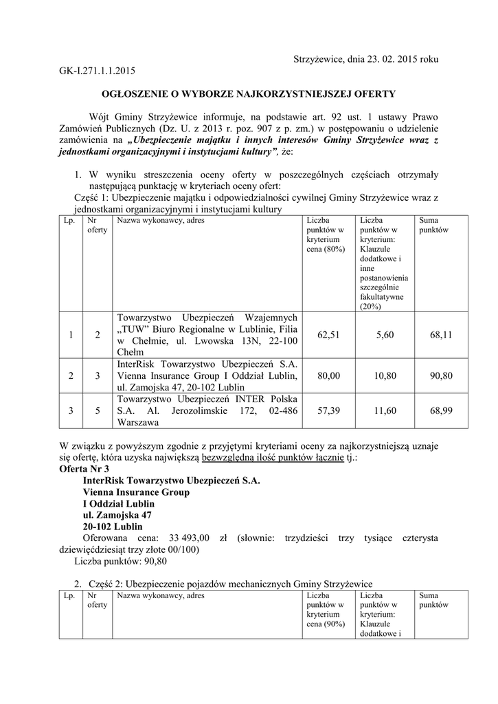 Strzyżewice, dnia 23. 02. 2015 roku GK-I.271.1.1.2015 OGŁOSZENIE O WYBORZE NAJKORZYSTNIEJSZEJ OFERTY Wójt Gminy Strzyżewice informuje, na podstawie art. 92 ust. 1 ustawy Prawo Zamówień Publicznych (Dz. U. z 2013 r. poz. 907 z p. zm.) w postępowaniu o udzielenie zamówienia na „Ubezpieczenie majątku i innych interesów Gminy Strzyżewice wraz z jednostkami organizacyjnymi i instytucjami kultury”, że: 1. W wyniku streszczenia oceny oferty w poszczególnych częściach otrzymały następującą punktację w kryteriach oceny ofert: Część 1: Ubezpieczenie majątku i odpowiedzialności cywilnej Gminy Strzyżewice wraz z jednostkami organizacyjnymi i instytucjami kultury Lp. Nr oferty 1 2 2 3 3 5 Nazwa wykonawcy, adres Towarzystwo Ubezpieczeń Wzajemnych „TUW” Biuro Regionalne w Lublinie, Filia w Chełmie, ul. Lwowska 13N, 22-100 Chełm InterRisk Towarzystwo Ubezpieczeń S.A. Vienna Insurance Group I Oddział Lublin, ul. Zamojska 47, 20-102 Lublin Towarzystwo Ubezpieczeń INTER Polska S.A. Al. Jerozolimskie 172, 02-486 Warszawa Liczba punktów w kryterium cena (80%) Liczba punktów w kryterium: Klauzule dodatkowe i inne postanowienia szczególnie fakultatywne (20%) Suma punktów 62,51 5,60 68,11 80,00 10,80 90,80 57,39 11,60 68,99 W związku z powyższym zgodnie z przyjętymi kryteriami oceny za najkorzystniejszą uznaje się ofertę, która uzyska największą bezwzględną ilość punktów łącznie tj.: Oferta Nr 3 InterRisk Towarzystwo Ubezpieczeń S.A. Vienna Insurance Group I Oddział Lublin ul. Zamojska 47 20-102 Lublin Oferowana cena: 33 493,00 zł (słownie: trzydzieści trzy tysiące czterysta dziewięćdziesiąt trzy złote 00/100) Liczba punktów: 90,80 2. Część 2: Ubezpieczenie pojazdów mechanicznych Gminy Strzyżewice Lp. Nr oferty Nazwa wykonawcy, adres Liczba punktów w kryterium cena (90%) Liczba punktów w kryterium: Klauzule dodatkowe i Suma punktów inne postanowienia szczególnie fakultatywne (10%) 1 1 2 2 3 4 UNIQA Towarzystwo Ubezpieczeń S.A. z siedzibą w Łodzi, ul. Gdańska 132, Przedstawicielstwo Regionalne w Radomiu, ul. Szklana 60, 26-600 Radom Towarzystwo Ubezpieczeń Wzajemnych „TUW” Biuro Regionalne w Lublinie, Filia w Chełmie, ul. Lwowska 13N, 22-100 Chełm Powszechny Zakład Ubezpieczeń S.A. Oddział Regionalny w Lublinie, Zespół Sprzedaży Brokerskiej, ul. Lucyny Herc 3A, 20-328 Lublin 81,69 1,00 82,69 90,00 0,00 90,00 79,92 1,00 80,92 W związku z powyższym zgodnie z przyjętymi kryteriami oceny za najkorzystniejszą uznaje się ofertę, która uzyska największą bezwzględną ilość punktów łącznie tj.: Oferta Nr 2 Towarzystwo Ubezpieczeń Wzajemnych „TUW” Biuro Regionalne w Lublinie Filia w Chełmie ul. Lwowska 13N 22-100 Chełm Oferowana cena: 20 994,00 zł (słownie: dwadzieścia tysięcy dziewięćset dziewięćdziesiąt cztery złote 00/100) Liczba punktów: 90,00 Część 3: Ubezpieczenie członków Ochotniczych Straży Pożarnych Gminy Strzyżewice Lp. Nr oferty 1 1 2 4 Nazwa wykonawcy, adres UNIQA Towarzystwo Ubezpieczeń S.A. z siedzibą w Łodzi, ul. Gdańska 132, Przedstawicielstwo Regionalne w Radomiu, ul. Szklana 60, 26-600 Radom Powszechny Zakład Ubezpieczeń S.A. Oddział Regionalny w Lublinie, Zespół Sprzedaży Brokerskiej, ul. Lucyny Herc 3A, 20-328 Lublin Liczba punktów w kryterium cena (95%) Liczba punktów w kryterium: Klauzule dodatkowe i inne postanowienia szczególnie fakultatywne (5%) Suma punktów 95,00 0,00 95,00 67,22 3,00 70,22 W związku z powyższym zgodnie z przyjętymi kryteriami oceny za najkorzystniejszą uznaje się ofertę, która uzyska największą bezwzględną ilość punktów łącznie tj.: Oferta Nr 1 UNIQA Towarzystwo Ubezpieczeń S.A. z siedzibą w Łodzi, ul. Gdańska 132 Przedstawicielstwo Regionalne w Radomiu ul. Szklana 60 26-600 Radom Oferowana cena: 7 420,00 zł (słownie: siedem tysięcy czterysta dwadzieścia złotych 00/100) Liczba punktów: 95,00 2. Żaden z wykonawców nie został wykluczony z postępowania. 3. W części 1 zamówienia: Ubezpieczenie majątku i odpowiedzialności cywilnej Gminy Strzyżewice wraz z jednostkami organizacyjnymi i instytucjami kultury Zamawiający na podstawie art. 89 ust. 1 pkt. 4 ustawy Prawo zamówień publicznych odrzuca ofertę nr 4 zawierającą rażąco niską cenę w stosunku do przedmiotu zamówienia tj. Powszechny Zakład Ubezpieczeń S.A. Oddział Regionalny w Lublinie, Zespół Sprzedaży Brokerskiej, ul. Lucyny Herc 3A, 20-328 Lublin – cena oferty: 37 456,00 zł, różni się o więcej niż 30 % (16 500 zł) od wartości przedmiotu zamówienia: 55 000 zł, a wykonawca nie złożył wyjaśnień czy zaoferowana cena nie jest rażąco niska w stosunku do przedmiotu zamówienia. 4. Zgodnie z art. 94 ust. 1 pkt 2 Prawo zamówień publicznych umowy w sprawie zamówienia publicznego mogą być zawarte po upływie 5 dni od dnia przesłania zawiadomienia o wyborze najkorzystniejszej oferty faksem lub e- mailem. Z upoważnienia Wójta mgr inż. Elżbieta Budzyńska Sekretarz Gminy