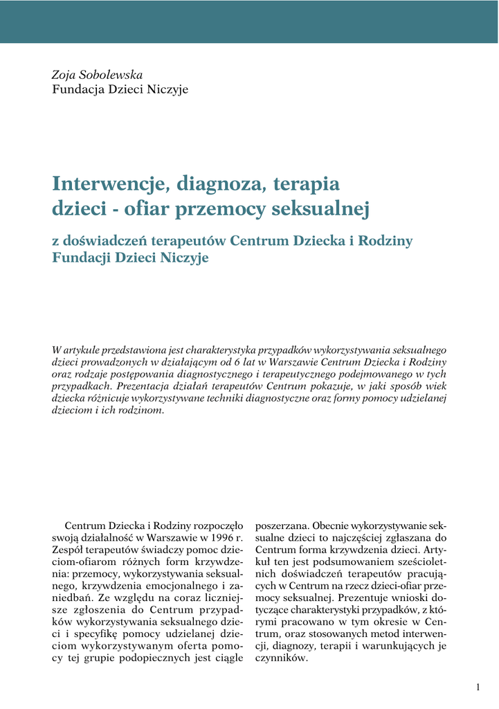 Zoja Sobolewska Fundacja Dzieci Niczyje Interwencje, diagnoza, terapia dzieci - ofiar przemocy seksualnej z doświadczeń terapeutów Centrum Dziecka i Rodziny Fundacji Dzieci Niczyje W artykule przedstawiona jest charakterystyka przypadków wykorzystywania seksualnego dzieci prowadzonych w działającym od 6 lat w Warszawie Centrum Dziecka i Rodziny oraz rodzaje postępowania diagnostycznego i terapeutycznego podejmowanego w tych przypadkach. Prezentacja działań terapeutów Centrum pokazuje, w jaki sposób wiek dziecka różnicuje wykorzystywane techniki diagnostyczne oraz formy pomocy udzielanej dzieciom i ich rodzinom. Centrum Dziecka i Rodziny rozpoczęło swoją działalność w Warszawie w 1996 r. Zespół terapeutów świadczy pomoc dzieciom-ofiarom różnych form krzywdzenia: przemocy, wykorzystywania seksualnego, krzywdzenia emocjonalnego i zaniedbań. Ze względu na coraz liczniejsze zgłoszenia do Centrum przypadków wykorzystywania seksualnego dzieci i specyfikę pomocy udzielanej dzieciom wykorzystywanym oferta pomocy tej grupie podopiecznych jest ciągle poszerzana. Obecnie wykorzystywanie seksualne dzieci to najczęściej zgłaszana do Centrum forma krzywdzenia dzieci. Artykuł ten jest podsumowaniem sześcioletnich doświadczeń terapeutów pracujących w Centrum na rzecz dzieci-ofiar przemocy seksualnej. Prezentuje wnioski dotyczące charakterystyki przypadków, z którymi pracowano w tym okresie w Centrum, oraz stosowanych metod interwencji, diagnozy, terapii i warunkujących je czynników. 1 Sobolewska / Interwencje, diagnoza, terapia dzieci - ofiar przemocy seksualnej 1. Charakterystyka podopiecznych Centrum Dziecka i Rodziny Przedstawione niżej ustalenia są efektem pogłębionej analizy danych dotyczących klientów przyjętych w Centrum Dziecka i Rodziny w 2000 r. Analizie poddano przypadki 239 dzieci, w tym 74 ofiar przemocy seksualnej, które pozostawały pod dłuższą opieką placówki (więcej niż 3 spotkania). Liczba ta nie obejmuje dzieci-ofiar przemocy seksualnej, na rzecz których przeprowadzano w Centrum badania i sporządzano psychologiczne opinie sądowe, przeprowadzono przesłuchania prokuratorskie lub policyjne, jak też przypadków badań i konsultacji w celu weryfikacji hipotezy wykorzystania seksualnego, prowadzonych na prośbę rodziny czy domu dziecka bez podjęcia dalszej opieki nad samą ofiarą1. Znacznie rzadziej zgłaszane były przypadki wykorzystywania seksualnego chłopców (18,9 % ofiar) niż dziewczynek (81,1 %). Najwięcej ofiar (7 chłopców i 33 dziewczynki) było w wieku 13–18 lat. Licznie reprezentowana była też grupa wieku 7–12 lat (21 dziewczynek i 3 chłopców). W tych dwóch kategoriach mieściło się 86,5% wszystkich dzieci wykorzystywanych seksualnie pozostających pod opieką Centrum. Dane te odzwierciedlają tendencje zauważane w wielu badaniach ofiar przemocy seksualnej (Pospiszyl 1994; Lew-Starowicz 2000) i pokazują, że wiekiem ryzyka dla krzywdzenia seksualnego zarówno dla chłopców, jak i dziewczynek jest przedział 7–12 lat, jak również wiek pokwitania 13–18 lat. 1.1. Wiek i płeć 1.2. Formy wykorzystywania seksualnego Rozkład płci i wieku dzieci, które zostały w analizowanym roku podopiecznymi Centrum ze względu na doświadczenie wykorzystania seksualnego, przedstawia tabela 1. Jak pokazuje tabela 2, dzieci trafiające do Centrum najczęściej doświadczały ze strony dorosłych przemocy seksualnej angażującej dotyk oraz doprowadzane były do współżycia seksualnego w formie penetracji Tabela 1. Wiek i płeć dzieci (N = 74) Wiek dzieci Chłopcy Dziewczynki Razem % 0-3 lata 2 2 3 4,1 4-6 lat 2 - 2 2,7 7-12 lat 3 21 24 32,4 13-18 lat 7 33 40 54,1 18 i więcej 1 4 5 6,7 14 60 74 100,0 Razem 1 W przypadku małych dzieci przebywających w domu dziecka prowadzone są konsultacje dla wychowawców bądź rodzin zastępczych czy adopcyjnych. W przypadku dzieci z innych miast, po diagnozi sprawę przejmują lokalne placówki często pozostając z Centrum w telefonicznym, konsultacyjnym kontakcie. 2 Sobolewska / Interwencje, diagnoza, terapia dzieci - ofiar przemocy seksualnej 1.3. Sprawcy genitalnej, oralnej i analnej. Znacznie rzadszą formą wykorzystania seksualnego były, zachowania seksualne bez dotyku. Na ogół zachowania te towarzyszyły inwazyjnym formom przemocy seksualnej. Współwystępowanie różnych form wykorzystywania seksualnego dzieci prezentuje tabela 3. U większości (81,6%) dzieci zdiagnozowano jedną lub dwie, spośród wymienionych w tabeli 2, formy przemocy seksualnej. Mała liczba przypadków spółwystępowania różnych formy wykorzystywania seksualnego dziecka może świadczyć o określonych preferencjach sprawców, bądź też – co bardziej prawdopodobne – o koncentrowaniu się relacji dzieci na temat form doświadczonej przemocy na tych najbardziej drastycznych. Ważnym kryterium decyzji dotyczących formy oddziaływań podejmowanych na rzecz dzieci-ofiar przemocy seksualnej i ich rodzin jest relacja ofiary ze sprawcą. Najliczniejszą kategorią sprawców wykorzystywania seksualnego podopiecznych Centrum byli ojcowie – stanowili oni 39,5% sprawców w badanej próbie oraz osoby z poza rodziny – 34,2%. Do kategorii sprawcy „matka” zaliczone zostały głównie przypadki współuczestniczenia matek w przemocy seksualnej wobec dzieci. Dane te potwierdzają wyniki wielu innych badań (Lew-Starowicz 2000), w których wykazano, że przemoc seksualna najczęściej spotyka dzieci w ich własnych rodzinach. Tabela 2. Formy zachowań seksualnych wobec ofiar Rodzaj krzywdzenia seksualnego Liczba % 23 30,3 Oralne stosunki seksualne z dzieckiem 5 6,6 Analne stosunki seksualne z dzieckiem 8 10,5 Wprowadzanie palca bądź przedmiotów do pochwy lub odbytu 13 17,1 Nakłanianie dziecka do dotykania lub całowania narządów płciowych dorosłego 16 21,1 Dotykanie, całowanie narządów płciowych dziecka 31 40,8 Dotykanie, całowanie innych części ciała dziecka w ce