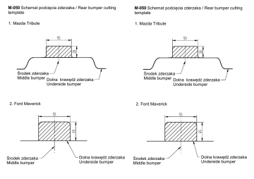 M-050 Schemat podcięcia zderzaka / Rear bumper cutting template M-050 Schemat podcięcia zderzaka / Rear bumper cutting template 1. Mazda Tribute 1. Mazda Tribute 55 20 20 55 Środek zderzaka Middle bumper Dolna krawędź zderzaka Underside bumper 2. Ford Maverick Środek zderzaka Middle bumper Dolna krawędź zderzaka Underside bumper 2. Ford Maverick 55 Środek zderzaka Middle bumper 45 45 55 Dolna krawędź zderzaka Underside bumper Środek zderzaka Middle bumper Dolna krawędź zderzaka Underside bumper