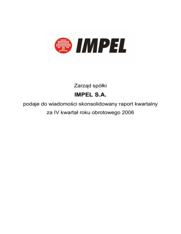 Zarząd spółki IMPEL S.A. podaje do wiadomości skonsolidowany raport kwartalny za IV kwartał roku obrotowego 2006 QSr IV/2006 GRUPA KAPITAŁOWA IMPEL Spis treści I. SKRÓCONE KWARTALNE SPRAWOZDANIE FINANSOWE GRUPY KAPITAŁOWEJ IMPEL ORAZ IMPEL S.A. ............................................................................................................................ 4 1. Skonsolidowany bilans ............................................................................................................... 4 2. Skonsolidowany rachunek zysków i strat ................................................................................... 7 3. Zestawienie zmian w skonsolidowanym kapitale własnym ........................................................ 9 4. Skonsolidowany rachunek przepływów pieniężnych ................................................................ 10 5. Bilans Impel S.A........................................................................................................................ 11 6. Rachunek zysków i strat Impel S.A. ......................................................................................... 14 7. Zestawienie zmian kapitale własnym Impel S.A. .....................................................................15 8. Rachunek przepływów pieniężnych Impel S.A. ........................................................................ 16 II. WYBRANE DANE OBJAŚNIAJACE .............................................................................................. 17 1. Informacje o zasadach przyjętych przy sporządzaniu skonsolidowanego raportu kwartalnego za IV kwartał 2006 roku ............................................................................................................ 17 1.1. Podstawa sporządzania i format sprawozdań finansowych zamieszczonych w raporcie ................ 17 1.2. Okres objęty sprawozdaniem finansowym....................................................................................... 17 1.3. Ogólne zasady sporządzania sprawozdań finansowych zamieszczonych w raporcie ..................... 17 1.4. Informacje ogólne dotyczące emitenta i grupy kapitałowej .............................................................. 17 1.5. Przyjęte zasady (polityka) rachunkowości i metody obliczeniowe ................................................... 17 2. Przychody uzyskiwane sezonowo, cyklicznie lub sporadycznie .............................................. 18 3. Rodzaj oraz kwoty pozycji wpływających na aktywa, pasywa, kapitał, wynik finansowy netto, lub przepływy środków pieniężnych, które są niezwykłe ze względu na ich rodzaj, wielkość lub wywierany wpływ................................................................................................................. 18 4. Rodzaj oraz kwoty zmian wartości szacunkowych kwot, które były podawane w poprzednich okresach bieżącego roku obrotowego, lub zmiany wartości szacunkowych podawanych w poprzednich latach obrotowych, jeśli wywierają one istotny wpływ na bieżący okres śródroczny. ............................................................................................................................... 19 4.1. Grupa Kapitałowa Impel .................................................................................................................. 19 4.1.1. Odpisy aktualizujące wartość aktywów.................................................................................. 19 4.1.2. Aktywo i rezerwa z tytułu odroczonego podatku dochodowego............................................. 19 4.1.3. Rezerwy na przyszłe zobowiązania ....................................................................................... 20 4.1.4. Rezerwy na świadczenia pracownicze .................................................................................. 20 4.1.5. Świadczenia pracownicze oparte na akcjach......................................................................... 20 4.2. Impel S.A. ........................................................................................................................................ 21 4.2.1. Odpisy aktualizujące wartość aktywów.................................................................................. 21 4.2.2. Aktywo i rezerwa z tytułu odroczonego podatku dochodowego............................................. 21 4.2.3. Rezerwy na przyszłe zobowiązania ....................................................................................... 22 4.2.4. Rezerwy na świadczenia pracownicze .................................................................................. 22 4.2.5. Świadczenia pracownicze oparte na akcjach......................................................................... 22 5. Emisje, wykup i spłaty dłużnych i kapitałowych papierów wartościowych............................... 22 6. Wypłacone dywidendy (łącznie lub w przeliczeniu na jedną akcję) z podziałem na akcje zwykłe i pozostałe akcje ........................................................................................................... 22 7. Przychody i wyniki przypadające na poszczególne segmenty działalności ............................. 23 8. Wydarzenia po dacie bilansowej nie ujęte w skonsolidowanym sprawozdaniu finansowym za IV kwartał 2006 roku, a mogące wpłynąć w znaczący sposób na to sprawozdanie ........... 26 2 QSr IV/2006 GRUPA KAPITAŁOWA IMPEL 9. Skutek zmian w strukturze jednostki gospodarczej w ciągu okresu śródrocznego łącznie z połączeniem jednostek gospodarczych, przejęcia lub sprzedaży jednostek zależnych i inwestycji długoterminowych, restrukturyzacją i zaniechaniem działalności .......................... 26 10. Zmiany zobowiązań warunkowych lub aktywów warunkowych, które nastąpiły od czasu zakończenia roku obrotowego 2005 ......................................................................................... 28 III. POZO