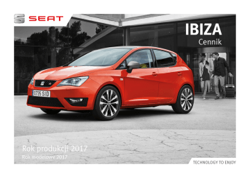 IBIZA Cennik Rok produkcji 2017 Rok modelowy 2017 TECHNOLOGY TO ENJOY MOCNO WYPOSAŻONA IBIZA / ŚWIATŁA LED / CZUJNIKI PARKOWANIA / FELGI ALUMINIOWE JUŻ ZA 405 zł/mc SPRAWDŹ INNE FORMY FINANSOWANIA NA WWW.SEAT-AUTO.PL TECHNOLOGY TO ENJOY SEAT FINANCIAL SERVICES Podana kwota stanowi miesięczną ratę brutto Kredytu Moc Niskich Rat. Parametry przyjęte do kalkulacji raty: cena samochodu: 49 201 zł, opłata wstępna: 14 760 zł, okres kredytu: 48 miesięcy, roczny przebieg 20 000 km, finalna rata określona w umowie. SEAT KREDYT MOC NISKICH RAT 0% - Rzeczywista Roczna Stopa Oprocentowania (RRSO) wynosi 5,99%, całkowita kwota kredytu (bez kredytowanych kosztów) 97 200 zł, całkowita kwota do zapłaty 115 492 zł, oprocentowanie zmienne 0,8%, całkowity koszt kredytu 18 292 zł (w tym: prowizja 5 369 zł, odsetki 2 743 zł, ubezpieczenie komunikacyjne na 1. rok 3 645 zł, ubezpieczenie spłaty kredytu 6 535 zł, 47 miesięcznych rat równych po 1 214 zł; rata finalna 57 227 zł. Oferta na wybrane modele SEATA przy skorzystaniu z ubezpieczenia komunikacyjnego i ubezpieczenia spłaty kredytu oferowanych przez Volkswagen Serwis Ubezpieczeniowy Sp. z o.o. Niniejsza informacja nie stanowi oferty w rozumieniu kodeksu cywilnego. Dostępność i warunki produktu mogą ulec zmianie. Warunki produktu określa umowa. s Wyposażenie standardowe, – Niedostępne, –/ s Standard z wybranym silnikiem PAKIETY PROMOCYJNE Pakiet COMFORT+ dla wersji Style Pakiet COMFORT+ dla wersji FR [P20] / Czujniki parkowania z tyłu [PAK] / 15-calowe felgi aluminiowe IBIA [PJM] / Pakiet LED: Podwójne reflektory ze światłami do jazdy dziennej LED i tylne światła LED [WXL] 1 zł COMFORT+ cena pakietu Zyskujesz 3745 zł Zestaw felg aluminiowych za [P21] / Czujniki parkowania z tyłu [PAK] / Przyciemniane szyby [PCO] / Pakiet elektroniczny: el. składane lusterka, czujnik deszczu, czujnik zmierzchu (automatyczne światła), funkcja opóźnionego wyłączania świateł "Coming and Leaving Home", automatycznie ściemniające się lusterko wsteczne [PTP] 1 zł COMFORT+ cena pakietu 999zł dla wersji Reference Zyskujesz 2636 zł Zyskujesz 1459 zł W pakiecie Comfort+ tylko dla wersji FR istnieje możliwość zamiany czujników parkowania z tyłu na czujniki parkowania z przodu i z tyłu za dopłatą 662 zł do ceny pakietu. W pakietach Comfort+ nie ma możliwości wymiany felg na inny rodzaj. Pakiety wykluczają się ze wszystkimi innymi pakietami zawierającymi inny rodzaj felg. Pakiet Comfort+ jest niedostępny z silnikiem 1.0 EcoTSI Start&Stop 110 KM z manualną skrzynią biegów. W wersji Reference możesz zyskać 1459 zł kupując zestaw felg aluminiowych za 999 zł. s Wyposażenie standardowe, – Niedostępne, –/ s Standard z wybranym silnikiem CENNIK obowiązuje od 02.01.2017 IBIZA (wersja 5-drzwiowa) WERSJA WYPOSAŻENIA REFERENCE Wybierz promocyjny zestaw felg aluminiowych za 999 zł STYLE Wybierz promocyjny pakiet Comfort+ za 1 zł FR Wybierz promocyjny pakiet Comfort+ za 1 zł już od 389 zł miesięcznie * ROK PRODUKCJI 2017 SILNIK KODY SKRZYNIA BIEGÓW CENY 1.0 MPI 75 KM 6P11C2 manualna 5-biegowa 47 300 zł 1.2 TSI 90 KM 6P11E2 manualna 5-biegowa 49 400 zł 1.4 TDI CR 90 KM 6P1132 manualna 5-biegowa 63 700 zł 1.0 MPI 75 KM 6P12C2 manualna 5-biegowa 49 200 zł 1.2 TSI 90 KM 6P12E2 manualna 5-biegowa 51 300 zł 1.0 EcoTSI Start&Stop 110 KM** 6P12KX manualna 6-biegowa 55 800 zł 1.0 EcoTSI Start&Stop DSG 110 KM 6P12KZ automatyczna 7-stopniowa 61 000 zł 1.2 TSI 90 KM 6P15E2 manualna 5-biegowa 60 900 zł 1.0 EcoTSI Start&Stop 95 KM 6P15SV manualna 5-biegowa 63 300 zł 1.2 TSI 110 KM 6P15W1 manualna 6-biegowa 63 700 zł 1.0 EcoTSI Start&Stop 110 KM 6P15KX manualna 6-biegowa 65 400 zł 1.0 EcoTSI Start&Stop DSG 110 KM 6P15KZ automatyczna 7-stopniowa 70 600 zł 1.4 EcoTSI Start&Stop 150 KM 6P15NX manualna 6-biegowa 72 100 zł 1.4 TDI CR Start&Stop 105 KM 6P154V manualna 5-biegowa 78 400 zł TSI – Turbo Stratified Injection (silnik benzynowy), CR – Common Rail (diesel) Wszystkie modele objęte są 4-letnią Ochroną Gwarancyjną SEAT. (2 lata gwarancji podstawowej + 2 lata przedłużonej gwarancji SEAT do limitu 120 tyś km przebiegu) W wersji Style możesz zyskać 3 745 zł kupując promocyjny pakiet Comfort+ za 1 zł. W wersji FR możesz zyskać 2636 zł wybierając pakiet Comfort+ zł za 1 zł. W wersji Reference możesz zyskać 1459 zł kupując zestaw felg aluminiowych za 999 zł. Oferta obowiązuje do wyczerpania zapasów. **Pakiet Comfort+ jest niedostępny z silnikiem 1.0 EcoTSI Start&Stop 110 KM z manualną skrzynią biegów. * Podana kwota stanowi miesięczną ratę brutto Kredytu Moc Niskich Rat. Parametry przyjęte do kalkulacji raty: cena samochodu: 47 300 zł, opłata wstępna: 14 190 zł, okres kredytu: 48 miesięcy, roczny przebieg 20 000 km, finalna rata określona w umowie. SEAT KREDYT MOC NISKICH RAT 0% - Rzeczywista Roczna Stopa Oprocentowania (RRSO) wynosi 5,99%, całkowita kwota kredytu (bez kredytowanych kosztów) 97 200 zł, całkowita kwota do zapłaty 115 492 zł, oprocentowanie zmienne 0,8%, całkowity koszt kredytu 18 292 zł (w tym: prowizja 5 369 zł, odsetki 2 743 zł, ubezpieczenie komunikacyjne na 1. rok 3 645 zł, ubezpieczenie spłaty kredytu 6 535 zł, 47 miesięcznych rat równych po 1 214 zł; rata finalna 57 227 zł. Oferta na wybrane modele SEATA przy skorzystaniu z ubezpieczenia komunikacyjnego i ubezpieczenia spłaty kredytu oferowanych przez Volkswagen Serwis Ubezpieczeniowy Sp. z o.o. Niniejsza informacja nie stanowi oferty w rozumieniu kodeksu cywilnego. Dostępność i warunki produktu mogą ulec zmianie. Warunki produktu określa umowa. BEZPIECZEŃSTWO Reference Style FR ABS, ESC, ASR i EBA (oraz XDS dla silników o mocy powyżej 100 KM) s s s Asystent Podjazdu ( dla Style – standard z silnikiem 1.0 EcoTSI) – –/s s System kontroli ciśnienia w ogumieniu ze wskaźnikiem ostrzegawczym s s s Automatyczny hamulec pokolizyjny ograniczający skutki kolejny
