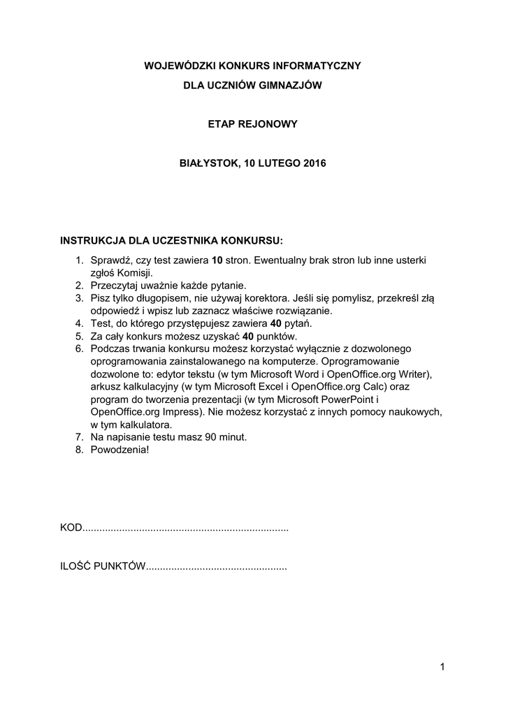 WOJEWÓDZKI KONKURS INFORMATYCZNY DLA UCZNIÓW GIMNAZJÓW ETAP REJONOWY BIAŁYSTOK, 10 LUTEGO 2016 INSTRUKCJA DLA UCZESTNIKA KONKURSU: 1. Sprawdź, czy test zawiera 10 stron. Ewentualny brak stron lub inne usterki zgłoś Komisji. 2. Przeczytaj uważnie każde pytanie. 3. Pisz tylko długopisem, nie używaj korektora. Jeśli się pomylisz, przekreśl złą odpowiedź i wpisz lub zaznacz właściwe rozwiązanie. 4. Test, do którego przystępujesz zawiera 40 pytań. 5. Za cały konkurs możesz uzyskać 40 punktów. 6. Podczas trwania konkursu możesz korzystać wyłącznie z dozwolonego oprogramowania zainstalowanego na komputerze. Oprogramowanie dozwolone to: edytor tekstu (w tym Microsoft Word i OpenOffice.org Writer), arkusz kalkulacyjny (w tym Microsoft Excel i OpenOffice.org Calc) oraz program do tworzenia prezentacji (w tym Microsoft PowerPoint i OpenOffice.org Impress). Nie możesz korzystać z innych pomocy naukowych, w tym kalkulatora. 7. Na napisanie testu masz 90 minut. 8. Powodzenia! KOD......................................................................... ILOŚĆ PUNKTÓW.................................................. 1 1. Jedno słowo to 2 bajty. Ile słów mieści się w kilobajcie? a. 512 b. 500 c. 1000 d. 1024 2. W arkuszu kalkulacyjnym następna kolumna po kolumnie Z ma symbol: a. A b. Z1 c. AA d. END 3. Jaki wynik otrzymamy po wpisaniu do komórki arkusza kalkulacyjnego następującej formuły: =JEŻELI(LUB(1+1=3;2+2=4);5;10) a. 4 b. 3 c. 5 d. 10 4. 0xFF w systemie szesnastkowym to w systemie dwójkowym: a. 1 b. 0xFF c. 255 d. 11111111 5. Algorytm to: a. program komputerowy rozwiązujący skomplikowany problem b. dane (np. liczby), które program wczytuje z pliku podczas swojego działania c. zapis, krok po kroku, jak rozwiązać jakiś problem d. liczba dodawań lub mnożeń wykonanych przez program 2 6. W pamięciach przenośnych USB oraz kartach pamięci stosowana jest pamięć a. FLASH b. ROM c. RAM d. EPROM 7. Jeżeli złożoność obliczeniowa sortowania bąbelkowego jest kwadratowa, to: a. posortowanie 10 liczb zajmie 100 sekund b. jeśli posortowanie 1000 liczb zajmuje 20 sekund, to posortowanie 2000 liczb zajmie 40 sekund c. posortowanie 100 liczb zajmie 10 sekund d. jeśli posortowanie 1000 liczb zajmie 20 sekund, to posortowanie 2000 liczba zajmie 80 sekund 8. Standard IEEE 802.15 to powszechnie znany standard: a. Ethernet b. Bluetooth c. WiMAX d. WLAN (inaczej wifi) 9. Interfejsem do podłączania dysku twardego nie jest: a. RS-232C b. SCSI c. SATA d. ATA 3 10. Za pomocą arkusza kalkulacyjnego próbowano obliczyć wyniki konkursu gry w kości. Zasady były następujące: każdy gracz rzucał 2-krotnie kostką sześcienną, na ogólny wynik składała się suma oczek z obu rzutów oraz premia - za każde wyrzucone 6 oczek - przyznawano dodatkowe 3 punkty. Zaproponuj formułę liczącą wynik dla pierwszego gracza (komórka D2), którą później można by wykorzystać do obliczenia wyniku pozostałych graczy poprzez skopiowanie tej formuły do komórek D3, D4, D5 i D6. a. =SUMA(B2:C2+JEŻELI(B2=6;3;0)+JEŻELI(C2=6;3;0)) b. =SUMA(B2:C2)+JEŻELI(B2=C2=6;3;0) c. =SUMA(B1:C1)+JEŻELI(B1=3;6;0)+JEŻELI(C1=3;6;0) d. =SUMA(B2:C2)+JEŻELI(B2=6;3;0)+JEŻELI(C2=6;3;0) 11. Wybierz prawidłowe wywołanie funkcji LICZ.JEŻELI: a. =LICZ.JEŻELI(B2:B16;”<>konkurs”) b. =LICZ.JEŻELI(A3:A8,”<>konkurs”) c. LICZ.JEŻELI(C1:C4;”konkurs or test”) d. =LICZ.JEŻELI(D5:D59,”konkurs or test”) 12. Interfejs USB w komputerze: a. przesyła dane równolegle - wszystkie bity jednego bajtu na raz b. służy tylko do podłączenia myszki do komputera c. jest obowiązkowym elementem komputera przenośnego d. przesyła dane szeregowo - bit po bicie 4 13. Superkomputer to: a. Komputer zbudowany z największej liczby tranzystorów b. Komputer o największych rozmiarach fizycznych c. Komputer o najbardziej wszechstronnym zastosowaniu d. Komputer, który ma jedną z największych mocy obliczeniowych na świecie w danym momencie 14. Rysunek przedstawia schemat blokowy pewnego algorytmu. Co powinno się znajdować w pustym bloku obliczeniowym, aby na ekran została wypisana liczba 18? a. k:=1 b. k:=4 c. k:=3 d. k:=2 5 15. Bajt to: a. Najmniejsza jednostka w komputerach (może przyjmować wartość 0 lub 1) b. Odpowiednik jednego znaku składający się z 8 bitów c. Jednostka składająca się z 8 elementów d. Jednostka prędkości transmisji danych 16. Ile minimalnie porównań należy wykonać, aby odnaleźć największą liczbę w ciągu n liczb? a. n b. n-1 c. 2n d. n+1 17. Co otrzymamy po wykonaniu poniższego pseudokodu: 1.Pobierz pierwszy element tablicy i podstaw go pod x. 2.Pobierz następny element tablicy. 3.Jeżeli następny element tablicy jest większy niż x, podstaw jego wartość za x. 4.Jeżeli nie ma więcej elementów w tablicy zakończ, w przeciwnym przypadku wróć do punktu 2. a. wartość minimalną elementów tablicy b. wartość maksymalną elementów tablicy c. liczbę elementów tablicy d. wartość średnią elementów tablicy 18. Do poprawnej konfiguracji połączenia w sieciach IPv4 nie jest konieczne: a. adres IP bramy domyślnej b. adres IP urządzenia c. długość przewodu UTP d. maska podsieci 6 19. W kolumnie A w arkuszu umieszczone są kwoty oszczędności, a w komórce B1 stopa roczna oprocentowania. Jaką formułę trzeba wpisać do komórki C1, żeby potem skopiowana do pozostałych wierszy kolumny C wyświetliła ona odsetki dla oszczędności z kolumny A a. =$A$1*B1 b. =$A1*$B1 c. =A1*B1 d. =A1*$B$1 20. Który z algorytmów nie służy do kompresji dźwięku? a. MP3 b. MPEG-4 c. Vorbis d. Windows Media Audio 21. Suma kontrolna, np. pliku, umożliwia: a. sprawdzenie, czy zawartość pliku nie uległa zmianie (przekłamaniu), np. przy przesyłaniu przez sieć, a jeśli tak było - poprawę tego błędu b. sprawdzenie, czy zawartość pliku nie uległa zmianie (przekłamaniu), np. przy przesyłaniu przez sieć c. zaszyfrowanie pliku ta