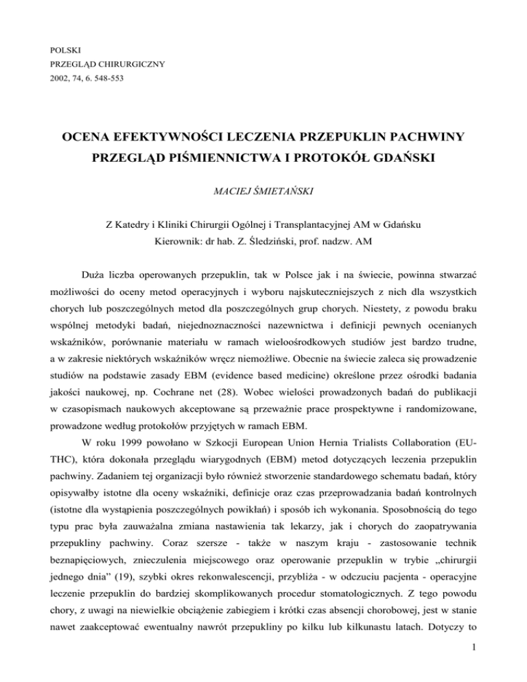 POLSKI PRZEGLĄD CHIRURGICZNY 2002, 74, 6. 548-553 OCENA EFEKTYWNOŚCI LECZENIA PRZEPUKLIN PACHWINY PRZEGLĄD PIŚMIENNICTWA I PROTOKÓŁ GDAŃSKI MACIEJ ŚMIETAŃSKI Z Katedry i Kliniki Chirurgii Ogólnej i Transplantacyjnej AM w Gdańsku Kierownik: dr hab. Z. Śledziński, prof. nadzw. AM DuŜa liczba operowanych przepuklin, tak w Polsce jak i na świecie, powinna stwarzać moŜliwości do oceny metod operacyjnych i wyboru najskuteczniejszych z nich dla wszystkich chorych lub poszczególnych metod dla poszczególnych grup chorych. Niestety, z powodu braku wspólnej metodyki badań, niejednoznaczności nazewnictwa i definicji pewnych ocenianych wskaźników, porównanie materiału w ramach wieloośrodkowych studiów jest bardzo trudne, a w zakresie niektórych wskaźników wręcz niemoŜliwe. Obecnie na świecie zaleca się prowadzenie studiów na podstawie zasady EBM (evidence based medicine) określone przez ośrodki badania jakości naukowej, np. Cochrane net (28). Wobec wielości prowadzonych badań do publikacji w czasopismach naukowych akceptowane są przewaŜnie prace prospektywne i randomizowane, prowadzone według protokołów przyjętych w ramach EBM. W roku 1999 powołano w Szkocji European Union Hernia Trialists Collaboration (EUTHC), która dokonała przeglądu wiarygodnych (EBM) metod dotyczących leczenia przepuklin pachwiny. Zadaniem tej organizacji było równieŜ stworzenie standardowego schematu badań, który opisywałby istotne dla oceny wskaźniki, definicje oraz czas przeprowadzania badań kontrolnych (istotne dla wystąpienia poszczególnych powikłań) i sposób ich wykonania. Sposobnością do tego typu prac była zauwaŜalna zmiana nastawienia tak lekarzy, jak i chorych do zaopatrywania przepukliny pachwiny. Coraz szersze - takŜe w naszym kraju - zastosowanie technik beznapięciowych, znieczulenia miejscowego oraz operowanie przepuklin w trybie „chirurgii jednego dnia” (19), szybki okres rekonwalescencji, przybliŜa - w odczuciu pacjenta - operacyjne leczenie przepuklin do bardziej skomplikowanych procedur stomatologicznych. Z tego powodu chory, z uwagi na niewielkie obciąŜenie zabiegiem i krótki czas absencji chorobowej, jest w stanie nawet zaakceptować ewentualny nawrót przepukliny po kilku lub kilkunastu latach. Dotyczy to 1 zwłaszcza ludzi bardzo aktywnych zawodowo oraz sportowców. Dlatego jak wykazała Sekcja Ekonomiczna EUTHC wskaźnikiem aktualnie ocenianym nie jest wystąpienie nawrotu, lecz tzw. koszt ryzyka nawrotu w stosunku do procedury (13). W tym kontekście zastosowanie siatek syntetycznych w leczeniu przepuklin, mimo wyŜszej ceny samej siatki, jest uwaŜane za tańsze z uwagi na krótszy okres absencji chorobowej i ryzyka opłacenia wtórnej operacji naprawczej. Z uwagi na przedstawiony powyŜej sposób rozumowania głównymi wskaźnikami ocenianymi w protokołach opisujących procedury są one związane z operacją i wczesnym okresem pooperacyjnym (3, 6, 8, 14, 17, 21, 27, 29, 31, 33, 37). Wskaźniki te powinny opierać się na obiektywnych wynikach badań fizykalnych prowadzonych przez lekarza, jak i całkowicie subiektywnych postrzeganych przez chorego. Tylko taka metodyka pozwala na całościowe potraktowanie procedury operacyjnej i porównywanie poszczególnych metod plastyki kanału pachwinowego. Wykazanie sensowności zastosowanej metody badawczej pozwala unikać wyprowadzania wniosków na często przypadkowo dobranych nielicznych wskaźnikach, co prowadzi do obniŜenia wartości badań i zaprze paszcza wysiłki badacza. Bardzo istotne wydaje się być zastosowanie właściwych klasyfikacji przepuklin, z których jedynie klasyfikacja Gilberta w modyfikacji Rutkowa (12) i klasyfikacja Nyhusa dostosowane są do idei zaopatrywania przepuklin pachwiny metodami beznapięciowymi (32). TakŜe niezwykle istotne wydaje się być właściwe ocenienie współistniejących czynników ryzyka operacyjnego, w których zastosowanie klasyfikacji ASA jest powszechnie przyjęte i standaryzowane. Współistnienie cukrzycy, otyłości i innych chorób metabolicznych powinno być równieŜ uwzględnione w protokóle jako mogące mieć wpływ na proces gojenia rany pooperacyjnej. Dyskusyjne jest wymaganie od chorych licznych badań biochemicznych. Rutkow i wsp. wymagają jedynie morfologii krwi obwodowej i badania ekg po 45 r.Ŝ. (23). Wyniki tych badań nie mają jednak wpływu na sposób operowania przy zastosowaniu znieczulenia miejscowego i jako takie nie powinny znajdować się w opisie badanej populacji. Z punktu widzenia praktycznego badanie układu krzepnięcia ma znaczenie dla zastosowania niektórych technik operacyjnych, podczas których preparowanie odbywa się „na ślepo”, istnieje więc zagroŜenie przeoczenia krwawienia i brak moŜliwości jego zaopatrzenia bez znacznego rozszerzenia zakresu operacji (Prolene Hernia System). Dla porównywania zabiegów chirurgicznych ma znaczenie zastosowane znieczulenie. Wskazanym jest więc podanie jego rodzaju, w tym takŜe rodzaju znieczulenia miejscowego (nasiękowe (1) czy blokada nerwów (11,30) oraz dlaczego tego rodzaju znieczulenia wybrano do prowadzenia badań. W przypadku zastosowania znieczulenia miejscowego istotnym jest takŜe rodzaj zastosowanego środka i jego ilość (lignokaina lub inne), co ma wpływ na ocenę dolegliwości bólowych równieŜ w okresie pooperacyjnym z uwagi na farmakokinetykę i farmakodynamikę 2 preparatów. Miernik tej oceny (ból w czasie zabiegu i ból w pierwszej dobie pooperacyjnej) niejednokrotnie przesądza o postrzeganiu przez chorego zabiegu jako całości i jest istotnym wskaźnikiem warunkującym zastosowanie metody w warunkach takiego znieczulenia. Czas zabiegu i jego definicja budzą pewne kontrowersje dotyczące definicji. W ośrodku gdańskim przyjęliśmy określić czas zabiegu jako czas od podania środka znieczulającego (pierwsze naruszenie powłok) do zakończenia szwu skórnego. Jednak Kingsnorth i wsp. (14) (pierwsze randomizowane ba