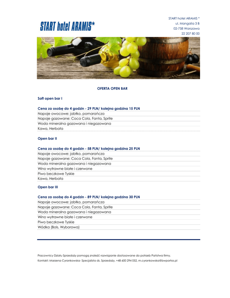START hotel ARAMIS * ul. Mangalia 3 B 02-758 Warszawa 22 207 80 00 OFERTA OPEN BAR Soft open bar I Cena za osobę do 4 godzin - 29 PLN/ kolejna godzina 15 PLN Napoje owocowe: jabłko, pomarańcza Napoje gazowane: Coca Cola, Fanta, Sprite Woda mineralna gazowana i niegazowana Kawa, Herbata Open bar II Cena za osobę do 4 godzin - 58 PLN/ kolejna godzina 25 PLN Napoje owocowe: jabłko, pomarańcza Napoje gazowane: Coca Cola, Fanta, Sprite Woda mineralna gazowana i niegazowana Wino wytrawne białe i czerwone Piwo beczkowe Tyskie Kawa, Herbata Open bar III Cena za osobę do 4 godzin - 89 PLN/ kolejna godzina 30 PLN Napoje owocowe: jabłko, pomarańcza Napoje gazowane: Coca Cola, Fanta, Sprite Woda mineralna gazowana i niegazowana Wino wytrawne białe i czerwone Piwo beczkowe Tyskie Wódka (Bols, Wyborowa) Pracownicy Działu Sprzedaży pomogą znaleźć rozwiązanie dostosowane do potrzeb Państwa firmy. Kontakt: Marzena Cyrankowska- Specjalista ds. Sprzedaży, +48 600 294 052, [email protected]