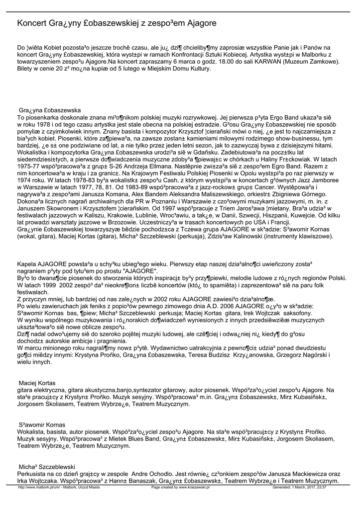 Koncert Gra¿yny £obaszewskiej z zespo³em Ajagore Do ¦wiêta Kobiet pozosta³o jeszcze trochê czasu, ale ju¿ dzi¶ chcieliby¶my zaprosiæ wszystkie Panie jak i Panów na koncert Gra¿yny £obaszewskiej, która wyst±pi w ramach Konfrontacji Sztuki Kobiecej. Artystka wyst±pi w Malborku z towarzyszeniem zespo³u Ajagore.Na koncert zapraszamy 6 marca o godz. 18.00 do sali KARWAN (Muzeum Zamkowe). Bilety w cenie 20 z³ mo¿na kupiæ od 5 lutego w Miejskim Domu Kultury. Gra¿yna £obaszewska To piosenkarka doskonale znana mi³o¶nikom polskiej muzyki rozrywkowej. Jej pierwsza p³yta Ergo Band ukaza³a siê w roku 1978 i od tego czasu artystka jest stale obecna na polskiej estradzie. G³osu Gra¿yny £obaszewskiej nie sposób pomyliæ z czyimkolwiek innym. Znany basista i kompozytor Krzysztof ¦cierañski mówi o niej, ¿e jest to najczarniejsza z bia³ych kobiet. Piosenki, które za¶piewa³a, na zawsze zostan± kamieniami milowymi rodzimego show-businessu, tym bardziej, ¿e s± one podziwiane od lat, a nie tylko przez jeden letni sezon, jak to zazwyczaj bywa z dzisiejszymi hitami. Wokalistka i kompozytorka Gra¿yna £obaszewska urodzi³a siê w Gdañsku. Zadebiutowa³a na pocz±tku lat siedemdziesi±tych, a pierwsze do¶wiadczenia muzyczne zdoby³a ¶piewaj±c w chórkach u Haliny Fr±ckowiak. W latach 1975-77 wspó³pracowa³a z grup± S-26 Andrzeja Ellmana. Nastêpnie zwi±za³a siê z zespo³em Egro Band. Razem z nim koncertowa³a w kraju i za granic±. Na Krajowym Festiwalu Polskiej Piosenki w Opolu wyst±pi³a po raz pierwszy w 1974 roku. W latach 1978-83 by³a wokalistk± zespo³u Cash, z którym wyst±pi³a w koncertach g³ównych Jazz Jamboree w Warszawie w latach 1977, 78, 81. Od 1983-89 wspó³pracowa³a z jazz-rockow± grup± Cancer. Wystêpowa³a i nagrywa³a z zespo³ami Janusza Komana, Alex Bandem Aleksandra Maliszewskiego, orkiestr± Zbigniewa Górnego. Dokona³a licznych nagrañ archiwalnych dla PR w Poznaniu i Warszawie z czo³owymi muzykami jazzowymi, m. in. z Januszem Skowronem i Krzysztofem ¦cierañskim. Od 1997 wspó³pracuje z Triem Jaros³awa ¦mietany. Bra³a udzia³ w festiwalach jazzowych w Kaliszu, Krakowie, Lublinie, Wroc³awiu, a tak¿e, w Danii, Szwecji, Hiszpanii, Kuwejcie. Od kilku lat prowadzi warsztaty jazzowe w Brzozowie. Uczestniczy³a w trasach koncertowych po USA i Francji. Gra¿ynie £obaszewskiej towarzyszyæ bêdzie pochodz±ca z Tczewa grupa AJAGORE w sk³adzie: S³awomir Kornas (wokal, gitara), Maciej Kortas (gitara), Micha³ Szczeblewski (perkusja), Zdzis³aw Kalinowski (instrumenty klawiszowe). Kapela AJAGORE powsta³a u schy³ku ubieg³ego wieku. Pierwszy etap naszej dzia³alno¶ci uwieñczony zosta³ nagraniem p³yty pod tytu³em po prostu "AJAGORE". By³o to dwana¶cie piosenek do stworzenia których inspiracj± by³y przy¶piewki, melodie ludowe z ró¿nych regionów Polski. W latach 1999 2002 zespó³ da³ nieokre¶lon± liczbê koncertów (któ¿ to spamiêta) i zaprezentowa³ siê na paru folk festiwalach. Z przyczyn mniej, lub bardziej od nas zale¿nych w 2002 roku AJAGORE zawiesi³o dzia³alno¶æ. Po wielu zawieruchach jak feniks z popio³ów pewnego zimowego dnia A.D. 2006 AJAGORE o¿y³o w sk³adzie: S³awomir Kornas bas, ¶piew; Micha³ Szczeblewski perkusja; Maciej Kortas gitara, Irek Wojtczak saksofony. W wyniku wspólnego muzykowania i ró¿norakich do¶wiadczeñ wyniesionych z innych przedsiêwziêæ muzycznych ukszta³towa³o siê nowe oblicze zespo³u. Dzi¶ nadal odwo³ujemy siê do szeroko pojêtej muzyki ludowej, ale czê¶ciej i odwa¿niej ni¿ kiedy¶ do g³osu dochodz± autorskie ambicje i pragnienia. W marcu minionego roku nagrali¶my now± p³ytê. Wydawnictwo uatrakcyjnia z pewno¶ci± udzia³ ponad dwudziestu go¶ci miêdzy innymi: Krystyna Proñko, Gra¿yna £obaszewska, Teresa Budzisz Krzy¿anowska, Grzegorz Nagórski i wielu innych. Maciej Kortas gitara elektryczna, gitara akustyczna,banjo,syntezator gitarowy, autor piosenek. Wspó³za³o¿yciel zespo³u Ajagore. Na sta³e pracuj±cy z Krystyn± Proñko. Muzyk sesyjny. Wspó³pracowa³ m.in. Gra¿yn± £obaszewsk±, Mir± Kubasiñsk±, Jorgosem Skoliasem, Teatrem Wybrze¿e, Teatrem Muzycznym. S³awomir Kornas Wokalista, basista, autor piosenek. Wspó³za³o¿yciel zespo³u Ajagore. Na sta³e wspó³pracuj±cy z Krystyn± Proñko. Muzyk sesyjny. Wspó³pracowa³ z Mietek Blues Band, Gra¿yn± £obaszewsk±, Mir± Kubasiñsk±, Jorgosem Skoliasem, Teatrem Wybrze¿e, Teatrem Muzycznym. Micha³ Szczeblewski Perkusista na co dzieñ graj±cy w zespole Andre Ochodlo. Jest równie¿ cz³onkiem zespo³ów Janusza Mackiewicza oraz Irka Wojtczaka. Wspó³pracowa³ z Hann± Banaszak, Gra¿yn± £obaszewsk±, Teatrem Wybrze¿e i Teatrem Muzycznym. http://www.malbork.pl/um/ - Malbork, Urz±d Miasta Page created by www.kraszewski.pl Generated: 1 March, 2017, 23:37 Irek Wojtczak Saksofonista, kompozytor, aran¿er, absolwent Akademii Muzycznej w Gdañsku. W roku 2000 jako wspó³twórca trójmiejskiej grupy GROOVEKOJAD otrzymuje nagrodê FRYDERYK 2000 - w kategorii Muzyka Alternatywna, a w 2001 roku nagrodê POLISH DANCE AWARDS za debiut roku. Pracuj±c jako muzyk sesyjny nagrywa dla potrzeb filmu i teatru - nagrania do trans-opery SEN NOCY LETNIEJ, muzyki Leszka Mo¿d¿era, filmu 'SEGMENT 76' w re¿yserii Oskara Kaszyñskiego. W 2004 roku jako IREK WOJTCZAK QUARTET nagrywa p³ytê "LOOK TO THE SKY" z muzyk± Antonio Carlosa Jobima a w roku 2005 swój pierwszy autorski album "OUTLOOK". Wiêcej szczegó³ów na temat Irka znajd± Pañstwo na jego oficjalnej stronie internetowej. http://www.malbork.pl/um/ - Malbork, Urz±d Miasta Page created by www.kraszewski.pl Generated: 1 March, 2017, 23:37