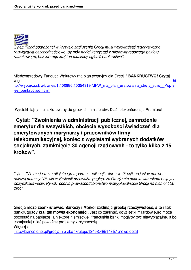 Grecja już tylko krok przed bankructwem Cytat:"Rząd pogrążonej w kryzysie zadłużenia Grecji musi wprowadzać rygorystyczne rozwiązania oszczędnościowe, by móc nadal korzystać z międzynarodowego pakietu ratunkowego, bez którego kraj ten musiałby ogłosić bankructwo". Międzynarodowy Fundusz Walutowy ma plan awaryjny dla Grecji " BANKRUCTWO! Czytaj więcej: ht tp://wyborcza.biz/biznes/1,100896,10354319,MFW_ma_plan_uratowania_strefy_euro__Poprz ez_bankructwo.html Wyciekł tajny mail skierowany do greckich ministerstw. Dziś telekonferencja Premiera! Cytat: "Zwolnienia w administracji publicznej, zamrożenie emerytur dla wszystkich, obcięcie wysokości świadczeń dla emerytowanych marynarzy i pracowników firmy telekomunikacyjnej, koniec z wypłatami wybranych dodatków socjalnych, zamknięcie 30 agencji rządowych - to tylko kilka z 15 kroków". Cytat: "Nie ma jeszcze oficjalnego raportu z realizacji reform w Grecji, co jest warunkiem dalszej pomocy UE, ale w Brukseli przeważa pogląd, że Grecja nie podoła warunkom unijnych pożyczkodawców. Rynek ocenia prawdopodobieństwo niewypłacalności Grecji na niemal 100 proc". Grecja może zbankrutować. Sarkozy i Merkel zaklinaja grecką rzeczywistość, a to i tak bankrutujący kraj tak mówia ekonomiści. Jest co zaklinać, gdyż setki milardów euro może pozostać na papierze, a niektóre niemieckie i francuskie banki mogłyby być niewypłacalne, albo conajmniej mieć poważne problemy z płynnością . Więcej : http://biznes.onet.pl/grecja-nie-zbankrutuje,18493,4851485,1,news-detal 1/2 Grecja już tylko krok przed bankructwem Ankieta z portalu interia.pl Cytat: "Nie należy reanimować trupa- tak mówią "lekarze". Z mojego punktu widzenia Grecja jest w stanie agonii i dotacje w wysokości przyznanej przez EBC to kropla w morzu potrzeb. Wydłuży to tylko w czasie jej nieuniknione bankructwo". Cytat: "Dzisiejszy system finansowy musi się skończyć. Oby nowy wykuwał się na zasadzie umowy społecznej, ewolucji, otrzeźwienia światowych decydentów, a nie krwawej rewolucji czy światowego wstrząsu, skutkującego niemożnością odzyskania oszczędności i masowego zrywu na banki, zatrzymania płynności w sektorze bankowym". Czytaj również dlaczego kryzys może być jak zaraza: http://finan se.wp.pl/kat,102634,title,Kryzys-jak-zaraza,wid,13792987,wiadomo sc.html 2/2