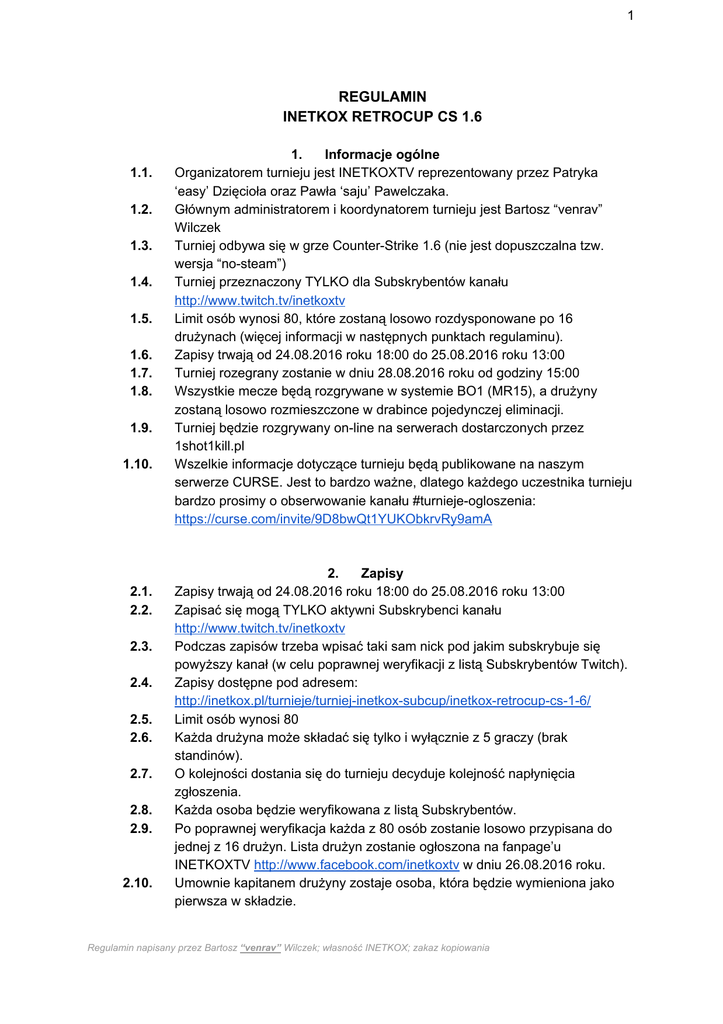 REGULAMIN INETKOX RETROCUP CS 1.6