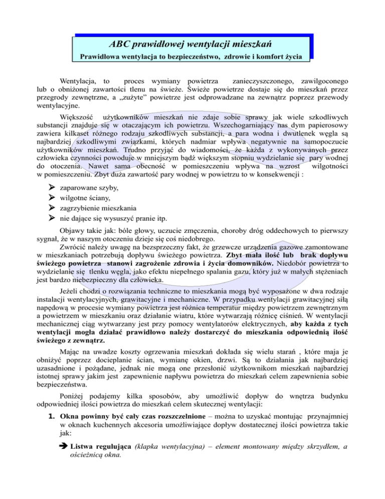ABC prawidłowej wentylacji mieszkań Prawidłowa wentylacja to bezpieczeństwo, zdrowie i komfort życia Wentylacja, to proces wymiany powietrza zanieczyszczonego, zawilgoconego lub o obniżonej zawartości tlenu na świeże. Świeże powietrze dostaje się do mieszkań przez przegrody zewnętrzne, a „zużyte” powietrze jest odprowadzane na zewnątrz poprzez przewody wentylacyjne. Większość użytkowników mieszkań nie zdaje sobie sprawy jak wiele szkodliwych substancji znajduje się w otaczającym ich powietrzu. Wszechogarniający nas dym papierosowy zawiera kilkaset różnego rodzaju szkodliwych substancji, a para wodna i dwutlenek węgla są najbardziej szkodliwymi związkami, których nadmiar wpływa negatywnie na samopoczucie użytkowników mieszkań. Trudno przyjąć do wiadomości, że każda z wykonywanych przez człowieka czynności powoduje w mniejszym bądź większym stopniu wydzielanie się pary wodnej do otoczenia. Nawet sama obecność w pomieszczeniu wpływa na wzrost wilgotności w pomieszczeniu. Zbyt duża zawartość pary wodnej w powietrzu to w konsekwencji : ➢ ➢ ➢ ➢ zaparowane szyby, wilgotne ściany, zagrzybienie mieszkania nie dające się wysuszyć pranie itp. Objawy takie jak: bóle głowy, uczucie zmęczenia, choroby dróg oddechowych to pierwszy sygnał, że w naszym otoczeniu dzieje się coś niedobrego. Zwrócić należy uwagę na bezsprzeczny fakt, że grzewcze urządzenia gazowe zamontowane w mieszkaniach potrzebują dopływu świeżego powietrza. Zbyt mała ilość lub brak dopływu świeżego powietrza stanowi zagrożenie zdrowia i życia domowników. Niedobór powietrza to wydzielanie się tlenku węgla, jako efektu niepełnego spalania gazu, który już w małych stężeniach jest bardzo niebezpieczny dla człowieka. Jeżeli chodzi o rozwiązania techniczne to mieszkania mogą być wyposażone w dwa rodzaje instalacji wentylacyjnych, grawitacyjne i mechaniczne. W przypadku wentylacji grawitacyjnej siłą napędową w procesie wymiany powietrza jest różnica temperatur między powietrzem zewnętrznym a powietrzem w mieszkaniu oraz działanie wiatru, które wytwarzają różnicę ciśnień. W wentylacji mechanicznej ciąg wytwarzany jest przy pomocy wentylatorów elektrycznych, aby każda z tych wentylacji mogła działać prawidłowo należy dostarczyć do mieszkania odpowiednią ilość świeżego z zewnątrz. Mając na uwadze koszty ogrzewania mieszkań dokłada się wielu starań , które maja je obniżyć poprzez docieplanie ścian, wymianę okien, drzwi. Są to działania jak najbardziej uzasadnione i pożądane, jednak nie mogą one przesłonić użytkownikom mieszkań najbardziej istotnej sprawy jakim jest zapewnienie napływu powietrza do mieszkań celem zapewnienia sobie bezpieczeństwa. Poniżej podajemy kilka sposobów, aby umożliwić dopływ do wnętrza budynku odpowiedniej ilości powietrza do mieszkań celem skutecznej wentylacji: 1. Okna powinny być cały czas rozszczelnione – można to uzyskać montując przynajmniej w oknach kuchennych akcesoria umożliwiające dopływ dostatecznej ilości powietrza takie jak: ➔ Listwa regulująca (klapka wentylacyjna) – element montowany między skrzydłem, a ościeżnicą okna. ➔ Nawiewnik okienny - element montowany w profilu okna. Ze względu na sposób regulacji stosowane są nawiewniki: higrosterowane (otwarcie zależne od wilgotności), ciśnieniowe (otwarcie zależne od różnicy ciśnień) oraz sterowane ręcznie. Wietrzenie odbywa się samoczynnie, bez aktywnego udziału domowników. 2. Wszystkie nowo montowane okna muszą mieć możliwość rozszczelnienia czyli tzw. mikrowentylację lub inaczej mikrouchył. 3. Jeśli nie ma możliwości wyposażania okien w powyższe elementy z powodów braku możliwości finansowych, można „ratować” się poprzez usunięcie fragmentów uszczelek. Przez tak powstałe otwory powietrze zewnętrzne przedostaje się do wnętrza pomieszczenia. jednak nie będziemy mieli możliwości regulowania ilości nawiewanego powietrza. ABC prawidłowej wentylacji mieszkań to zastosowanie się do kilku podstawowych zasad: 1. Mieszkania należy użytkować mając okna rozszczelnione, celem dostarczenia do mieszkania wystarczającej ilości powietrza zapewniającego właściwe działanie wentylacji. 2. Nawietrzaki okienne powinny pozostawać w pozycji otwartej i należy je okresowo czyścić zalecane co najmniej raz w miesiącu, aby zapewnić ich pełna drożność. 3. Zabronione jest zasłanianie kratek wentylacyjnych w mieszkaniach (zamontowanych w ścianach i drzwiach łazienkowych). Żaluzje kratek muszą pozostać w stanie otwartym. 4. Obowiązkowo należy okresowo czyścić siatki ochronne w kratkach, są one częstokroć przytkane brudem przez co blokują dopływ powietrza. 5. Mieszkania należy wietrzyć regularnie – krótko ale intensywnie – zalecane 2 razy dziennie. 6. Ogrzewania mieszkań nie wolno ograniczać na tyle, aby temperatura powietrza spadała poniżej 16OC 7. W budynkach wielorodzinnych wyposażonych tylko w grawitację wentylacyjną zabroniony jest montaż wyciągów kuchennych oraz wentylatorów łazienkowych. Praca tych urządzeń powoduje nawiew powietrza sąsiednimi szufladami kominowymi znajdującymi się w mieszkaniu. 8. W przypadku podejrzeń , że system wentylacji pracuje nieprawidłowo należy w trybie natychmiastowym powiadamiać o tym Zarządcę - Przedsiębiorstwo Gospodarki Mieszkaniowej spółka z o.o tel. 12/276 -23- 60 . Zastosowanie się do powyższych wskazówek podniesie komfort użytkowania mieszkań gdyż pozwoli uniknąć zawilgocenia i zagrzybienia mieszkań oraz co najważniejsze zapewni bezpieczeństwo użytkownikom mieszkań. PAMIĘTAJMY!!!!!!!!!!!!! Do mieszkania musi być dostarczane powietrze, gdyż w przypadku jego braku jeden z kominów wentylacyjnych lub spalinowych staje się miejscem uzupełniania jego braku. W przypadku braku powietrza w mieszkaniu,przez kratki zamiast powietrze być