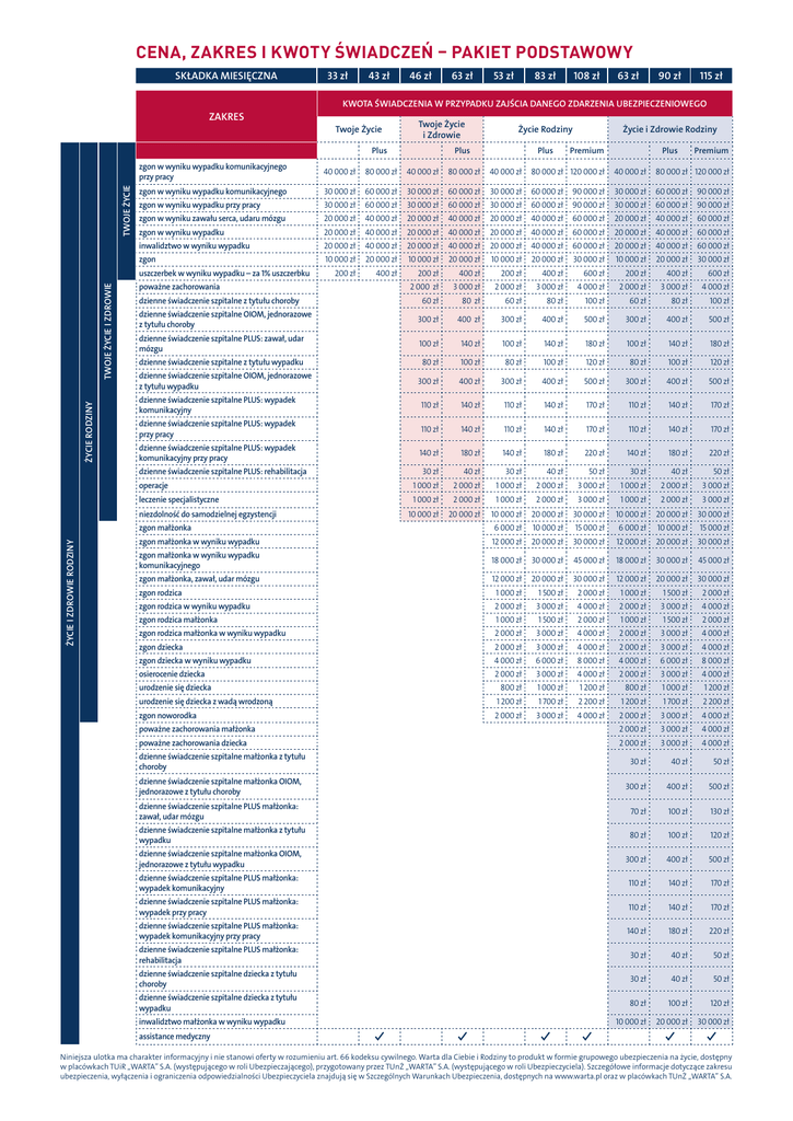 CENA, ZAKRES I KWOTY ŚWIADCZEŃ – PAKIET PODSTAWOWY SKŁADKA MIESIĘCZNA ZAKRES 33 zł 43 zł 46 zł TWOJE ŻYCIE TWOJE ŻYCIE I ZDROWIE 83 zł 108 zł 63 zł 90 zł 115 zł Twoje Życie Twoje Życie i Zdrowie Życie Rodziny Życie i Zdrowie Rodziny Plus Plus Plus Premium Premium zgon w wyniku wypadku komunikacyjnego przy pracy 40 000 zł 80 000 zł 40 000 zł 80 000 zł 40 000 zł 80 000 zł 120 000 zł 40 000 zł 80 000 zł 120 000 zł zgon w wyniku wypadku komunikacyjnego 30 000 zł 60 000 zł 30 000 zł 60 000 zł 30 000 zł 60 000 zł 90 000 zł 30 000 zł 60 000 zł 90 000 zł zgon w wyniku wypadku przy pracy 30 000 zł 60 000 zł 30 000 zł 60 000 zł 30 000 zł 60 000 zł 90 000 zł 30 000 zł 60 000 zł 90 000 zł zgon w wyniku zawału serca, udaru mózgu 20 000 zł 40 000 zł 20 000 zł 40 000 zł 20 000 zł 40 000 zł 60 000 zł 20 000 zł 40 000 zł 60 000 zł zgon w wyniku wypadku 20 000 zł 40 000 zł 20 000 zł 40 000 zł 20 000 zł 40 000 zł 60 000 zł 20 000 zł 40 000 zł 60 000 zł inwalidztwo w wyniku wypadku 20 000 zł 40 000 zł 20 000 zł 40 000 zł 20 000 zł 40 000 zł 60 000 zł 20 000 zł 40 000 zł 60 000 zł zgon 10 000 zł 20 000 zł 10 000 zł 20 000 zł 10 000 zł 20 000 zł 30 000 zł 10 000 zł 20 000 zł 30 000 zł 200 zł 400 zł 200 zł 400 zł 200 zł 400 zł 600 zł 200 zł 400 zł 600 zł 2 000 zł 3 000 zł 2 000 zł 3 000 zł 4 000 zł 2 000 zł 3 000 zł 4 000 zł uszczerbek w wyniku wypadku – za 1% uszczerbku ŻYCIE RODZINY 53 zł KWOTA ŚWIADCZENIA W PRZYPADKU ZAJŚCIA DANEGO ZDARZENIA UBEZPIECZENIOWEGO Plus poważne zachorowania dzienne świadczenie szpitalne z tytułu choroby 60 zł 80 zł 60 zł 80 zł 100 zł 60 zł 80 zł 100 zł dzienne świadczenie szpitalne OIOM, jednorazowe z tytułu choroby 300 zł 400 zł 300 zł 400 zł 500 zł 300 zł 400 zł 500 zł dzienne świadczenie szpitalne PLUS: zawał, udar mózgu 100 zł 140 zł 100 zł 140 zł 180 zł 100 zł 140 zł 180 zł dzienne świadczenie szpitalne z tytułu wypadku 80 zł 100 zł 80 zł 100 zł 120 zł 80 zł 100 zł 120 zł dzienne świadczenie szpitalne OIOM, jednorazowe z tytułu wypadku 300 zł 400 zł 300 zł 400 zł 500 zł 300 zł 400 zł 500 zł dzienne świadczenie szpitalne PLUS: wypadek komunikacyjny 110 zł 140 zł 110 zł 140 zł 170 zł 110 zł 140 zł 170 zł dzienne świadczenie szpitalne PLUS: wypadek przy pracy 110 zł 140 zł 110 zł 140 zł 170 zł 110 zł 140 zł 170 zł dzienne świadczenie szpitalne PLUS: wypadek komunikacyjny przy pracy 140 zł 180 zł 140 zł 180 zł 220 zł 140 zł 180 zł 220 zł dzienne świadczenie szpitalne PLUS: rehabilitacja operacje leczenie specjalistyczne niezdolność do samodzielnej egzystencji ŻYCIE I ZDROWIE RODZINY 63 zł 30 zł 40 zł 30 zł 40 zł 50 zł 30 zł 40 zł 50 zł 1 000 zł 2 000 zł 1 000 zł 2 000 zł 3 000 zł 1 000 zł 2 000 zł 3 000 zł 1 000 zł 2 000 zł 1 000 zł 2 000 zł 3 000 zł 1 000 zł 2 000 zł 3 000 zł 10 000 zł 20 000 zł 10 000 zł 20 000 zł 30 000 zł 10 000 zł 20 000 zł 30 000 zł zgon małżonka 6 000 zł 10 000 zł 15 000 zł 6 000 zł 10 000 zł 15 000 zł zgon małżonka w wyniku wypadku 12 000 zł 20 000 zł 30 000 zł 12 000 zł 20 000 zł 30 000 zł zgon małżonka w wyniku wypadku komunikacyjnego 18 000 zł 30 000 zł 45 000 zł 18 000 zł 30 000 zł 45 000 zł zgon małżonka, zawał, udar mózgu 30 000 zł 12 000 zł 20 000 zł 30 000 zł 12 000 zł 20 000 zł zgon rodzica 1 000 zł 1 500 zł 2 000 zł 1 000 zł 1 500 zł 2 000 zł zgon rodzica w wyniku wypadku 2 000 zł 3 000 zł 4 000 zł 2 000 zł 3 000 zł 4 000 zł zgon rodzica małżonka 1 000 zł 1 500 zł 2 000 zł 1 000 zł 1 500 zł 2 000 zł zgon rodzica małżonka w wyniku wypadku 2 000 zł 3 000 zł 4 000 zł 2 000 zł 3 000 zł 4 000 zł zgon dziecka 2 000 zł 3 000 zł 4 000 zł 2 000 zł 3 000 zł 4 000 zł zgon dziecka w wyniku wypadku 4 000 zł 6 000 zł 8 000 zł 4 000 zł 6 000 zł 8 000 zł osierocenie dziecka 2 000 zł 3 000 zł 4 000 zł 2 000 zł 3 000 zł 4 000 zł 800 zł 1 000 zł 1 200 zł 800 zł 1 000 zł 1 200 zł urodzenie się dziecka z wadą wrodzoną 1 200 zł 1 700 zł 2 200 zł 1 200 zł 1 700 zł 2 200 zł zgon noworodka 2 000 zł 3 000 zł 4 000 zł urodzenie się dziecka 2 000 zł 3 000 zł 4 000 zł poważne zachorowania małżonka 2 000 zł 3 000 zł 4 000 zł poważne zachorowania dziecka 2 000 zł 3 000 zł 4 000 zł dzienne świadczenie szpitalne małżonka z tytułu choroby 30 zł 40 zł 50 zł dzienne świadczenie szpitalne małżonka OIOM, jednorazowe z tytułu choroby 300 zł 400 zł 500 zł dzienne świadczenie szpitalne PLUS małżonka: zawał, udar mózgu 70 zł 100 zł 130 zł dzienne świadczenie szpitalne małżonka z tytułu wypadku 80 zł 100 zł 120 zł dzienne świadczenie szpitalne małżonka OIOM, jednorazowe z tytułu wypadku 300 zł 400 zł 500 zł dzienne świadczenie szpitalne PLUS małżonka: wypadek komunikacyjny 110 zł 140 zł 170 zł dzienne świadczenie szpitalne PLUS małżonka: wypadek przy pracy 110 zł 140 zł 170 zł dzienne świadczenie szpitalne PLUS małżonka: wypadek komunikacyjny przy pracy 140 zł 180 zł 220 zł dzienne świadczenie szpitalne PLUS małżonka: rehabilitacja 30 zł 40 zł 50 zł dzienne świadczenie szpitalne dziecka z tytułu choroby 30 zł 40 zł 50 zł dzienne świadczenie szpitalne dziecka z tytułu wypadku 80 zł 100 zł 120 zł 10 000 zł 20 000 zł 30 000 zł inwalidztwo małżonka w wyniku wypadku assistance medyczny Niniejsza ulotka ma charakter informacyjny i nie stanowi oferty w rozumieniu art. 66 kodeksu cywilnego. Warta dla Ciebie i Rodziny to produkt w formie grupowego ubezpieczenia na życie, dostępny w placówkach TUiR „WARTA” S.A. (występującego w roli Ubezpieczającego), przygotowany przez TUnŻ „WARTA” S.A. (występującego w roli Ubezpieczyciela). Szczegółowe informacje dotyczące zakresu ubezpieczenia, wyłączenia i ograniczenia odpowiedzialności Ubezpieczyciela znajdują się w Szcze