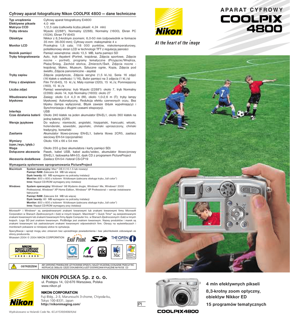 A PA R AT C Y F R O W Y Cyfrowy aparat fotograficzny Nikon COOLPIX 4800 — dane techniczne Typ urządzenia Efektywne piksele Matryca CCD Tryby obrazu Obiektyw Monitor LCD Nośnik pamięci Tryby fotografowania Tryby zapisu Filmy z dźwiękiem Liczba zdjęć Wbudowana lampa błyskowa Interfejs Czas działania baterii Wersje językowe Zasilanie Wymiary (szer./wys./głęb.) Waga Dołączone akcesoria Cyfrowy aparat fotograficzny E4800 4,0 mln 1/2,5 cala (całkowita liczba pikseli: 4,24 mln) Wysoki (2288*), Normalny (2288), Normalny (1600), Ekran PC (1024), Ekran TV (640) Nikkor z 8,3-krotnym zoomem; 6,0-50 mm (odpowiednik w formacie 35 mm: 36-300 mm); Cyfrowy zoom: maksymalnie 4 x Przekątna 1,8 cala; 118 000 punktów, niskotemperaturowy, polisilikonowy ekran LCD w technologii TFT z regulacją jasności Pamięć wewnętrzna: około 13,5 MB, karta pamięci SD Auto, tryb Asystent (Portret, krajobraz, Zdjęcia sportowe, Zdjęcie nocne - portret), programy tematyczne (Przyjęcie/Wnętrza, Plaża/Śnieg, Zachód słońca, Zmierzch/Świt, Zdjęcia nocne krajobraz, Makro, Muzeum, Sztuczne ognie, Kopia, Zdjęcia pod światło, Zdjęcia panoramiczne - asysta) Zdjęcia pojedyncze, Zdjęcia seryjne (1,5 kl./s), Seria 16 zdjęć (16 klatek o wielkości 1/16), Bufor pamięci na 3 zdjęcia (1 kl./s) Film TV (640), 15 kl./s; Mały rozmiar (320), 15 kl./s; Pomniejszony (160), 15 kl./s Pamięć wewnętrzna: tryb Wysoki (2288*): około 7, tryb Normalny (2288): około 14, tryb Normalny (1600): około 27 Zasięg: około 0,4 4,3 m (W), około 1,0-2,6 m (T); tryby lampy błyskowej: Automatyczny, Redukcja efektu czerwonych oczu, Bez błysku (lampa wyłączona), Błysk zawsze (błysk wypełniający) i Synchronizacja z długimi czasami ekspozycji. USB Około 240 klatek na jeden akumulator EN-EL1, około 360 klatek na jedną baterię 2CR5 Do wyboru: niemiecki, angielski, hiszpański, francuski, włoski, holenderski, szwedzki, japoński, chiński uproszczony, chiński tradycyjny, koreański Akumulator litowo-jonowy EN-EL1, bateria litowa 2CR5, zasilacz sieciowy EH-54 (opcjonalnie) Około 106 x 66 x 54 mm Około 255 g (bez akumulatora i karty pamięci SD) Pasek, kabel USB, kabel audio/wideo, akumulator litowo-jonowy EN-EL1, ładowarka MH-53, dysk CD z programem PictureProject Akcesoria dodatkowe Zasilacz EH-54 i futerał CS-CP19 Wymagania systemowe oprogramowania PictureProject Macintosh System operacyjny: Mac® OS X (10.1.5 lub nowszy) Pamięć RAM: Zalecane 64 MB lub więcej Dysk twardy: 60 MB wymagane na potrzeby instalacji Monitor: 800 x 600 z kolorem 16-bitowym (zalecana obsługa trybu „full color”) Inne: Napęd CD-ROM wymagany przy instalacji Windows System operacyjny: Windows® 98 Wydanie drugie, Windows® Me, Windows® 2000 Professional, Windows® XP Home Edition, Windows® XP Professional — wersje instalowane fabrycznie Pamięć RAM: Zalecane 64 MB lub więcej Dysk twardy: 60 MB wymagane na potrzeby instalacji Monitor: 800 x 600 z kolorem 16-bitowym (zalecana obsługa trybu „full color”) Inne: Napęd CD-ROM wymagany przy instalacji Microsoft® i Windows® są zarejestrowanymi znakami towarowymi lub znakami towarowymi firmy Microsoft Corporation w Stanach Zjednoczonych i (lub) w innych krajach. Macintosh® i Quick Time® są zarejestrowanymi znakami towarowymi lub znakami towarowymi firmy Apple Computer Inc. w Stanach Zjednoczonych i (lub) w innych krajach. Logo SD jest znakiem towarowym. PictBridge jest znakiem towarowym. Nazwy produktów i marek są znakami towarowymi lub zastrzeżonymi znakami towarowymi odpowiednich firm. Obrazy na wyświetlaczach i monitorach pokazane w niniejszej ulotce to symulacja. Specyfikacje i sprzęt mogą ulec zmianom bez uprzedniego powiadomienia i bez jakichkolwiek zobowiązań ze strony producenta. Wrzesień 2004 © 2004 NIKON CORPORATION OSTRZEŻENI ABY ZAPEWNIĆ PRAWIDŁOWE UŻYTKOWANIE SPRZĘTU, NALEŻY WCZEŚNIEJ DOKŁADNIE PRZECZYTAĆ INSTRUKCJĘ OBSŁUGI. CZĘŚĆ DOKUMENTACJI JEST DOSTARCZANA WYŁĄCZNIE NA PŁYCIE CD NIKON POLSKA Sp. z o. o. ul. Postępu 14, 02-676 Warszawa, Polska www.nikon.pl Fuji Bldg., 2-3, Marunouchi 3-chome, Chiyoda-ku, Tokyo 100-8331, Japan http://nikonimaging.com/ Wydrukowano w Holandii Code No. 6CL41530(0408/A)Ad 4 mln efektywnych pikseli 8,3-krotny zoom optyczny, obiektyw Nikkor ED Pl 15 programów tematycznych Wykorzystaj szansę, by uwiecznić moment Korzystając z aparatu COOLPIX 4800 o rozdzielczości 4 mln efektywnych pikseli, uzyskasz imponujące zdjęcia wysokiej jakości. Gdziekolwiek jesteś, 8,3-krotny zoom pozwali Ci być blisko dynamicznej akcji i uchwycić ulotne momenty. 300mm* mm* 300 8,3-KROTNY ZOOM OPTYCZNY 36 2 mm* *odpowiednik dla formatu 35 mm 3 Szybkość i precyzja podczas robienia zdjęć Zdjęcia wysokiej jakości pozwolą pielęgnować wspomnienia Zdjęcia przyjemne dla oka Wysokiej jakości obiektyw wyposażony w dwie soczewki ze szkła ED oraz soczewkę asferyczną oraz matryca CCD o rozdzielczości 4 mln efektywnych pikseli sprawiają, że zdjęcia robione aparatem COOLPIX 4800 są wyraźne i szczegółowe. Aparat obsługuje również wysokiej jakości system przetwarzania obrazu firmy Nikon, co pozwala uzyskać wspaniałe, naturalne kolory. Dobry obiektyw to gwarancja doskonałych efektów Nowy obiektyw Nikkor ED z 8,3-krotnym zoomem optycznym zapewnia duży zakres ogniskowych – pozwala robić fotografie szerokokątne oraz doskonałe zbliżenia, jak za pomocą teleobiektywu. 36 mm* 108 mm* 300 mm* 1200 mm* (z 4-krotnym zoomem cyfrowym) *odpowiednik dla f ormatu 35 mm Redukcja szumów przy słabym oświetleniu Makro Redukcja szumów podczas robienia zdjęć nocnych Ta przydatna funkcja pozwala uzyskać lepsze wyniki podczas robienia zdjęć przy słabym oświetleniu. Tryb zdjęć makro z odległości 1 cm Funkcja BSS (Wybór najlepszego zdjęcia) pozwala robić zdjęcia o odpowiedniej jakości z bardzo małych odległości. Szybki zoom i precyzyjne kadrowanie Szybki zoom umożliwia wykonanie szybkiego zb