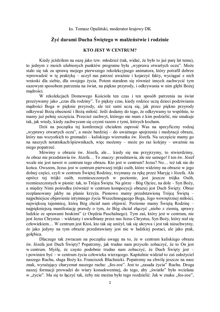 ks. Tomasz Opaliński, moderator krajowy DK Żyć darami Ducha Świętego w małżeństwie i rodzinie KTO JEST W CENTRUM? Kiedy jeździłem na oazę jako tzw. młodzież (tak, widać, że było to już parę lat temu), to jednym z moich ulubionych punktów programu była „wyprawa otwartych oczu”. Może stało się tak za sprawą mojego pierwszego rekolekcyjnego animatora, który potrafił dobrze wprowadzić w tę praktykę – uczył nas patrzeć uważnie i kojarzyć fakty, wyciągać z nich wnioski dla siebie, dla swojego życia. Potem starałem się również innych zachwycić tym oazowym sposobem patrzenia na świat, na piękno przyrody, i odkrywania w nim głębi Bożej mądrości. W rekolekcjach Domowego Kościoła ten czas i ten sposób patrzenia na świat przeżywamy jako „czas dla rodziny”. To piękny czas, kiedy rodzice uczą dzieci podziwiania mądrości Boga w pięknie przyrody, ale też sami uczą się, jak przez piękno przyrody odkrywać Bożą obecność i Bożą miłość. Jeśli dodamy do tego, że odkrywamy to wspólnie, to mamy już pełnię szczęścia. Przecież zachwyt, którego nie mam z kim podzielić, nie smakuje tak, jak wtedy, kiedy zachwycam się czymś razem z tymi, których kocham. Dziś na początku tej konferencji chciałem zaprosić Was na specyficzny rodzaj „wyprawy otwartych oczu”, a może bardziej – do uważnego spojrzenia i medytacji obrazu, który nas wszystkich to gromadzi – kaliskiego wizerunku św. Józefa. Na szczęście mamy go na naszych notatnikach/śpiewnikach, więc możemy – może po raz kolejny – uważnie na niego popatrzeć. Mówimy o obrazie św. Józefa, ale… kiedy się mu przyjrzymy, to stwierdzimy, że obraz nie przedstawia św. Józefa… To znaczy: przedstawia, ale nie samego! I ten św. Józef wcale nie jest nawet w centrum tego obrazu. Kto jest w centrum? Jezus? No… też tak nie do końca. Owszem, Jezus jest w centrum pierwszej trójki osób, które widzimy na obrazie w jego dolnej części, czyli w centrum Świętej Rodziny, trzymany za rękę przez Maryję i Józefa. Ale oprócz tej trójki osób, rozmieszczonych w poziomie, jest jeszcze trójka Osób, rozmieszczonych w pionie: tak, to Trójca Święta. Na górze – Bóg Ojciec, na dole – Syn Boży, a między Nimi pośrodku (również w centrum kompozycji obrazu) jest Duch Święty. Obraz rozplanowany jakby na planie krzyża. Pionowo mamy przedstawioną Trójcę Świętą – najpełniejsze objawienie intymnego życia Wszechmogącego Boga, Jego wewnętrznej miłości, największą tajemnicę, którą Bóg chciał nam objawić. Poziomo mamy Świętą Rodzinę – najpiękniejszą manifestację prawdy o tym, że Bóg chciał złączyć „niebo z ziemią, sprawy ludzkie ze sprawami boskimi” (z Orędzia Paschalnego). Tym zaś, który jest w centrum, nie jest Jezus Chrystus – widziany i uwielbiany przez nas Jezus Chrystus, Syn Boży, który stał się człowiekiem… W centrum jest Ktoś, kto tak się uniżył, tak się ukrywa i jest tak nieuchwytny, że jako jedyny na tym obrazie przedstawiany jest nie w ludzkiej postaci, ale jako ptak, gołębica. Dlaczego tak zwracam na początku uwagę na to, że w centrum kaliskiego obrazu św. Józefa jest Duch Święty? Popatrzmy, jak trudno nam przyszło zobaczyć, że to On jest w centrum. Myślę, że często podobnie trudno nam zobaczyć, że Duch Święty jest – i powinien być – w centrum życia człowieka wierzącego. Kapitalnie widział to zaś założyciel naszego Ruchu, sługa Boży ks. Franciszek Blachnicki. Popatrzmy na chwilę jeszcze na nasz znak, wyrażający charyzmat naszego ruchu: „fos-zoe”. Jest to „zasada życia” Ruchu. Droga naszej formacji prowadzi do wiary konsekwentnej, do tego, aby „światło” było wcielane w „życie”. Ma się to łączyć tak, żeby nie można było tego rozdzielić. Jak w znaku „fos-zoe”, 1 w którym słowa te splecione są w znak krzyża. Nie można ich rozdzielić, bo znak się rozsypie. Tym jednak, co łączy „światło” i „życie” jest litera „omega” – znak Ducha Świętego. To on łączy światło i życie. Bez Niego ta jedność jest niemożliwa. Ciągle musimy sobie to przypominać, i ciągle musimy przypominać sobie, Kim jest Duch Święty w Kościele, dostrzegać Jego obecność, i to obecność w jego centrum! Kiedy prześledzimy teksty liturgiczne, to zobaczymy, że jest On obecny nie tylko przy bierzmowaniu, ale że bez Niego nie dzieje się nic – od chrztu, przez sakrament pojednania i Eucharystię, aż po liturgię sakramentu święceń czy małżeństwa, a w końcu namaszczenie chorych. Tak samo w roku liturgicznym – Duch Święty jest w nim wspominany zawsze, a już szczególnie w czasie, który przeżywamy teraz – w pięćdziesiąt dni paschalnej radości: w tym właśnie okresie czytamy w liturgii słowa Dzieje Apostolskie – księgę, którą możemy nazwać dobrą nowiną o Bogu, działającym w swoim Kościele przez Ducha Świętego. Ks. Blachnicki zaplanował, by ten właśnie okres był szczególnie przeżywany w Ruchu Światło-Życie. Tu nie chodzi jedynie o trzeci „szczyt”, jakim w ramach formacji podstawowej Ruchu podczas każdego typu piętnastodniowej oazy jest Dzień Wspólnoty, kiedy na tle różańcowej tajemnicy Zesłania Ducha Świętego przeżywamy manifestację jedności Kościoła w Duchu Świętym; to również ułożenie całego roku formacyjnego zgodnie z tym, czym w liturgii żyje Kościół, i umiejscowienie w centrum „oazowego roku” Centralnej Oazy Matki – nie kiedy indziej, ale właśnie w dniu Zesłania Ducha Świętego. Będziemy to przeżywać już za dwa tygodnie. To jest nasz Wieczernik, w którym czekamy, aż zostaniemy „umocnieni Mocą z wysoka”. Stąd jesteśmy rozesłani. Bez Ducha Świętego nie mamy po co ruszać – ani do ewangelizacji, ani na rekolekcje, ani w naszą codzienność. I to ma się także realizować w naszej codzienności, w naszym życiu