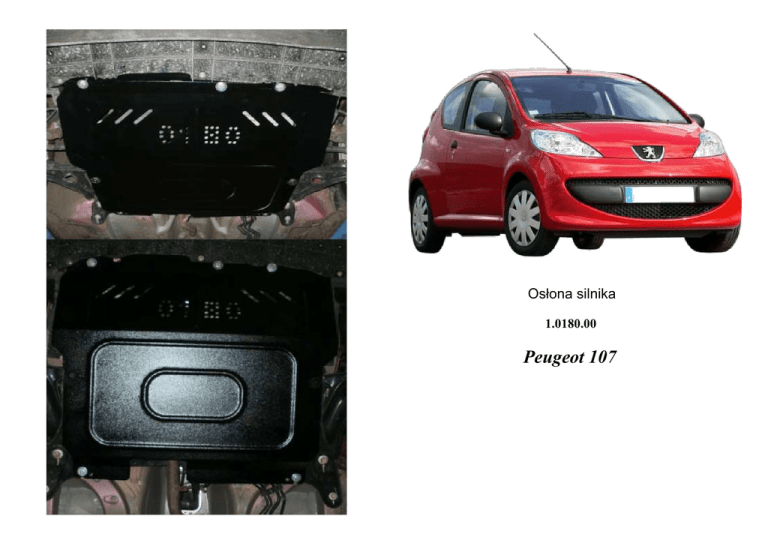 Osłona silnika 1.0180.00 Peugeot 107 Montaż osłony Osłona 1.0180.00 Stosowanie: Peugeot 107 Kompletność: L.p. 1 2 3 4 5 6 7 Nazwa Płyta Płyta Śruba Listwa Podkładka Podkładka Amortyzator Oznaczenie Ilość 213 690 М8х25 022 А8 А10 Uwagi 1 1 7 4 7 4 2 Schemat montażu osłony 2 6 Rys.1 3 4 5 1 3 4 5 1. Odkręcić zwykłe śruby przedniej osłony plastikowej ramy pomocniczej chłodnicy. 2. Zamontować płytę 1 między osłoną plastikową a ramą pomocniczą chłodnicy. Zamocować płytę 1 po bokach śrubami 3 przez listwy 4 i zwykłymi śrubami na zwykłe miejsca mocowania. 3. Położyć listwy 4 nad tylnymi otworami ramy podsilnikowej i wwiercić w nie śruby 3, rys 1. 4. Wprowadzić płytę 2 od tylnej strony wpustami pod śruby 3, od przodu do płyty 1 śrubami 2. 5. Dokręcić wszystkie miejsca mocowania.