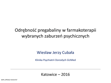 Odrębność pregabaliny w farmakoterapii wybranych zaburzeń psychicznych Wiesław Jerzy Cubała Klinika Psychiatrii Dorosłych GUMed Katowice – 2016 SAPL.GPGAZ.16.06.0727 Plan prezentacji Pregabalina • zaburzenie lękowe uogólniony • większe zaburzenie depresyjne – ból jako objaw rezydualny • uzależnienie od benzodiazepin ‘Neuroprzekaźniki lęku’ 5-HT GABA NE Lek Zakres dawek (mg/dobę) Stany lękowe Skuteczność # PD GAD SP SSRI citalopram escitalopram fluoksetyna fluwoksamina paroksetyna sertralina 10 - 40 10 - 20 10 - 60 50 - 300 20 - 60 50 - 200 +++ * +++ * +++ +++ +++ * +++ * + +++ * ++ +++ * +++ ++ +++ * ++ +++ +++ * +++ * duloksetyna wenlafaksyna 30 - 120 75 - 225 + +++ * +++ * +++ * ++ +++ * klomipramina doksepina 25 – 150 30 – 100 moklobemid Inne leki przeciwdepresyjne agomelatyna bupropion mirtazapina reboksetyna trazodon wortioksetyna Przeciwpadaczkowe gabapentyna pregabalina Atypowe leki przeciwpsychotyczne kwetiapina XR olanzapina Inne leki opipramol buspiron 150 - 600 SNRI TCA +++ + ++ * ++ * * RIMA 25 - 50 150 - 300 15 – 45 4 - 12 75 - 300 5 - 10 + ++ ++ + ++ ++ ++ 300 - 3600 75 - 600 +++ * 25 - 300 100 - 300 15 - 60 +++ ++ + + + ++ #w oparciu o przeglądy literatury, metaanalizy, zalecane standardy towarzystw międzynarodowych i zagranicznych *lek zarejestrowany w danym wskazaniu w Polsce ++ +++ +++ ++ * +++ * Landowski & Cubała 2015 Pregabalina Dawka początkowa 150mg/dobę Zakres dawek 150-600mg/dobę Optymalne dawkowanie 300-450mg/dobę T½ 6h → 2-3 dawki podzielone Komponenta somatyczna lęku Komponenta psychiczna lęku 150mg/dobę 300mg/dobę 450mg/dobę Nie wiąże się z białkami osocza Nie jest metabolizowana prze CYP450 Wydalana w postaci niezmienionej przez nerki Landowski & Cubała 2015 pregabalina = alprazolam > placebo w GAD tydzień HAM-A (pkt.) 0 1 2 EP 3 4 5 0 -2 -4 -6 -8 -10 -12 -14 -16 -18 PCB (n=85) PRE 300 mg/d (n=89) PRE 450mg/d (n=87) PRE 600mg/d (n=85) ALP 1.5mg/d (n=88) Średnia wyjściowa punktacja HAM-A = 25 Rickels i wsp. 2005 Objawy uboczne leków monoaminergicznych Landowski & Cubała 2015 Skuteczna farmakoterapia depresji • Brak remisji jest częsty w leczeniu depresji 35–45% remisja 10–20% odpowiedź i objawy rezydualne 15% częściowa odpowiedź 25% brak odpowiedzi 7–15% nietolerancja leczenia • Należy dążyć do pełnej remisji zaburzeń nastroju • Objawy rezydualne związane są z wyższym ryzkiem nawrotowości, chronicznym przebiegiem, skróceniem czasu remisji pomiędzy epizodami, utrzymującym się ryzkiem samobójstawa STAR*D Study Nierenberg i wsp. 1999 Fava i wsp. 1994 Papakostas 2009 cukrzyca CVD ból otyłość migrena depresja SPA zaburzenia osobowości zaburzenia odżywiania ADHD zaburzenia kontroli impulsów zaburzenia lękowe osteoporoza McIntyre i wsp. 2004 Objawy rezydualne a nawrotowość depresji *Item 13 (ogólne objawy somatyczne) HAM-D17. 100 76% % nawrowtów 80 60 40 20 94% ogólne objawy somatyczne* 25% 0 chorzy z objawami rezydualnymi chorzy bez objawów rezydualnych Paykel i wsp. 1995 Względna oporność na leczenie w depresji emocjonalne 1.4 N=573 1.2 Obniżenie nastroju Tonus hedodynamiczny ES 0.8 somatyczne poprawa 1.0 0.6 0.4 Bez objawów bólowych Z objawami bólowymi 0.2 0 BAS 1M 3M 6M 9M ARTIST=A Randomized Trial Investigating SSRI Treatment. Greco i wsp. 2004 Objawy rezydualne depresji niepełna remisja/remisja z objawami rezydulanymi optymalizacja dawki ból, jako objaw somatyczny: augumentacja pregabaliną/zmiana na lek SNRI augmentacja/zmiana męczliwość: augumentacja bupropion lub modafinil STAR*D Study Fava i wsp. 1994 Stahl 1997 Papakostas 2009 Ból jako objaw somatyczny depresji • Objawy somatyczne depresji w dużum stopniu determinują oporność na leczenie oraz zwiększają nawrotowość • Ból, obok anergii i ociężałości, jest częsty w depresji i jako objaw występuje u 30-60% chorych Bair i wsp. 2003 Greco i wsp. 2004 McIntyre i wsp. 2004 Zaburzenie lękowe uogólnione a benzodiazepiny • 8-21% pacjentów z używaniem szkodliwym/uzależnieniem SPA spełnia kryteria GAD • Trudności w diagnostyce różnicowej Benzodiazepiny • Skuteczność od początku stosowania • 2/3 wszystkich preskrypcji spośród leków psychotropowych • W użyciu około 50 substancji • Maksymalny efekt terapeutyczny następuje w ciągu trzech tygodni • Skuteczność terapeutyczna benzodiazepin utrzymuje przez długi czas Dell’osso & Lader 2013 Landowski & Cubała 2015 Pregabalina a uzależnienie od benzodiazepin • Monoterapia z użyciem pregabaliny w zakresie dawek 150600mg/d jest skuteczna i bezpieczna w farmakoterapii uzależnienia od benzodiazepin, również u chorych z GAD. • Lek nie ma zastosowania w terapii zespołów abstynencyjnych. • Pregabalina stosowana w farmakoterapii uzależnienia od benzodiazepin (średnia dawka 315mg/d) istotnie redukuje subiektywną symptomatologię w obszarze zaburzeń snu oraz redukuje nasilenie objawów psychicznych i somatycznych lęku. Rubio i wsp. 2011 Oulis & Konstantakopoulos 2012 Dziękuję za uwagę