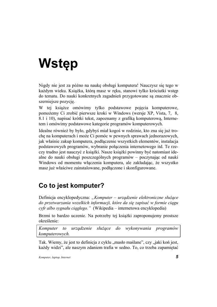 Wstęp Nigdy nie jest za późno na naukę obsługi komputera! Nauczysz się tego w każdym wieku. Książka, którą masz w ręku, stanowi tylko króciutki wstęp do tematu. Do nauki konkretnych zagadnień przygotowane są znacznie obszerniejsze pozycję. W tej książce omówimy tylko podstawowe pojęcia komputerowe, pomożemy Ci zrobić pierwsze kroki w Windows (wersje XP, Vista, 7, 8, 8.1 i 10), napisać krótki tekst, zapoznamy z grafiką komputerową, Internetem i omówimy podstawowe kategorie programów komputerowych. Idealne również by było, gdybyś miał kogoś w rodzinie, kto zna się już trochę na komputerach i może Ci pomóc w pewnych sprawach jednorazowych, jak właśnie zakup komputera, podłączenie wszystkich elementów, instalacja podstawowych programów, wybranie połączenia internetowego itd. Te rzeczy trudno jest nauczyć z książki. Nasze książki powinny być natomiast idealne do nauki obsługi poszczególnych programów – poczynając od nauki Windows od momentu włączenia komputera, ale zakładając, że wszystko masz już właściwe zainstalowane, podłączone i skonfigurowane. Co to jest komputer? Definicja encyklopedyczna: „Komputer – urządzenie elektroniczne służące do przetwarzania wszelkich informacji, które da się zapisać w formie ciągu cyfr albo sygnału ciągłego.” (Wikipedia – internetowa encyklopedia) Brzmi to bardzo uczenie. Na potrzeby tej książki zaproponujemy prostsze określenie: Komputer to urządzenie komputerowych. służące do wykonywania programów Tak. Wiemy, że jest to definicja z cyklu „masło maślane”, czy „jaki koń jest, każdy widzi”, ale naszym zdaniem trafia w sedno. To, co trzeba zapamiętać Komputer, laptop, Internet 5 i zrozumieć, to to, że nie ma czegoś takiego jak „praca na komputerze”, tylko wykonywanie konkretnych programów komputerowych. Na przykład, (to, co ja teraz robię) pisanie książki na komputerze (przy użyciu programu do pisania tekstu, tzw. edytora tekstu, w moim wypadku MS Word). Albo zaprojektowanie okładki do tej książki (program do projektowania grafiki – np. CorelDraw). Albo przeglądanie wyników meczów piłkarskich w Internecie (przeglądarka stron WWW – np. Internet Explorer). Co jest istotne, to to, że wszystkie te programy i tysiące innych programów, działają na tym samym urządzeniu jakim jest komputer. To tak jakby samochód poza jazdą po szosie potrafił jeszcze latać, kosić trawnik i malować ściany. Oczywiście, umiejętności komputera ograniczają się do operowania na informacjach (jak to widzieliśmy w definicji encyklopedycznej). Nie potrafi on zaparzyć kawy, ale za jego pomocą możemy znaleźć w sieci komputerowej, jaką jest Internet, tysiące przepisów do parzenia kawy. Wcale zresztą nie będę zdziwiony, jeśli na rynku pokażą się ekspresy do kawy sterowane komputerowo (a może już się ukazały?). Wtedy, po podłączeniu tego ekspresu do komputera i zainstalowaniu na nim programu do sterowania takim ekspresem, można będzie powiedzieć, że komputer zaparzy kawę, choć naprawdę, to przekaże do ekspresu informacje, czy, kiedy i jak ma to zrobić. Podobnie nie możemy się nauczyć „obsługi komputera”. Obsługa komputera ogranicza się właściwie do naciśnięcia przycisku zasilania. Dalej komputer zaczyna – najpierw automatycznie – wykonywać programy komputerowe. Doprowadza to zwykle do uruchomienia najbardziej istotnego programu – systemu operacyjnego, którym obecnie na większości komputerów na świecie jest któraś wersja Windows. Użytkownik musi się więc najpierw nauczyć obsługi systemu operacyjnego (Windows), bo za jego pośrednictwem powie komputerowi, co dalej chce robić na komputerze – jaki program użytkowy wykonać. Dalej musi się nauczyć tych programów, które chce używać (np. do przeglądania Internetu, pisania i wysyłania poczty elektronicznej, pisania tekstów, grania w gry komputerowe itd. itp.). System operacyjny (najczęściej Windows) kupuje się zwykle razem z komputerem i sprzedawca komputera go już nam instaluje i przygotowuje do pracy. Razem z Windows dostajemy kilkanaście podstawowych i najprostszych programów użytkowych. Bardziej skomplikowane i specjalistyczne 6 Komputer, laptop, Internet programy trzeba już sobie oddzielnie dokupić i zainstalować (choć jest również wiele programów oferowanych za darmo w Internecie). Historia – era du ych komputerów Za pierwszy komputer uważa się urządzenie o nazwie ENIAC skonstruowane w Stanach Zjednoczonych w 1946 roku. Wkrótce przemysł komputerowy zaczął się szybko rozwijać za sprawą głównie firmy IBM, która została światowym liderem w tej dziedzinie. Komputery w latach 50-tych i 60-tych XX wieku były ogromnymi urządzeniami zajmującymi często całe, specjalnie przygotowane pomieszczenie. Obsługiwali je wyłącznie profesjonalni informatycy. Głównymi klientami przemysłu komputerowego były wielkie przedsiębiorstwa (gdzie stosowano je głównie do szeroko pojętej księgowości – w tym prowadzenia kartotek magazynowych, przygotowania list płac itd.), armia i uniwersytety. Pierwsze komputery osobiste Rozwój elektroniki a szczególnie miniaturyzacja obwodów elektronicznych – wynalezienie tranzystorów a następnie mikroprocesorów uczynił możliwym skonstruowanie komputera osobistego – małego urządzenia, które może leżeć na biurku w domu lub biurze i być obsługiwane przez zwykłego użytkownika bez wykształcenia informatycznego. Pierwsze takie komputery osobiste, nazywane także często mikrokomputerami pokazały się w latach 70-tych. Przełomem było włączenie się do wyścigu mikrokomputerowego potężnego koncernu IBM, który w roku 1981 zaoferował komputer osobisty IBM PC. Komputery IBM PC pracowały wtedy pod kontrolą systemu operacyjnego DOS, stworzonego przez małą wtedy jeszcze i nieznaną firmę programistyczną Microsoft. System DOS był znacznie trudni