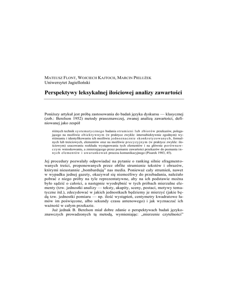 MATEUSZ FLONT, WOJCIECH KAJTOCH, MARCIN PIELUŻEK Uniwersytet Jagielloński Perspektywy leksykalnej ilościowej analizy zawartości Poniższy artykuł jest próbą zastosowania do badań języka dyskursu — klasycznej (zob.: Berelson 1952) metody prasoznawczej, zwanej analizą zawartości, definiowanej jako zespół różnych technik s y s t e m a t y c z n e g o badania s t r u m i e n i l u b z b i o r ó w przekazów, polegającego na możliwie o b i e k t y w n y m (w praktyce zwykle: intersubiektywnie zgodnym) wyróżnianiu i identyfikowaniu ich możliwie j e d n o z n a c z n i e s k o n k r e t y z o w a n y c h , formalnych lub treściowych, elementów oraz na możliwie p r e c y z y j n y m (w praktyce zwykle: ilościowym) szacowaniu rozkładu występowania tych elementów i na głównie p o r ó w n a w c z y m wnioskowaniu, a zmierzającego przez poznanie zawartości przekazów do poznania i n n y c h e l e m e n t ó w i u w a r u n k o w a ń procesu komunikacyjnego (Pisarek 1983, 45). Jej procedury pozwalały odpowiadać na pytanie o ranking silnie sfragment owanych treści, proponowanych przez obfite strumienie tekstów i obrazów, którymi nieustannie „bombardują” nas media. Ponieważ cały strumień, nawet w wypadku jednej gazety, okazywał się niemożliwy do przebadania, należało pobrać z niego próby na tyle reprezentatywne, aby na ich podstawie można było sądzić o całości, a następnie wyodrębnić w tych próbach mierzalne elementy (tzw. jednostki analizy — teksty, akapity, sceny, postaci, motywy tematyczne itd.), zdecydować w jakich jednostkach będziemy je mierzyć (jakie będą tzw. jednostki pomiaru — np. ilość wystąpień, centymetry kwadratowe łamów im poświęcone, albo sekundy czasu antenowego) i jak wyznaczać ich ważność w całym przekazie. Już jednak B. Berelson miał dobre zdanie o perspektywach badań językoznawczych prowadzonych tą metodą, wymieniając: „mierzenie czytelności” (1970, 22) (w polskiej praktyce badawczej mierzenie: „zrozumiałości języka tekstu”, „trudności językowej” (Pisarek 2007; 2007a); „wykrywanie cech stylistycznych” (Berelson 1970, 24); „zastosowanie analizy ilościowej do [badań] stylu literackiego” (tamże). W tego rodzaju przedsięwzięciach jednostkami analizy byłyby całe, reprezentujące dane rodzaje czy grupy tekstów, korpusy słowne, a pomiar dotyczyłby ilości wystąpień danej cechy, tożsamej z ilością wystąpień leksemów, będących zazwyczaj nośnikami tej cechy. I tak Pisarek (2002, 199 i n.) proponuje mierzyć zrozumiałość (czy raczej niezrozumiałość) tekstu m. in. ilością wystąpień w nim wyrazów trudnych (abstrakcyjnych, długich, obcych itd.). Na tej zasadzie o natężeniu emocjonalności decydowałaby ilość wystąpień słowoform uważanych za ekspresywne, o stopniu dyrektywności — ilość wystąpień określonych modulantów i w ogóle leksemów wskazujących na przymus czy konieczność czegoś, etc.. Już prosty pomiar ilości użyć poszczególnych części mowy dawał także pojęcie o różnicach stylistycznych między tekstami, będącymi realizacjami poszczególnych gatunków dziennikarskich, a pomiary mogły być przecież bardziej skomplikowane (Pisarek 1972). Rodzaje językowych badań ilościowych omówiono w innym miejscu (Kajtoch 2008, 24 i n.). Artykuł poniekąd przypomni te techniki, wskaże jednak jeszcze na to, że ilościowa analiza zawartości, a konkretnie jedna z jej odmian: ilościowa leksykalna analiza zawartości może mieć zastosowanie do badań nie tylko stylistycznych konwencji, ale i zdolności danego, rozumianego językoznawczo (Bartmiński/Niebrzegowska-Bartmińska 2009, 32) dyskursu do przedstawiania określonych interpretacji rzeczywistości, określonych treści. *** Dyskurs to utrwalony sposób używania języka w określonych sytuacjach i grupach tekstów. Sugeruje istnienie swoistych cech rzeczywistości, do której się odnosi, ponieważ użycie pewnych środków językowych w danym celu sensowne jest, jeśli odbywa się w świecie o określonych stosunkach społecznych, cechach przyrody i cywilizacji — np. obraza: ciemny chamie (a nie ciemny panie) ma sens w społeczeństwie pamiętającym podziały klasowe, nazwanie kogoś podstępnym wężem byłoby niemożliwe w języku Eskimosów, bo węże w lodach nie żyją. Przedmiotem naszej porównawczej refleksji są cztery współczesne polskie dyskursy, których cech poszukaliśmy w korpusach (po 30000 słowoform) złożonych z tekstów portalu „Pudelek. Sensacja, plotka, komentarz” (www.pudelek.pl) — dalej PUD, wyboru fanzinów faszystowskich przełomu XX i XXI wieku (np. „Aryjski Opór”, „Blood&Honor”, „Ofensywa”, „Rzeźnia”, „White Empire”) — dalej FF, najważniejszego polskiego fanzina punkowego „Pasażer” (P) oraz zebranych przez M. Pyrek tekstów piosenek rockowych, wykonywanych oficjalnie lub poza cenzurą w latach osiemdziesiątych XX w. (PR). Chodzi o korpusy tekstów typu: 130 We wszystkich pozytywnych opiniach podnoszony jest fakt, że udało nam się wokół antyrasistowskiego sprzeciwu zgromadzić tak różnych światopoglądowo wykonawców: anarchistów, integralnych katolików, obrazoburczych prześmiewców, rockowych poetów, punkrockowych publicystów, czołówkę niezależnych i gwiazdy rocka. [...] Natomiast niemiłą niespodzianką były głosy negujące sens takiego doboru wykonawców. [...] To dziwne jak wielu wolnościowców grzeszy nietolerancją i brakiem poszanowania dla cudzej odmienności, choć będącej często udziałem dużej części społeczeństwa, samemu jednocześnie żądając absolutnej akceptacji dla własnych nie raz ekskluzywnych pomysłów na życie. [P] Uważam, że Edyta Górniak bardzo dobrze zrobiła, że nie zgodziła się na bycie jurorem w tym samym programie, w którym jurorem jest Doda — twierdzi. Edyta Górniak to jest zupełnie inny poziom, inna klasa, inna wie
