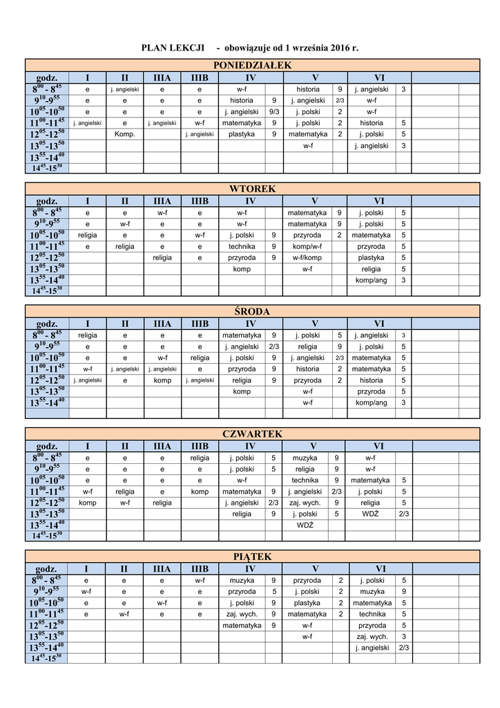 - obowiązuje od 1 września 2016 r. PLAN LEKCJI PONIEDZIAŁEK godz. 800 - 845 910-955 1005-1050 1100-1145 1205-1250 1305-1350 1355-1440 I II IIIA IIIB e j. angielski e e w-f e e e e historia e e e e j. angielski e j. angielski Komp. IV V VI historia 9 j. angielski 9 j. angielski 2/3 w-f j. angielski 9/3 j. polski 2 w-f w-f matematyka 9 j. polski 2 historia 5 j. angielski plastyka 9 matematyka 2 j. polski 5 j. angielski 3 w-f 3 1445-1530 WTOREK godz. 800 - 845 910-955 1005-1050 1100-1145 1205-1250 1305-1350 1355-1440 45 14 -15 I II IIIA IIIB IV V e e w-f e w-f matematyka 9 j. polski 5 e w-f e e w-f matematyka 9 j. polski 5 religia e e w-f j. polski 9 przyroda 2 matematyka 5 e religia e e technika 9 komp/w-f przyroda 5 religia e przyroda 9 w-f/komp plastyka 5 w-f religia 5 komp/ang 3 komp VI 30 ŚRODA godz. 800 - 845 910-955 1005-1050 1100-1145 1205-1250 1305-1350 1355-1440 I II IIIA IIIB IV V religia e e e matematyka 9 j. polski 5 j. angielski 3 e e e e j. angielski 2/3 religia 9 j. polski 5 e e w-f religia j. polski 9 j. angielski 2/3 matematyka 5 w-f j. angielski j. angielski e przyroda 9 historia 2 matematyka 5 j. angielski e komp j. angielski religia 9 przyroda 2 historia 5 w-f przyroda 5 w-f komp/ang 3 komp VI CZWARTEK godz. 800 - 845 910-955 1005-1050 1100-1145 1205-1250 1305-1350 1355-1440 45 14 -15 I II IIIA IIIB IV V VI e e e religia j. polski 5 muzyka 9 w-f e e e e j. polski 5 religia 9 w-f e e e e w-f technika 9 matematyka 5 w-f religia e komp matematyka 9 j. angielski 2/3 j. polski 5 komp w-f religia j. angielski 2/3 zaj. wych. 9 religia 5 religia 9 j. polski 5 WDŻ 2/3 WDŻ 30 PIĄTEK godz. 800 - 845 910-955 1005-1050 1100-1145 1205-1250 1305-1350 1355-1440 45 14 -15 30 I II IIIA IIIB e e e w-f muzyka 9 przyroda 2 j. polski 5 w-f e e e przyroda 5 j. polski 2 muzyka 9 e e w-f e j. polski 9 plastyka 2 matematyka 5 e w-f e e zaj. wych. 9 matematyka 2 technika 5 matematyka 9 w-f przyroda 5 w-f zaj. wych. 3 j. angielski 2/3 HHhhhH k IV V VI