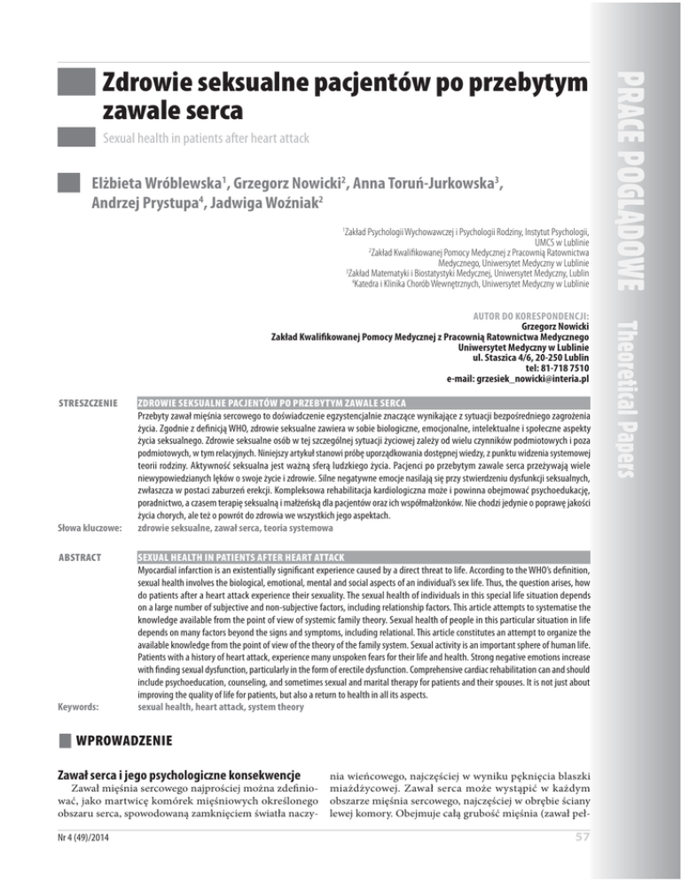Zdrowie seksualne pacjentów po przebytym zawale serca Sexual health in patients after heart attack Elżbieta Wróblewska1, Grzegorz Nowicki2, Anna Toruń-Jurkowska3, Andrzej Prystupa4, Jadwiga Woźniak2 1 Zakład Psychologii Wychowawczej i Psychologii Rodziny, Instytut Psychologii, UMCS w Lublinie 2 Zakład Kwalifikowanej Pomocy Medycznej z Pracownią Ratownictwa Medycznego, Uniwersytet Medyczny w Lublinie 3 Zakład Matematyki i Biostatystyki Medycznej, Uniwersytet Medyczny, Lublin 4 Katedra i Klinika Chorób Wewnętrznych, Uniwersytet Medyczny w Lublinie AUTOR DO KORESPONDENCJI: Grzegorz Nowicki Zakład Kwalifikowanej Pomocy Medycznej z Pracownią Ratownictwa Medycznego Uniwersytet Medyczny w Lublinie ul. Staszica 4/6, 20-250 Lublin tel: 81-718 7510 e-mail: [email protected] STRESZCZENIE Słowa kluczowe: ABSTRACT Keywords: ZDROWIE SEKSUALNE PACJENTÓW PO PRZEBYTYM ZAWALE SERCA Przebyty zawał mięśnia sercowego to doświadczenie egzystencjalnie znaczące wynikające z sytuacji bezpośredniego zagrożenia życia. Zgodnie z definicją WHO, zdrowie seksualne zawiera w sobie biologiczne, emocjonalne, intelektualne i społeczne aspekty życia seksualnego. Zdrowie seksualne osób w tej szczególnej sytuacji życiowej zależy od wielu czynników podmiotowych i poza podmiotowych, w tym relacyjnych. Niniejszy artykuł stanowi próbę uporządkowania dostępnej wiedzy, z punktu widzenia systemowej teorii rodziny. Aktywność seksualna jest ważną sferą ludzkiego życia. Pacjenci po przebytym zawale serca przeżywają wiele niewypowiedzianych lęków o swoje życie i zdrowie. Silne negatywne emocje nasilają się przy stwierdzeniu dysfunkcji seksualnych, zwłaszcza w postaci zaburzeń erekcji. Kompleksowa rehabilitacja kardiologiczna może i powinna obejmować psychoedukację, poradnictwo, a czasem terapię seksualną i małżeńską dla pacjentów oraz ich współmałżonków. Nie chodzi jedynie o poprawę jakości życia chorych, ale też o powrót do zdrowia we wszystkich jego aspektach. zdrowie seksualne, zawał serca, teoria systemowa SEXUAL HEALTH IN PATIENTS AFTER HEART ATTACK Myocardial infarction is an existentially significant experience caused by a direct threat to life. According to the WHO’s definition, sexual health involves the biological, emotional, mental and social aspects of an individual’s sex life. Thus, the question arises, how do patients after a heart attack experience their sexuality. The sexual health of individuals in this special life situation depends on a large number of subjective and non-subjective factors, including relationship factors. This article attempts to systematise the knowledge available from the point of view of systemic family theory. Sexual health of people in this particular situation in life depends on many factors beyond the signs and symptoms, including relational. This article constitutes an attempt to organize the available knowledge from the point of view of the theory of the family system. Sexual activity is an important sphere of human life. Patients with a history of heart attack, experience many unspoken fears for their life and health. Strong negative emotions increase with finding sexual dysfunction, particularly in the form of erectile dysfunction. Comprehensive cardiac rehabilitation can and should include psychoeducation, counseling, and sometimes sexual and marital therapy for patients and their spouses. It is not just about improving the quality of life for patients, but also a return to health in all its aspects. sexual health, heart attack, system theory WPROWADZENIE Zawał serca i jego psychologiczne konsekwencje Zawał mięśnia sercowego najprościej można zdefiniować, jako martwicę komórek mięśniowych określonego obszaru serca, spowodowaną zamknięciem światła naczyNr 4 (49)/2014 nia wieńcowego, najczęściej w wyniku pęknięcia blaszki miażdżycowej. Zawał serca może wystąpić w każdym obszarze mięśnia sercowego, najczęściej w obrębie ściany lewej komory. Obejmuje całą grubość mięśnia (zawał peł- 57 Zdrowie seksualne pacjentów po przebytym zawale serca nościenny), albo warstwę podwsierdziową (zawał niepełnościenny). W Polsce dotyka pięćdziesięciu tysięcy osób rocznie. Ponad 90% zawałów mięśnia sercowego spowodowanych jest całkowitym zamknięciem światła tętnicy wieńcowej przez zakrzep, powstały w wyniku pęknięcia blaszki miażdżycowej zwężającej tętnicę [1]. Wyniki szeroko zakrojonych badań epidemiologicznych wskazują, że sześć podstawowych czynników ryzyka (hiperlipidemia, palenie papierosów, nadciśnienie, cukrzyca, otyłość brzuszna i czynniki psycho-socjalne) oraz trzy tzw. czynniki kardioprotekcyjne (niskie spożycie warzyw i owoców, wysokie spożycie alkoholu oraz nieregularna aktywność fizyczna) odpowiadało za 90% zachorowań na zawał serca wśród mężczyzn i 94% zachorowań wśród kobiet. Zależność ta wystąpiła we wszystkich regionach świata i bez względu na wiek [2]. Skutki zawału serca pacjent odczuwa nie tylko w postaci zagrożenia biologicznego (możliwość utraty życia lub zdrowia), ale również psychologicznego i społecznego. Zawał jest silnym stresorem ze względu na nagły początek i deprywację wielu potrzeb psychicznych, zwłaszcza bezpieczeństwa, akceptacji, szacunku, samorealizacji, itp. Wiąże się z zagrożeniem utraty pracy, pozycji w rodzinie i w grupie przyjaciół, obniżeniem stopy życiowej. Zawał pociąga za sobą wiele zmian w życiu chorego i jego rodziny, a zwłaszcza w diadzie małżeńskiej. Zmiany te mają charakter silnego stresora dla całego systemu rodzinnego [3]. Mężczyźni po zawale częściej cechują się zewnętrznym umiejscowieniem kontroli zdrowia, czyli przekonaniem, że ich stan zdrowia zależy od czynników zewnętrznych. W związku z tym gorzej radzą sobie ze stresem, negują objawy choroby i pomniejszają znaczenie przestrzegania zaleceń medycznych [4]. Znaczny odsetek pac